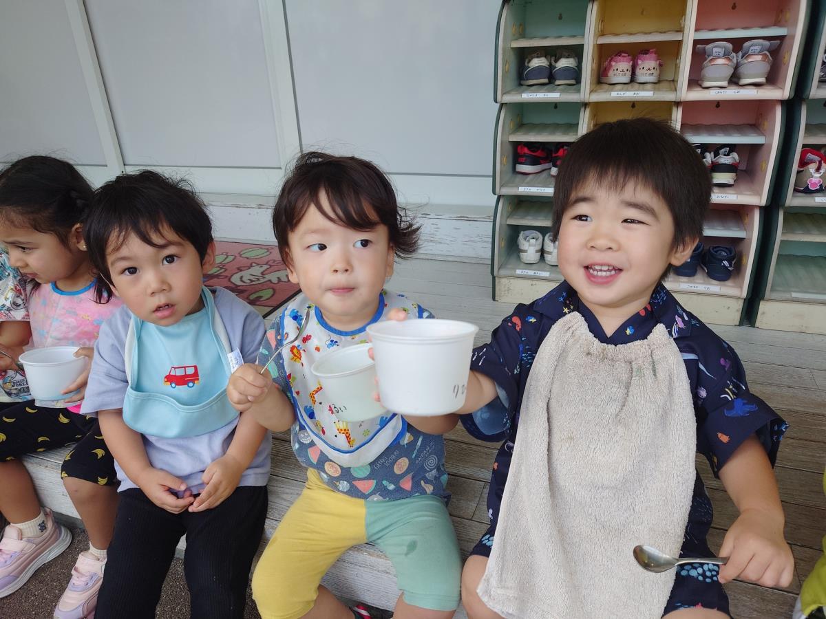 今日は園庭で遊びました。暑い日になったので、お友だちと「暑いねぇ」と言っていたり、石の所を触ったり座ったりしながら「お尻が焼けちゃう」とお話している姿が可愛かったです♡お部屋に帰ってからはたっぷり水分補給をしました。