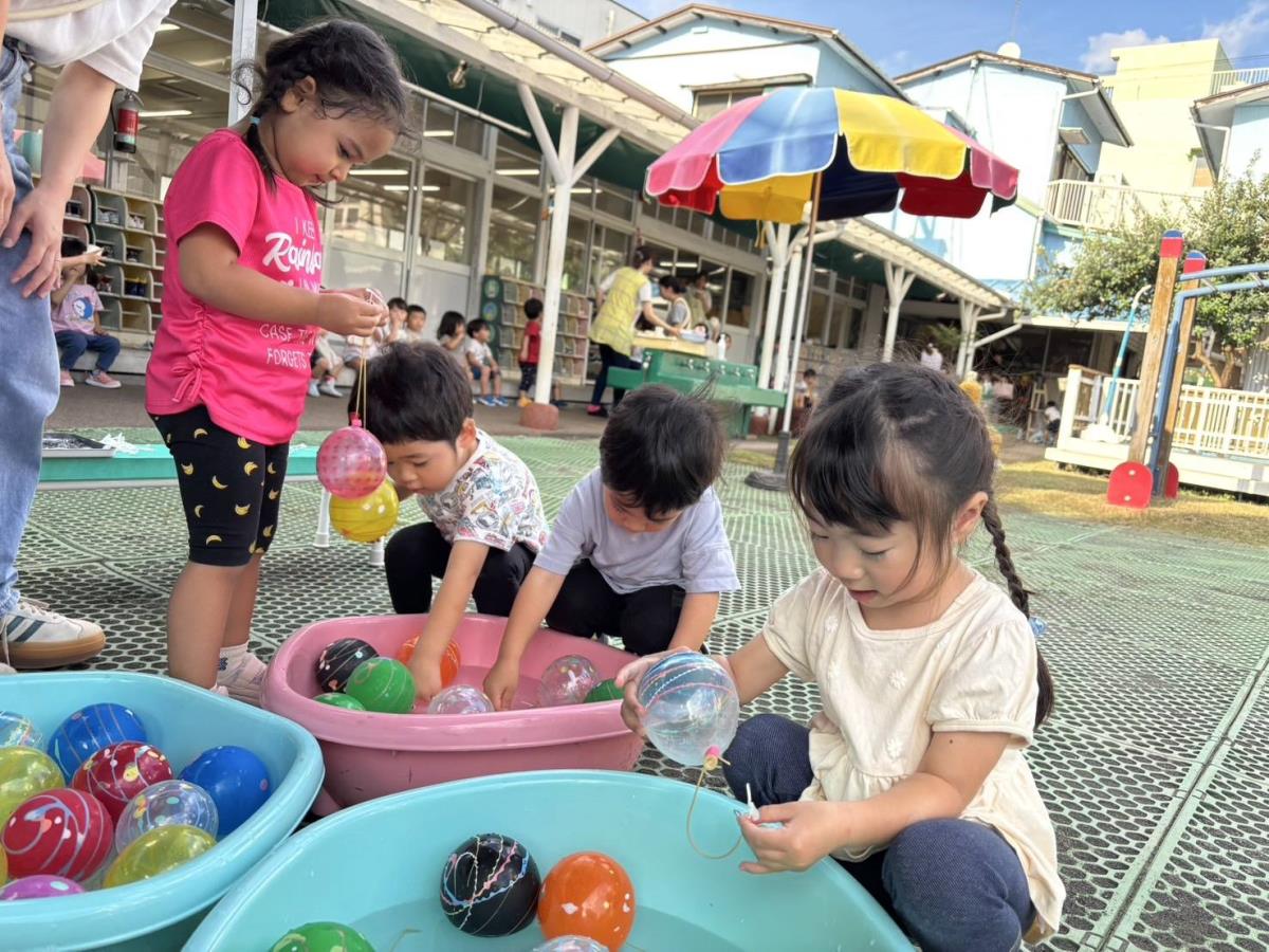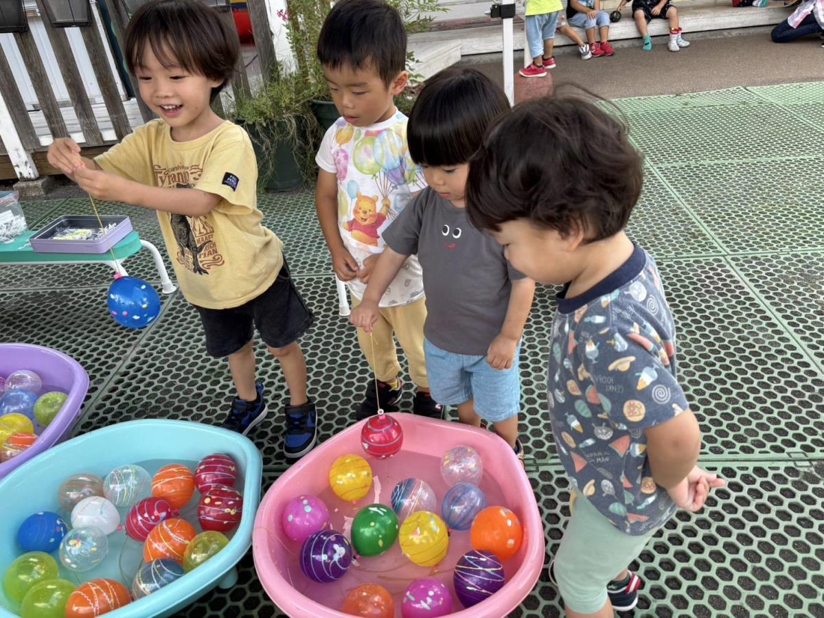 今日は午前中は制作やブロック、パズルで遊びました。午後は秋祭りに参加しました。朝からお祭りの話を聞いてワクワクが抑えられないあか組さん。「かき氷食べたーい!」「青いのがいい〜」などお話しする子の姿もありました。かき氷やポテトを食べて、ヨーヨーももらってとても楽しんでいました。 |