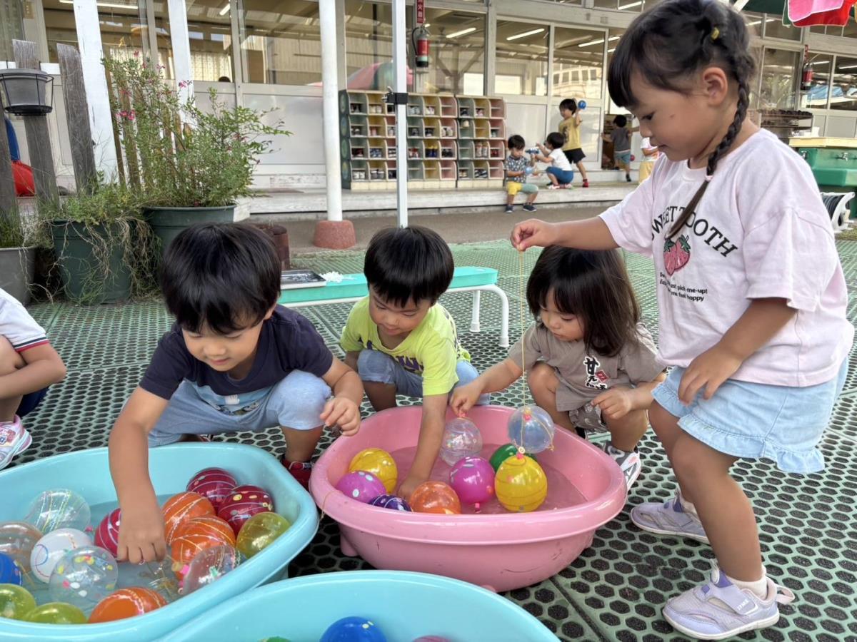 今日は大きいプールで水遊びをしました。「お水冷た~い!」「気持ちいい〜」と言いながら汽車ごっこやワニさん泳ぎ、ビート板や水遊びのおもちゃで沢山体を動かして遊びました。 |
