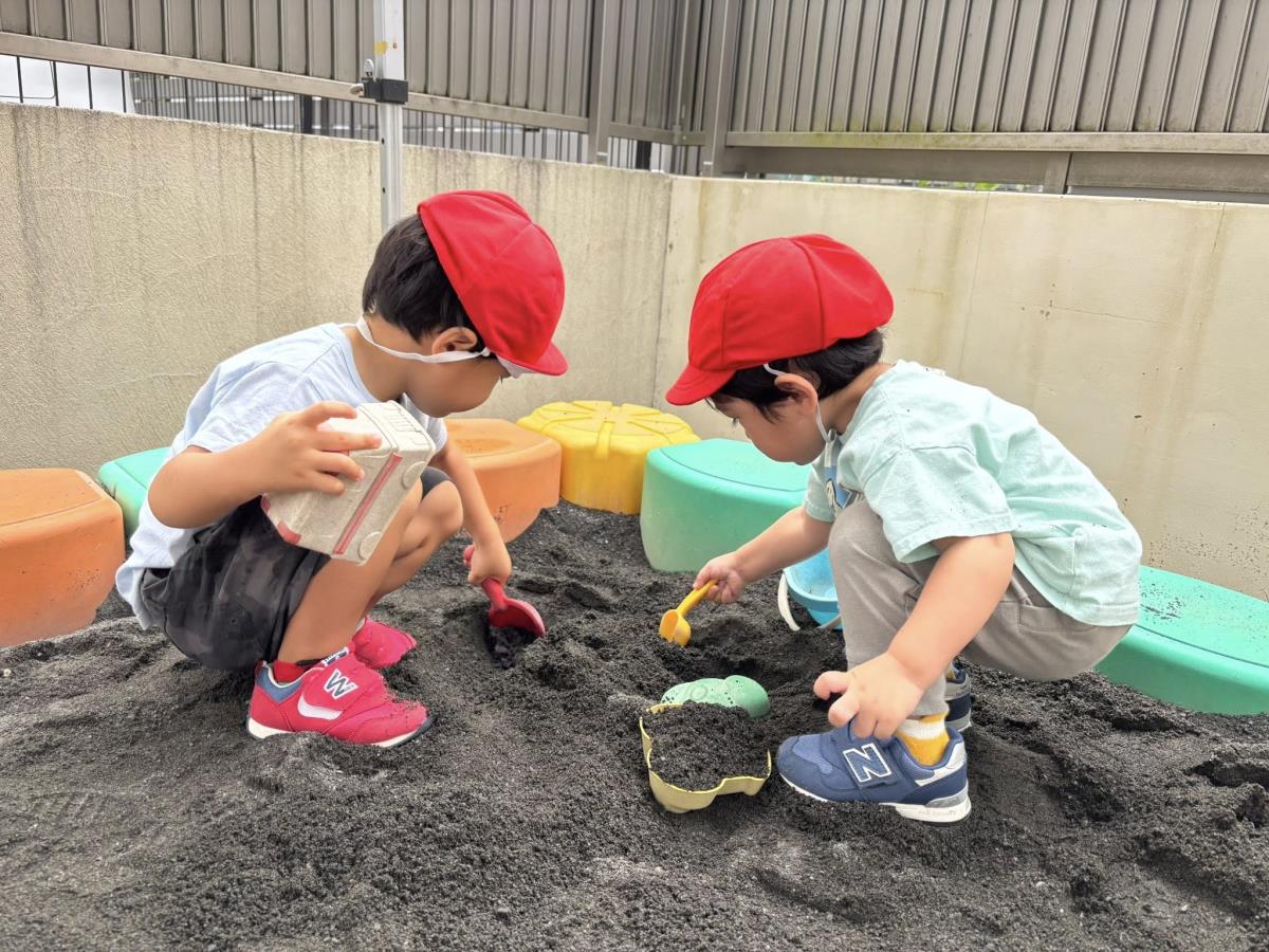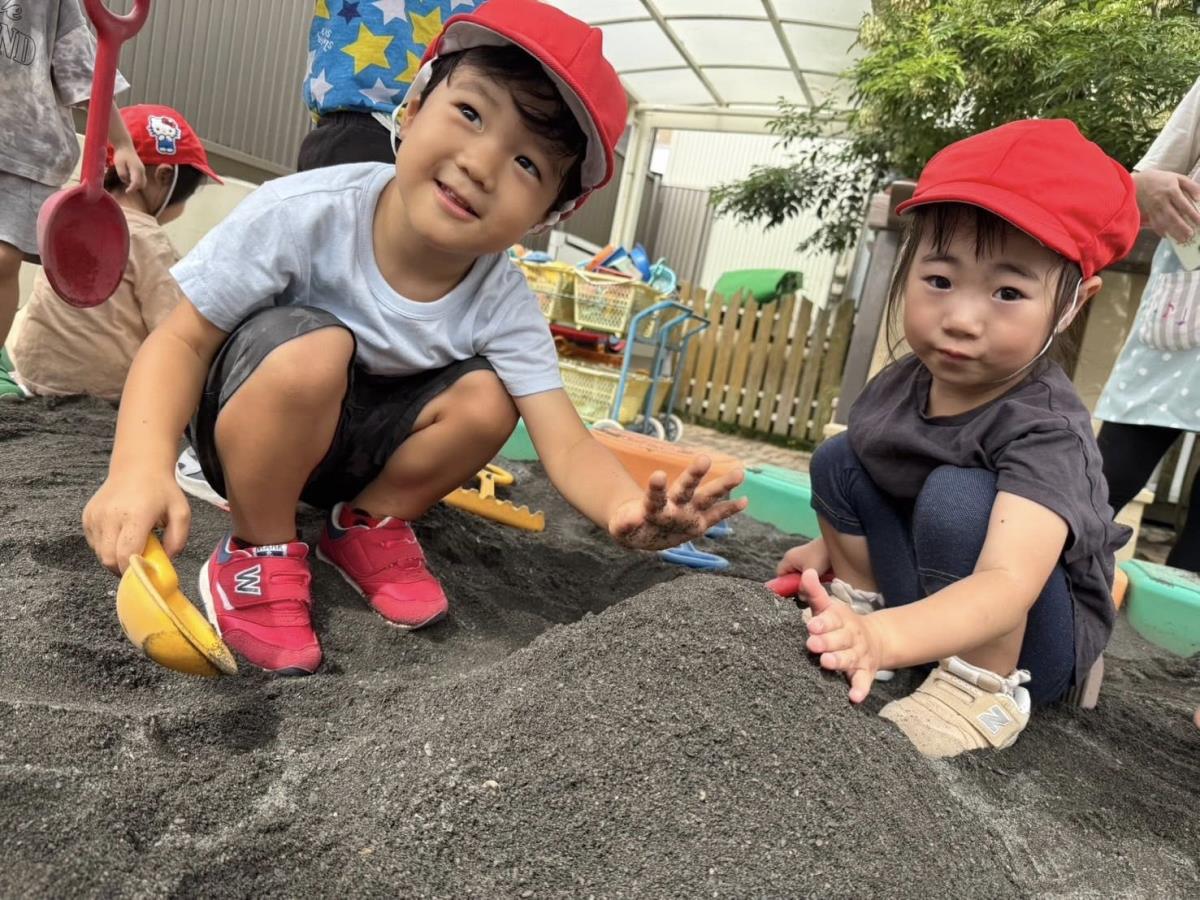 今日は園庭であそびました。お砂場でお友達とお山を作ったり手押し車にお友達を乗せて遊具ののまわりをドライブしたり、気の合うお友達と楽しそうに遊んでいました。