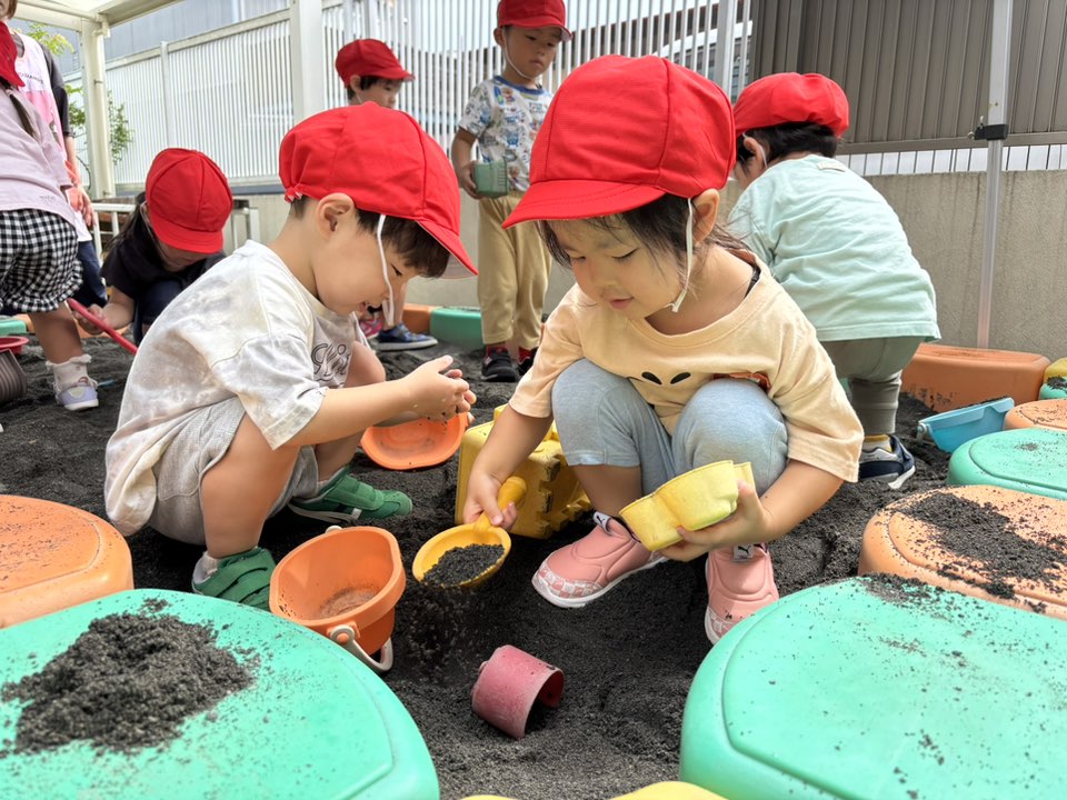 今日は園庭で遊びました。今日も中学生のお姉さんがあか組さんに入ってくれました。お姉さんと一緒に遊びたいお友だちは手を繋いで「こっち」と誘って遊んでもらっていました。お姉さんと一緒にお砂をふるいにかけて楽しんでいるお友だちがたくさんいました!