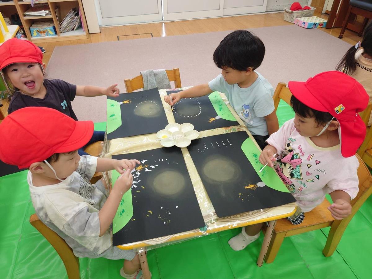 今日は、制作やBブロック、木製玩具で遊びました。制作では星のスタンプやスパッタリングで星空を描きました。特に星のスタンプにはどの子も夢中で、星のスタンプを何個もペタペタと押し、どんどんと星空が出来上がっていくのを満足げな様子で見ていました。 |