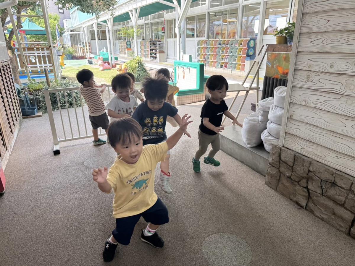 今日は月刊誌を見た後に園庭で遊びました。月刊誌では新幹線、ネコ、パンケーキと自分のお気に入りのページを見つけてお友だちと見せ合って楽しんでいました。園庭では滑り台の上から「おーい」と手を振ってニコニコです♪今日も午後のおやつ後園庭で遊んでいます。 |