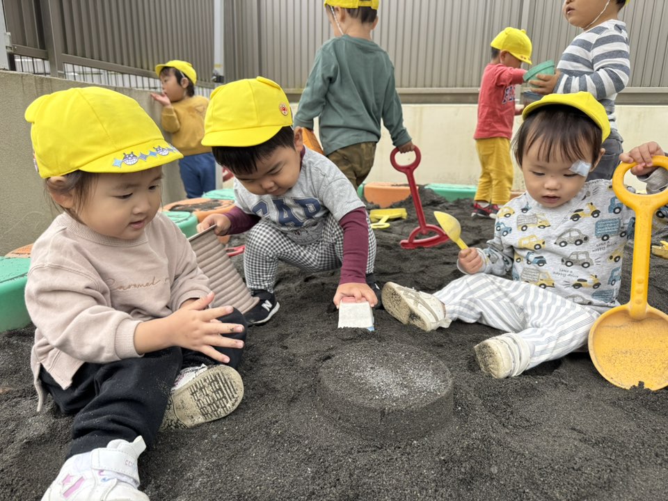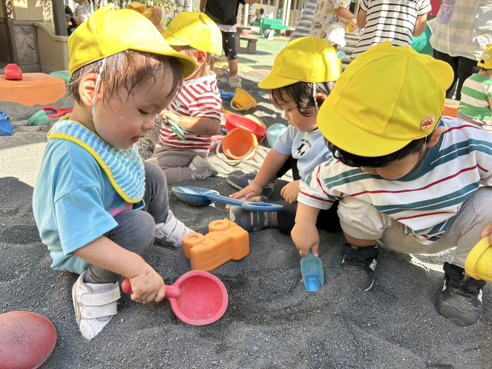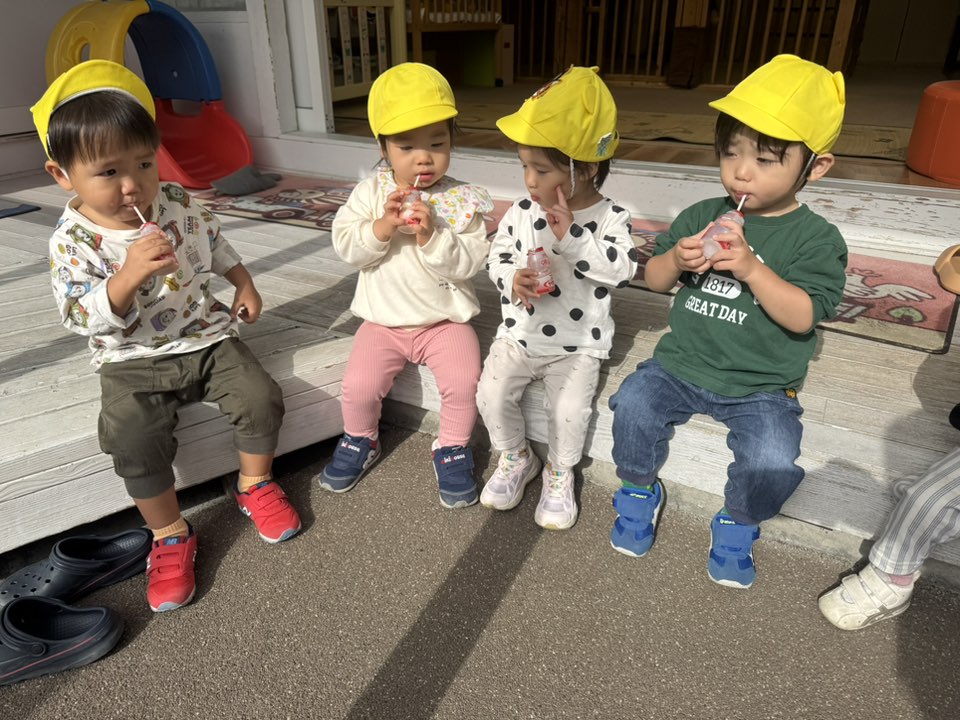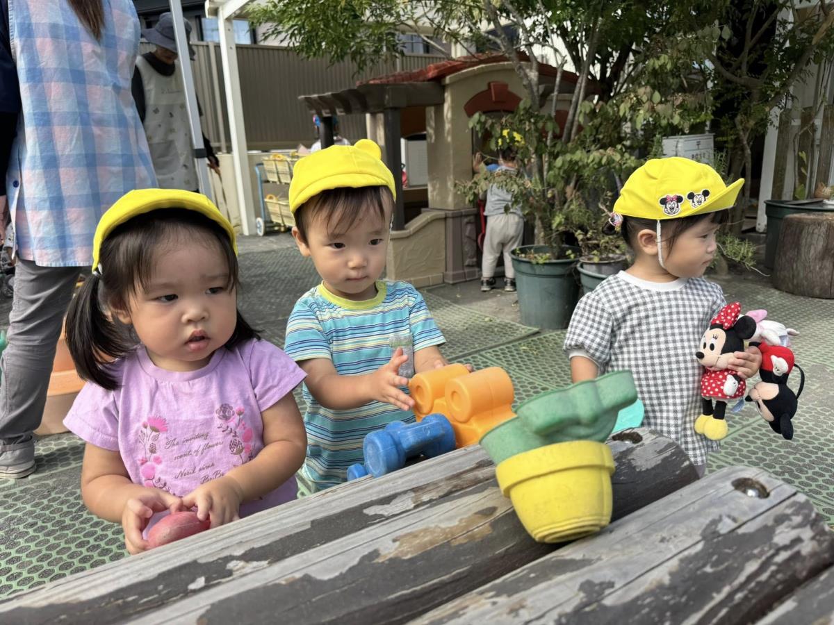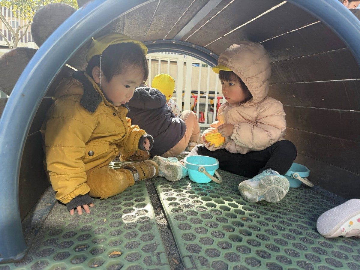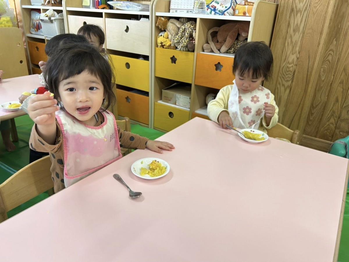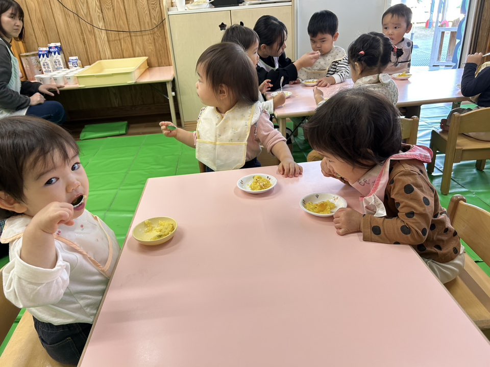 | 園庭ではお砂場やスモールハウス、追いかけっこをして楽しみました。お友達が走る姿を見て「待ってー!」と追いかけたり、友達の名前を呼んで「おいで!」と声をかけて一緒に遊ぼうとする姿が見られました。おやつのスイートポテト、とっても美味しかったね♪ |