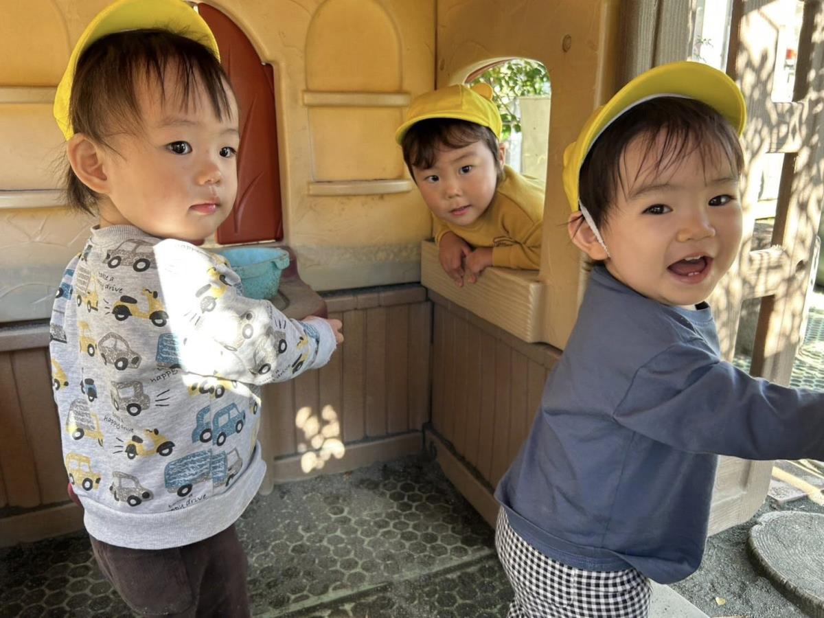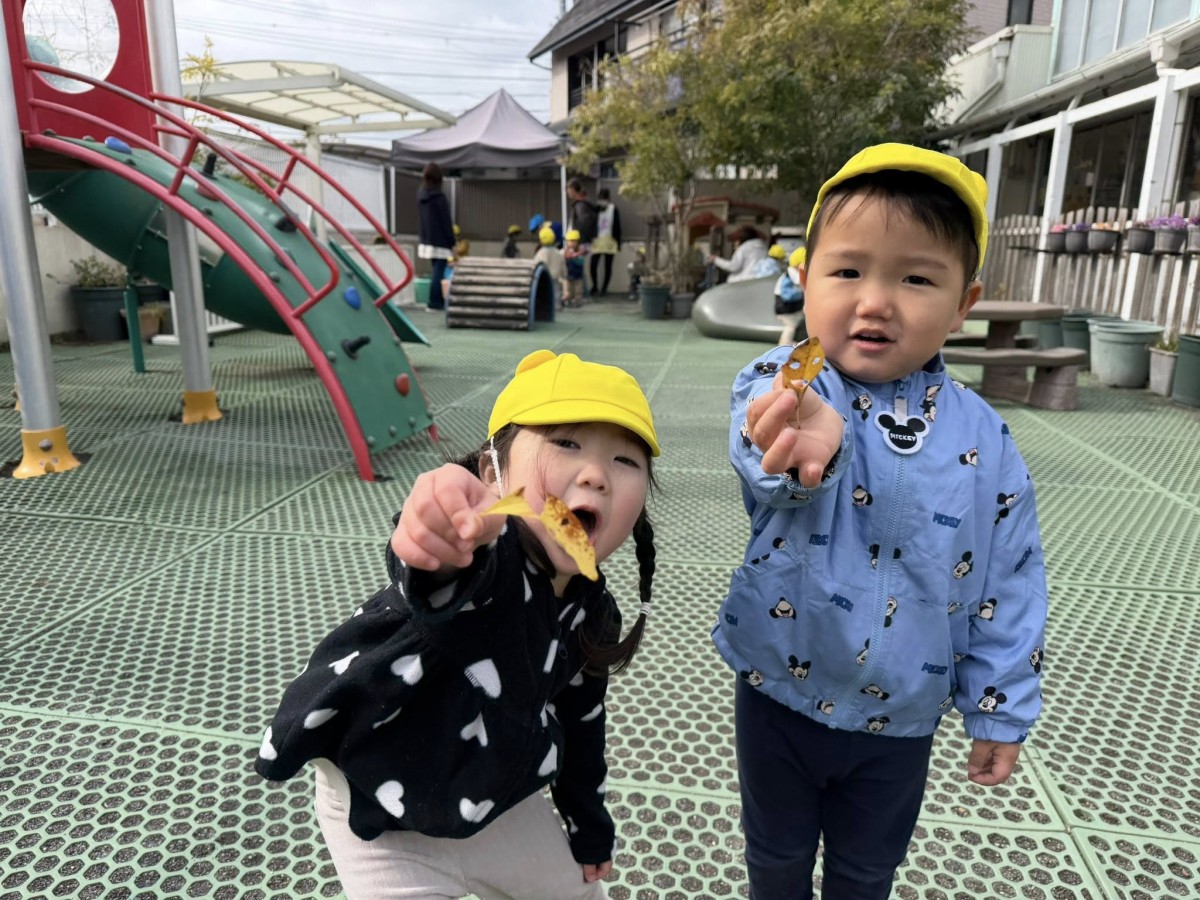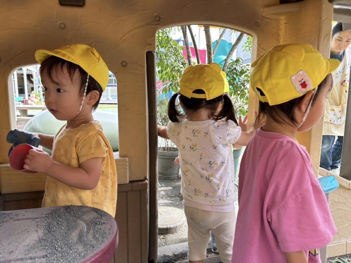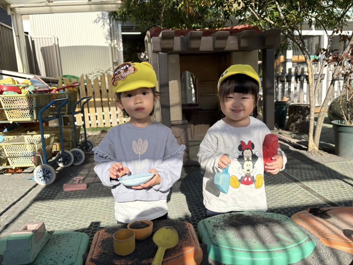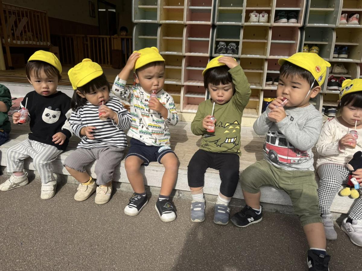 | 園庭ではお砂場やスモールハウス、追いかけっこをして楽しみました。お友達が走る姿を見て「待ってー!」と追いかけたり、友達の名前を呼んで「おいで!」と声をかけて一緒に遊ぼうとする姿が見られました。おやつのスイートポテト、とっても美味しかったね♪ |