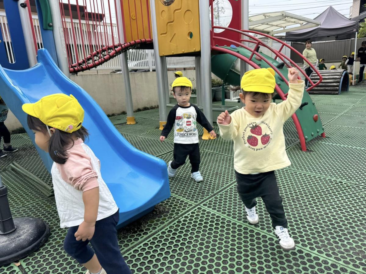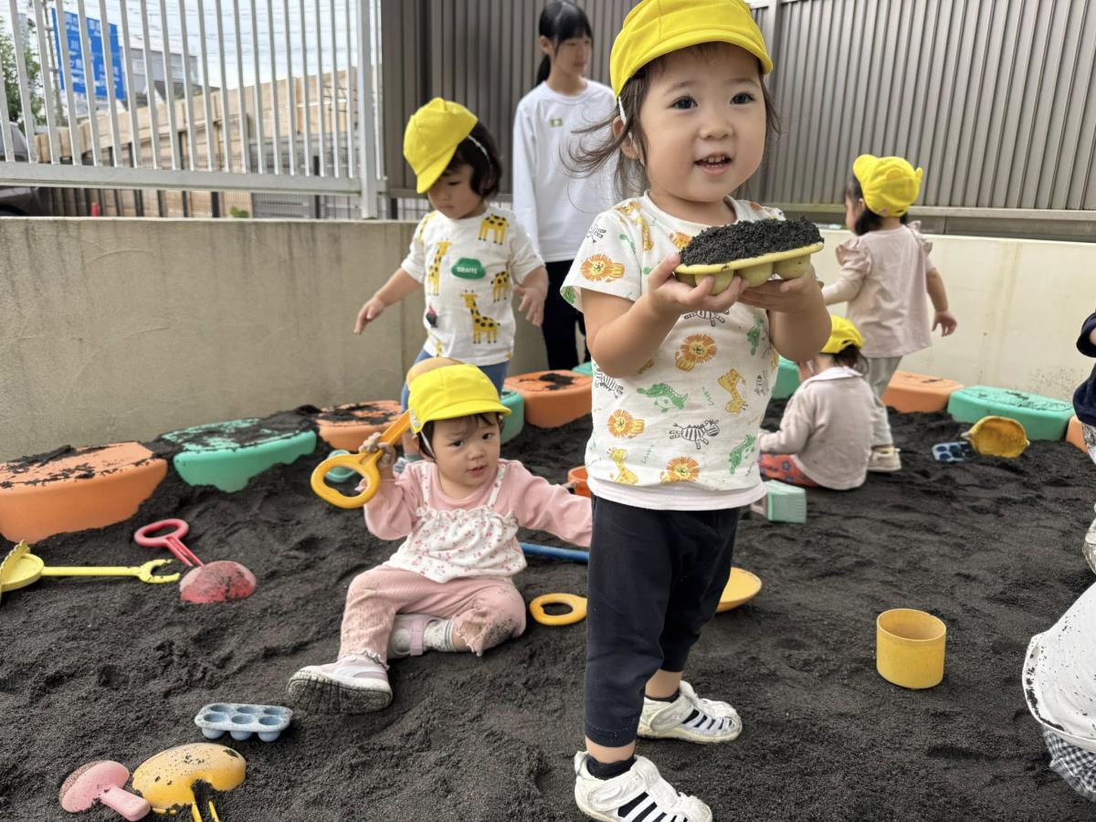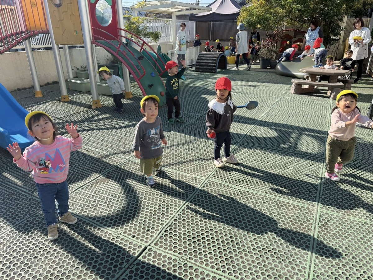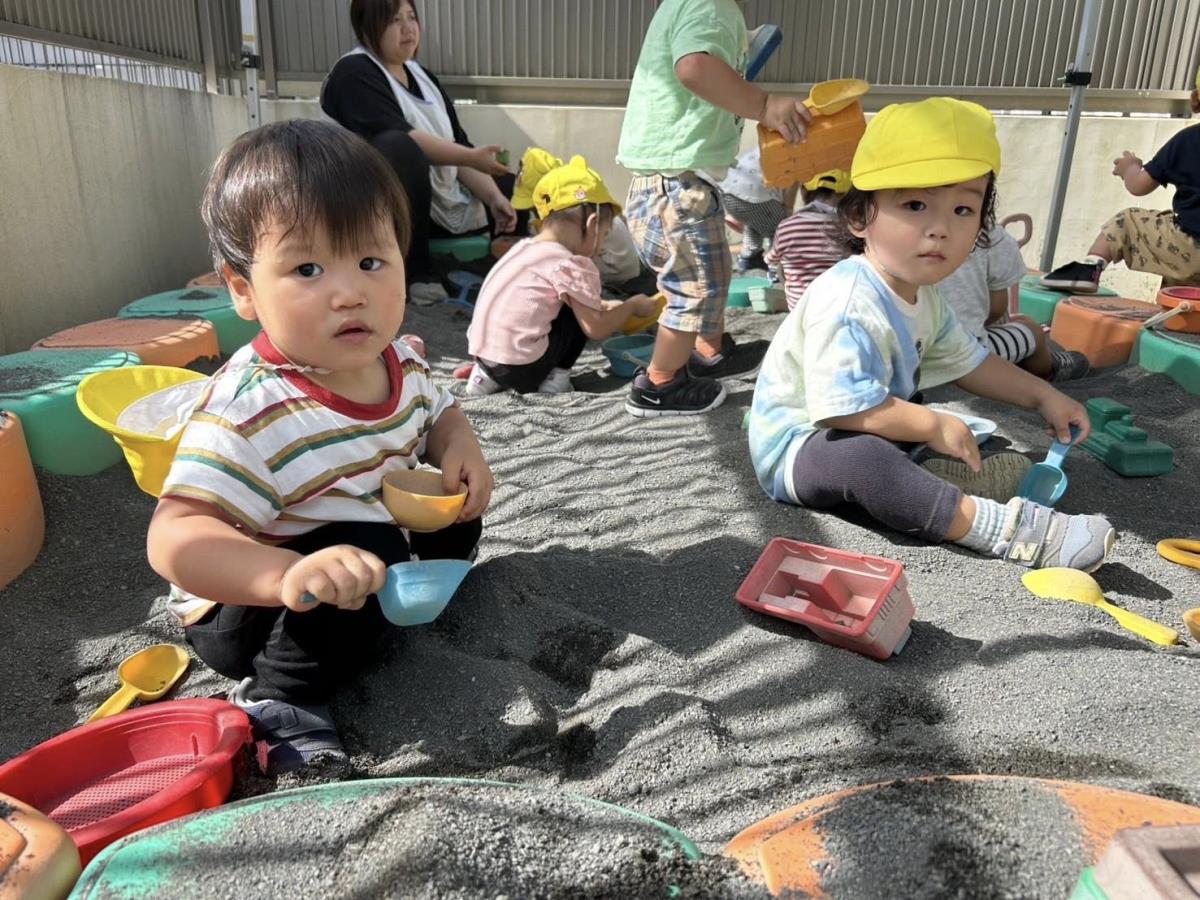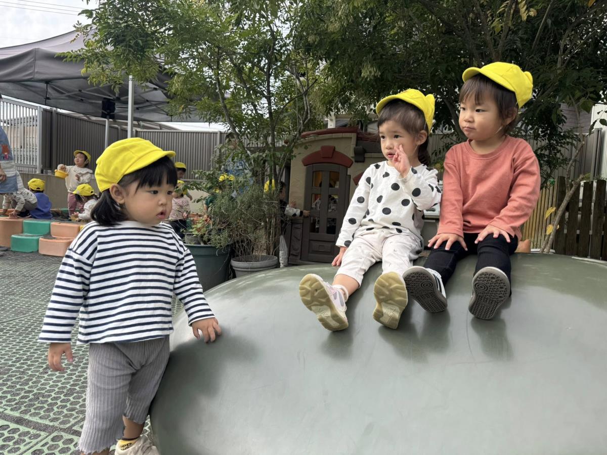 | 園庭ではお砂場やスモールハウス、追いかけっこをして楽しみました。お友達が走る姿を見て「待ってー!」と追いかけたり、友達の名前を呼んで「おいで!」と声をかけて一緒に遊ぼうとする姿が見られました。おやつのスイートポテト、とっても美味しかったね♪ |