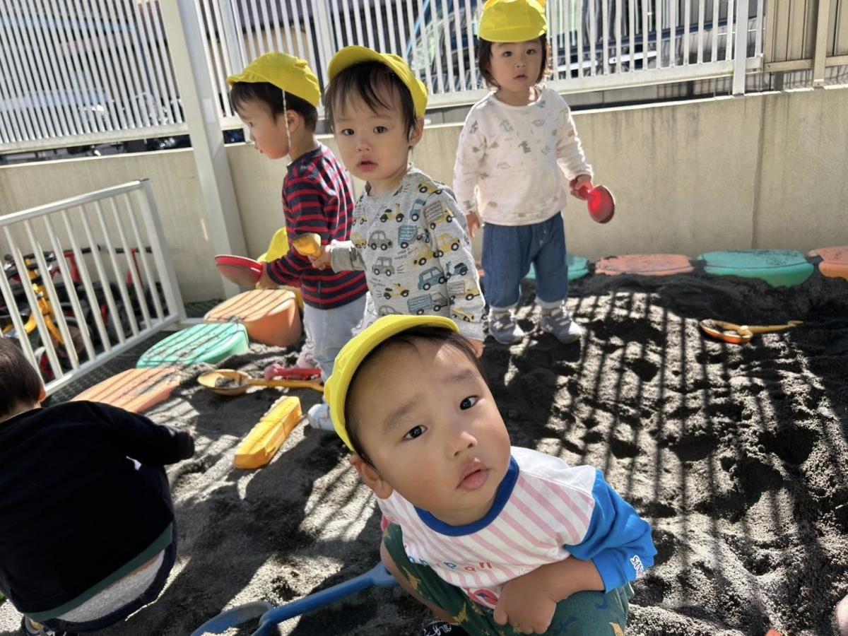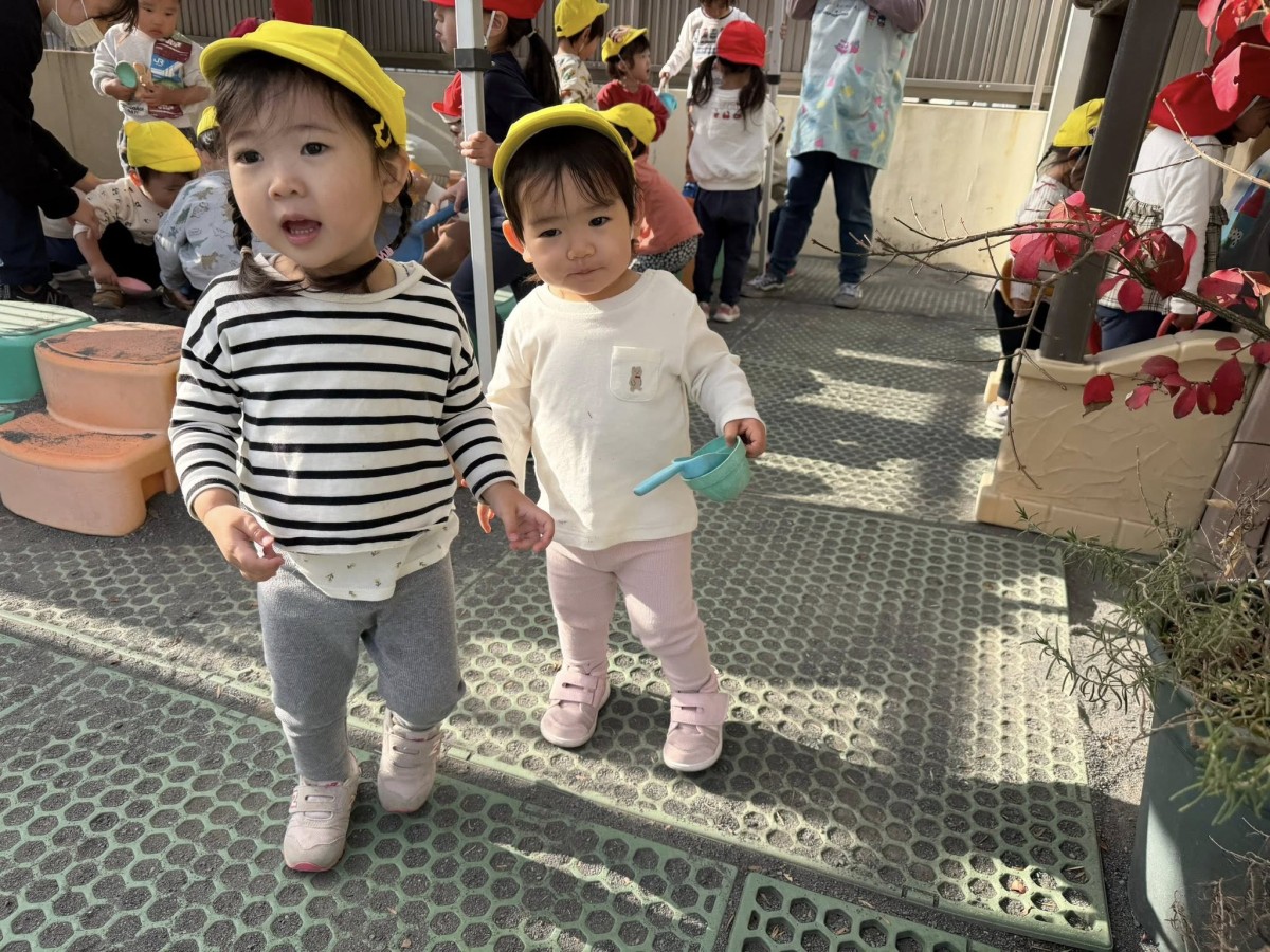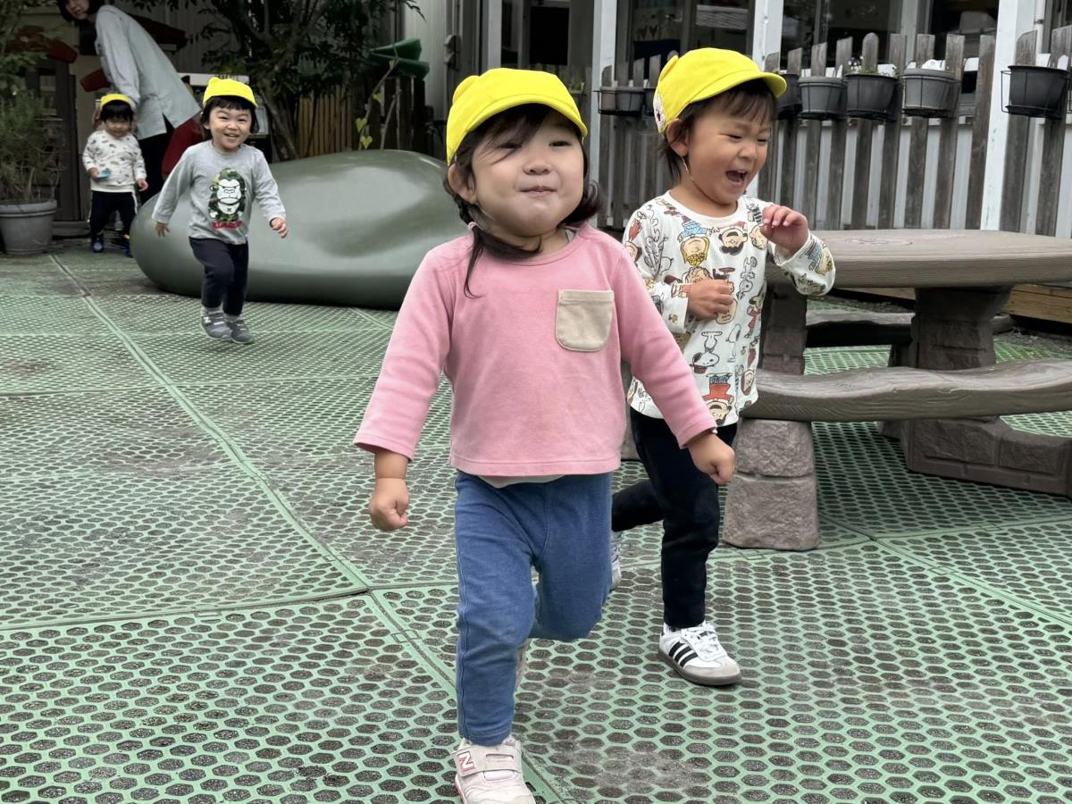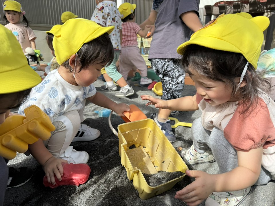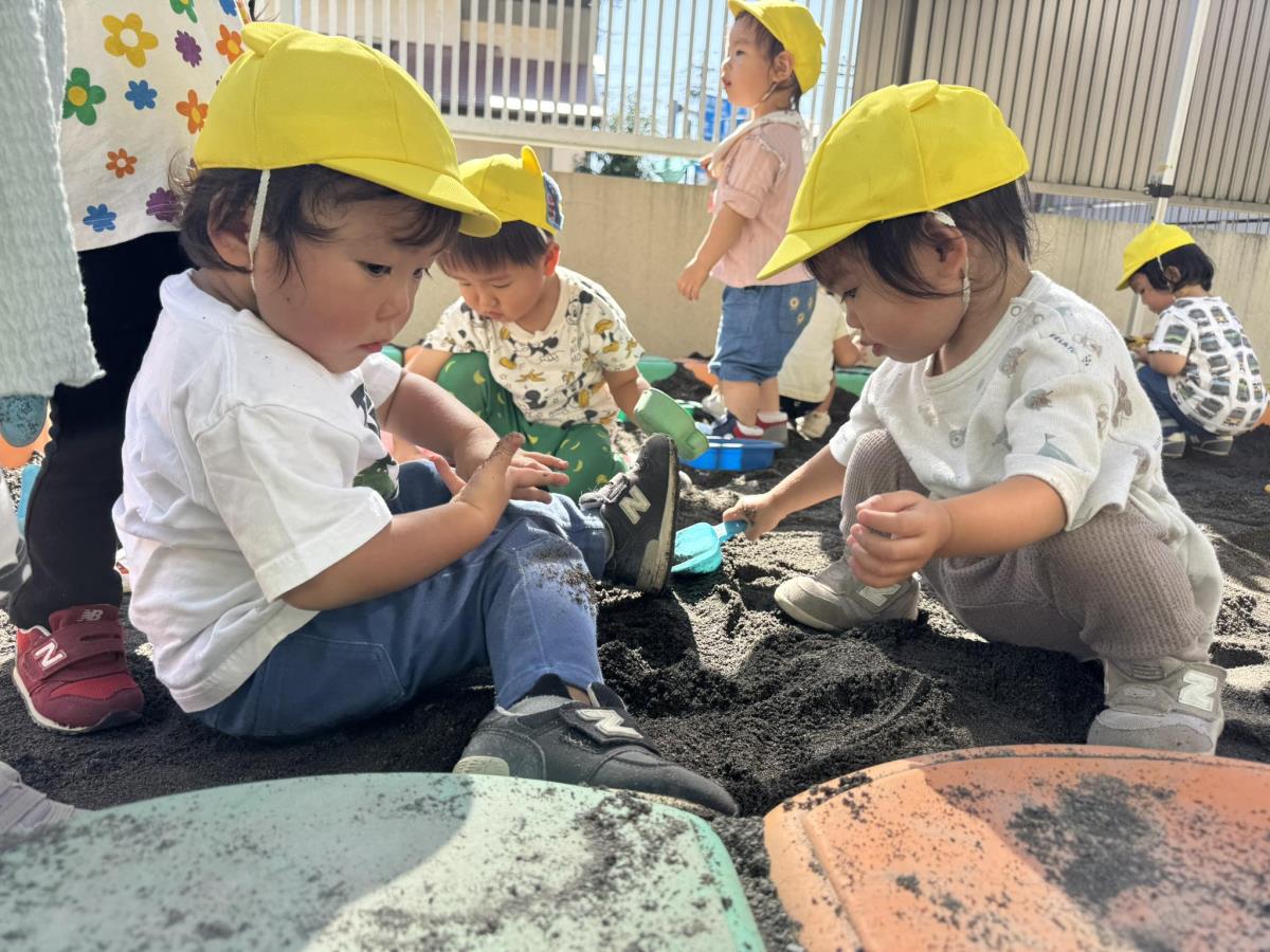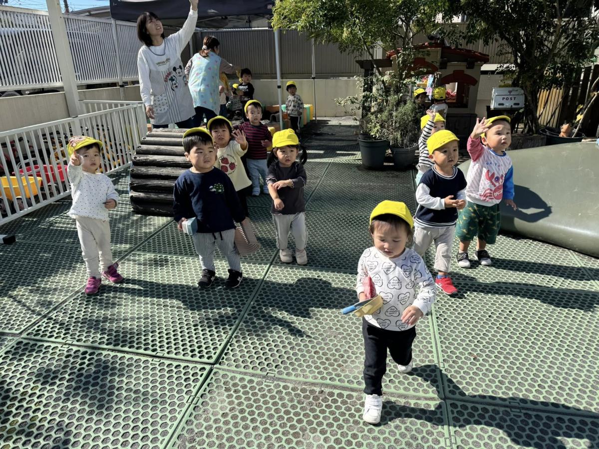 | 園庭ではお砂場やスモールハウス、追いかけっこをして楽しみました。お友達が走る姿を見て「待ってー!」と追いかけたり、友達の名前を呼んで「おいで!」と声をかけて一緒に遊ぼうとする姿が見られました。おやつのスイートポテト、とっても美味しかったね♪ |