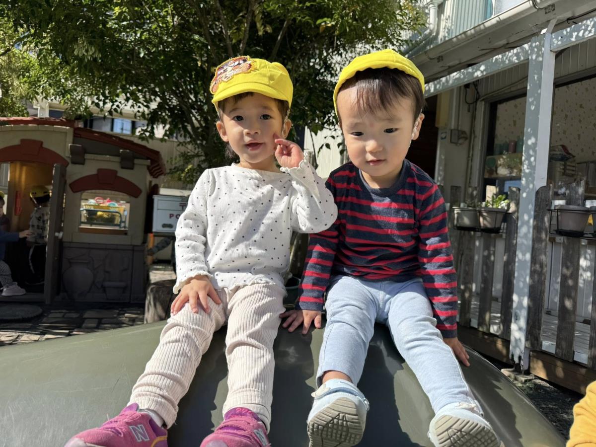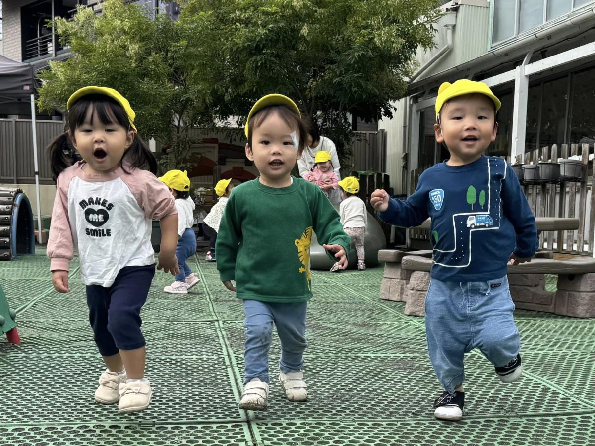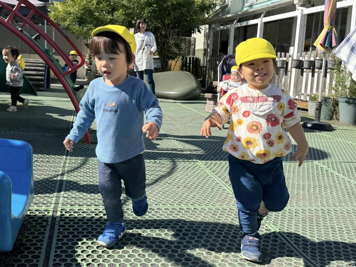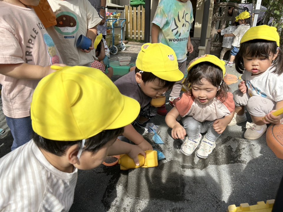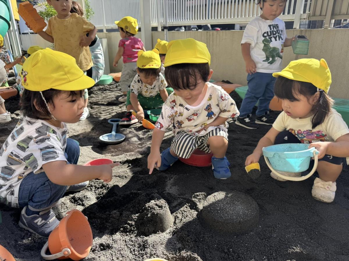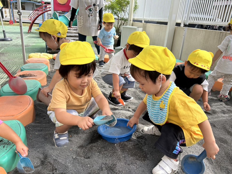 | 園庭ではお砂場やスモールハウス、追いかけっこをして楽しみました。お友達が走る姿を見て「待ってー!」と追いかけたり、友達の名前を呼んで「おいで!」と声をかけて一緒に遊ぼうとする姿が見られました。おやつのスイートポテト、とっても美味しかったね♪ |