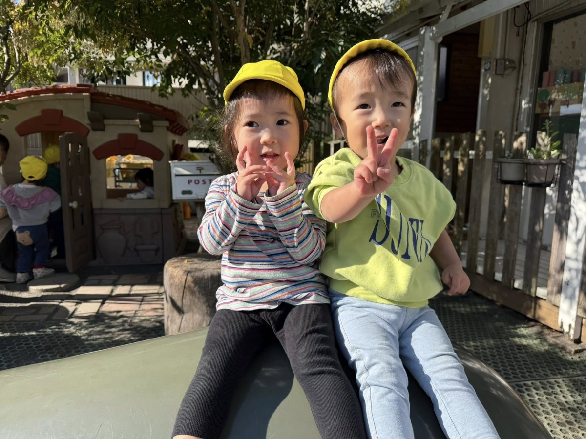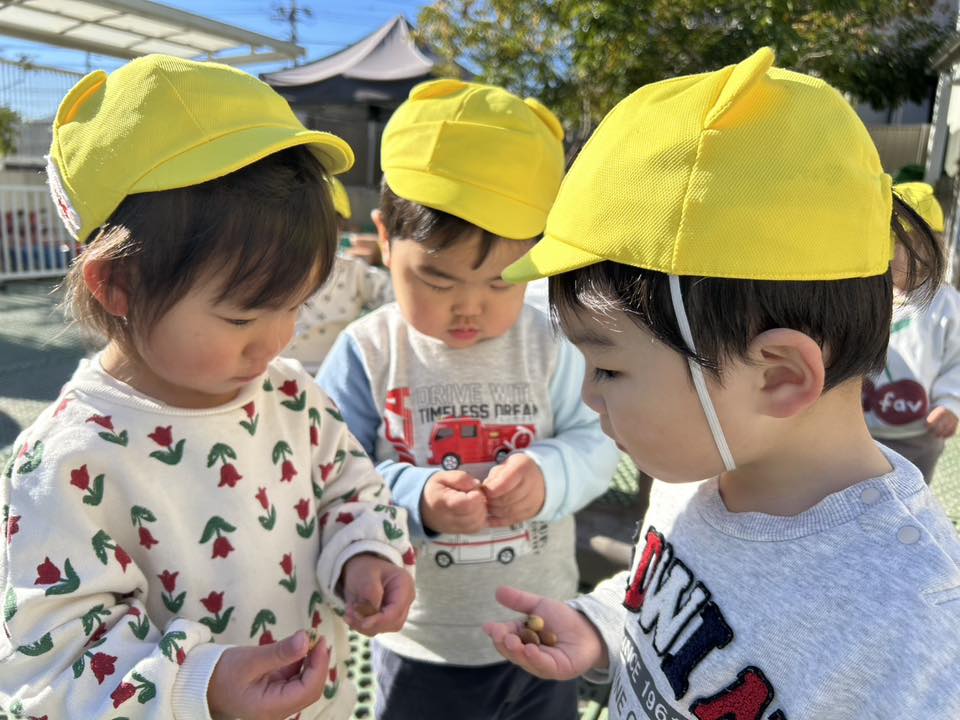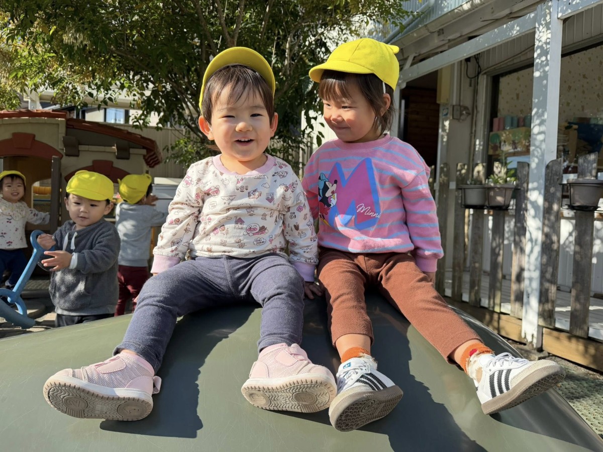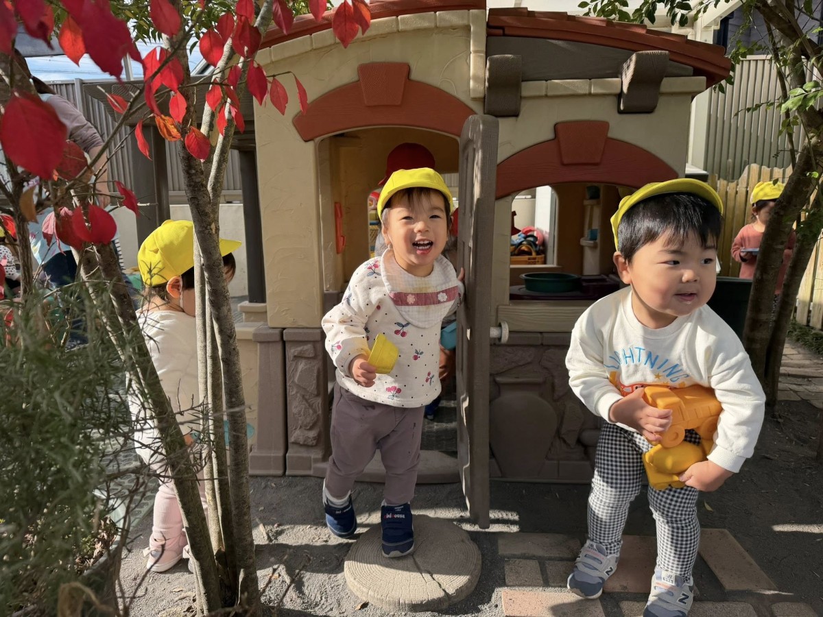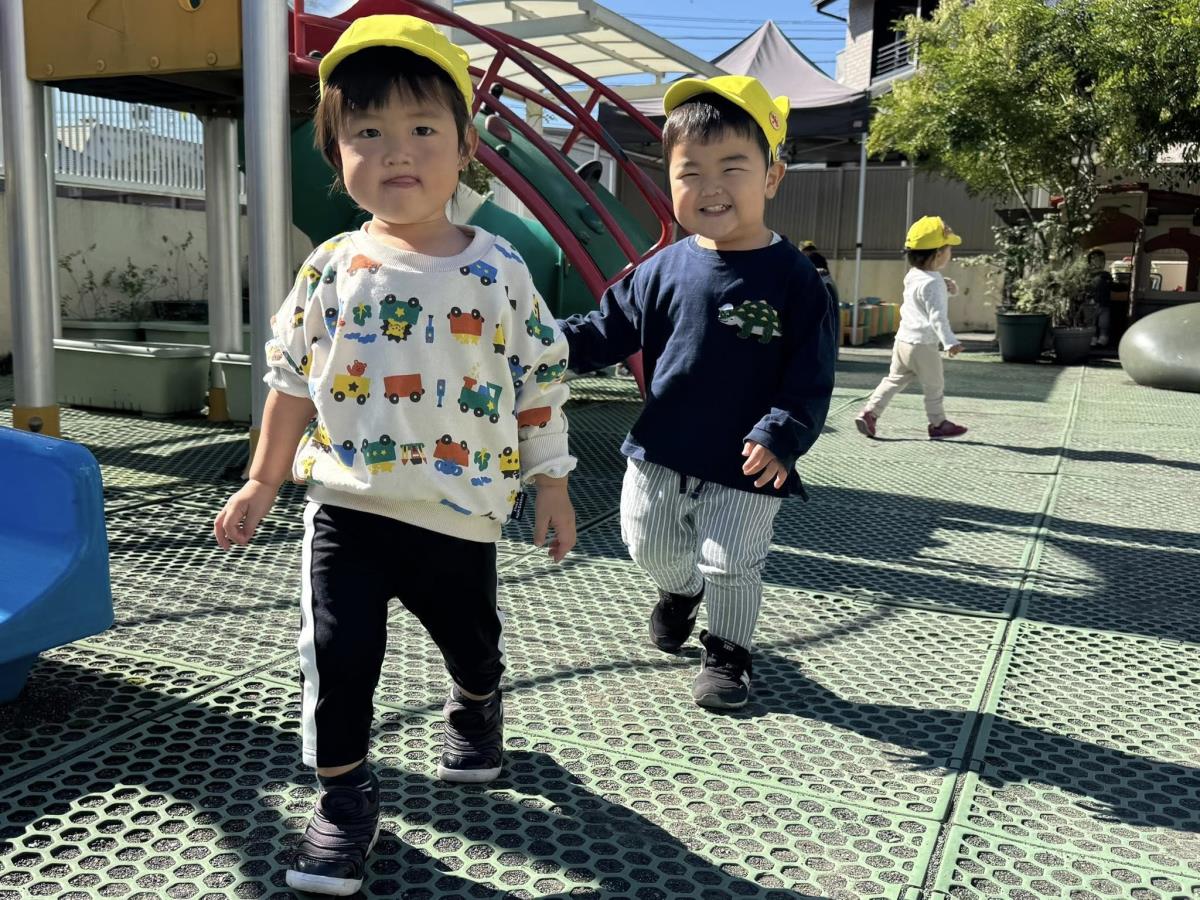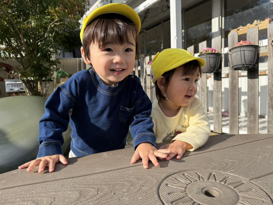 | 園庭ではお砂場やスモールハウス、追いかけっこをして楽しみました。お友達が走る姿を見て「待ってー!」と追いかけたり、友達の名前を呼んで「おいで!」と声をかけて一緒に遊ぼうとする姿が見られました。おやつのスイートポテト、とっても美味しかったね♪ |