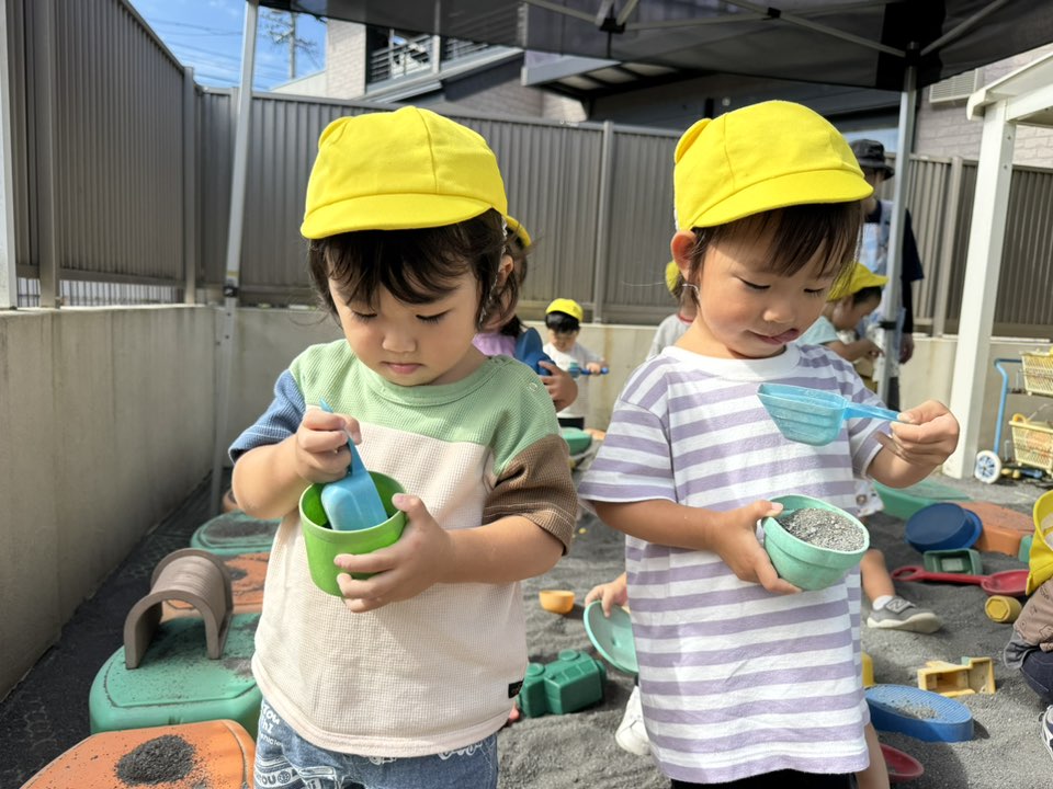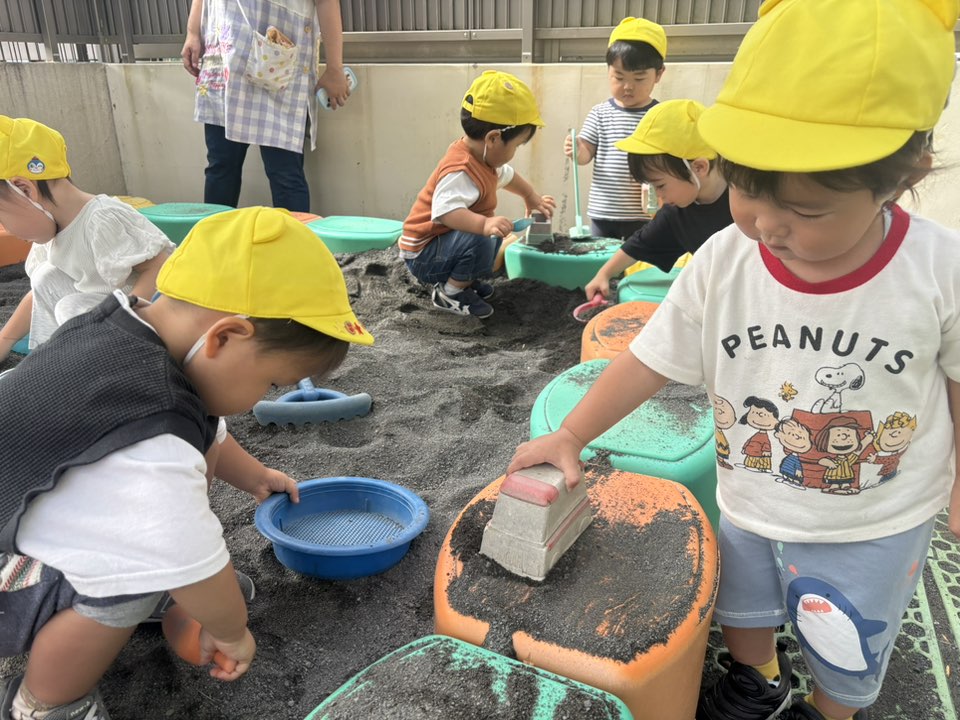 | 今日は園庭で体操を皆で行い、その後は砂場やスモールハウスで遊びました。皆それぞれお気に入りのおもちゃを選び砂場に持ち寄っています。乗り物を走らせたり、型抜きや容器に砂を入れて楽しむ姿が見られました。途中、廊下でお茶休憩をしました。「おかわり!」「美味しい!」と元気な声が響いていました♪ |