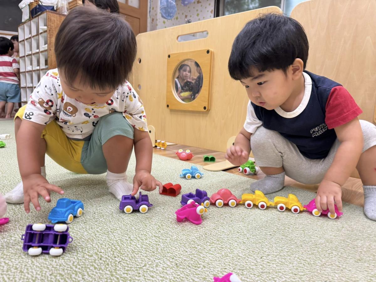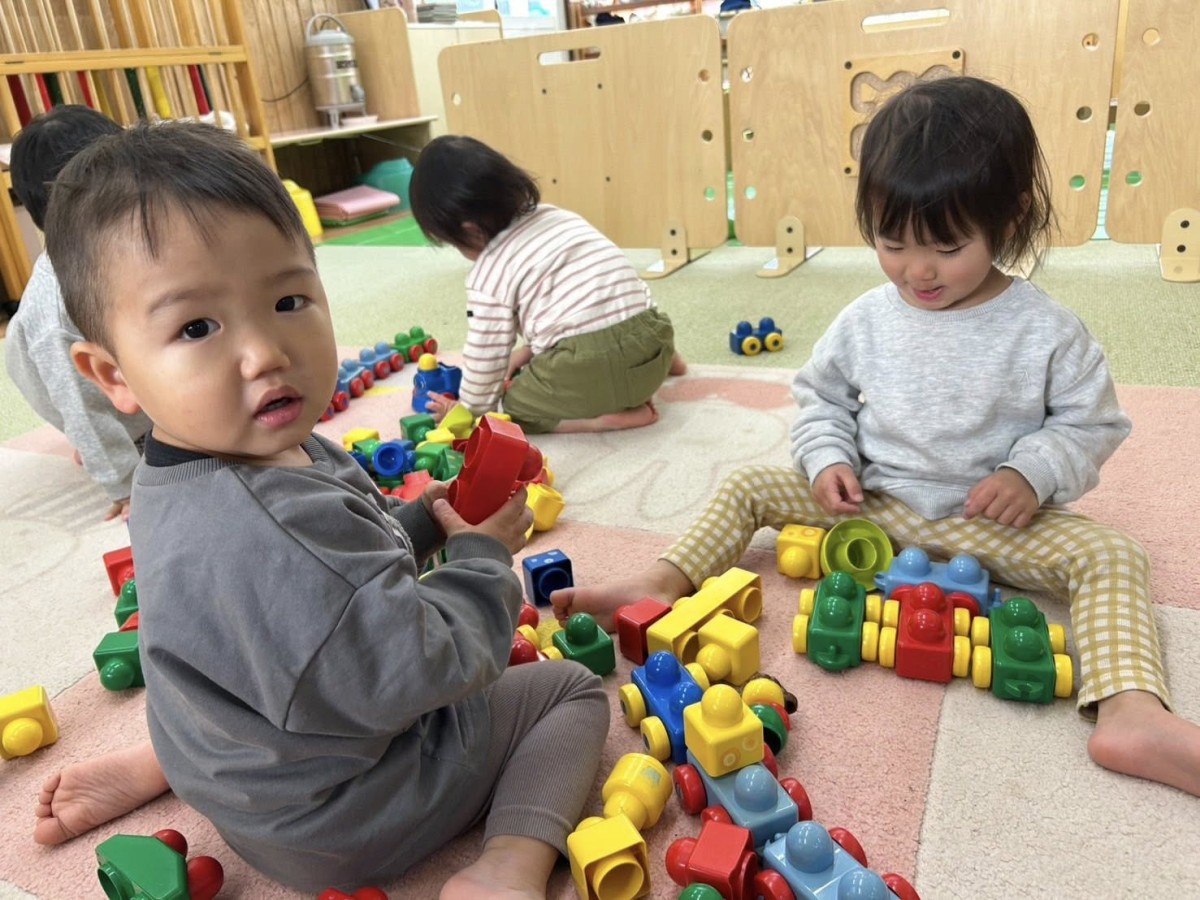 | 今日は室内で過ごしました。体操の音楽を流すと覚えた振りを踊り出すひよこさん。身体を揺らしたり、ジャンプをしてお友達と笑い合う姿が見られました。その後は車のおもちゃで遊びました。車を持って「お出かけしようよ!」「スーパー行く」とお話していました。 |