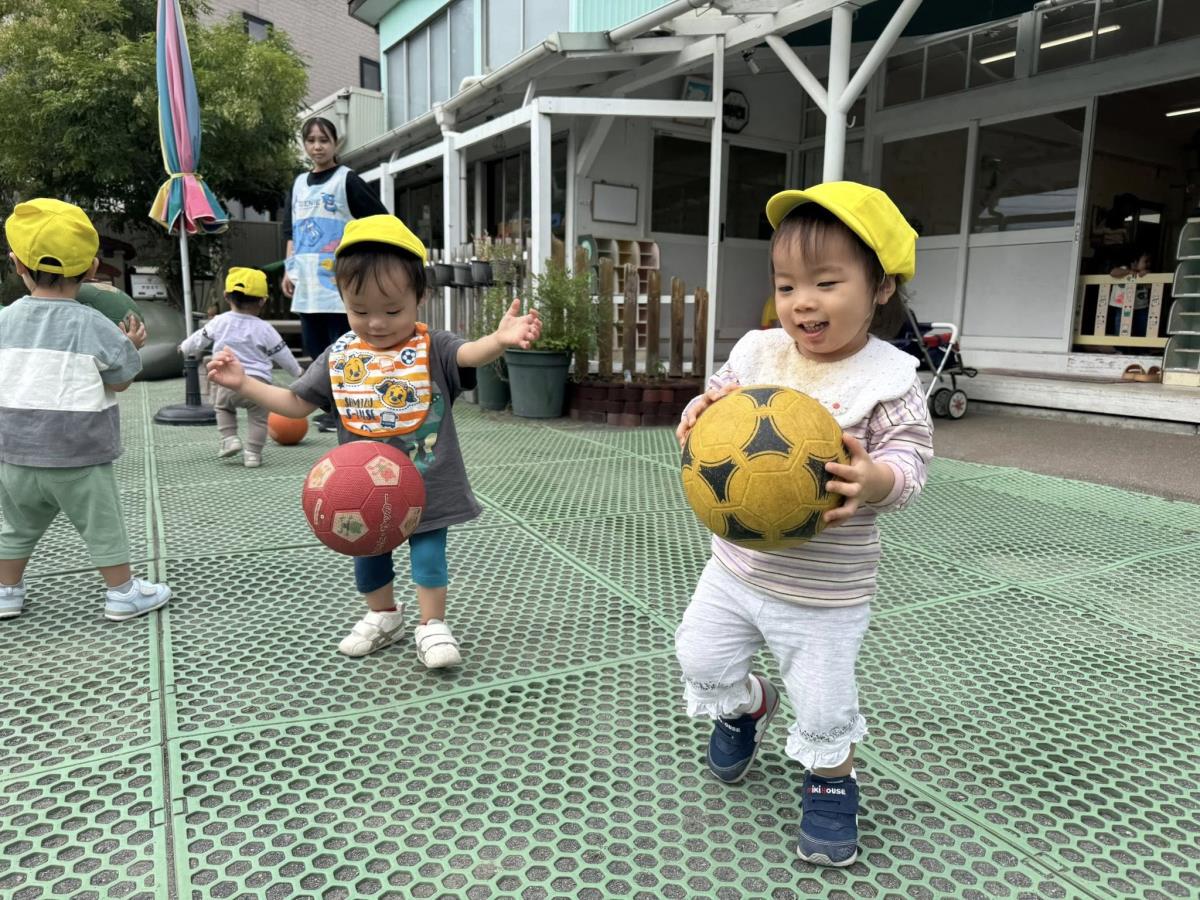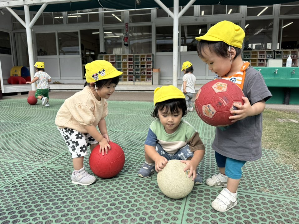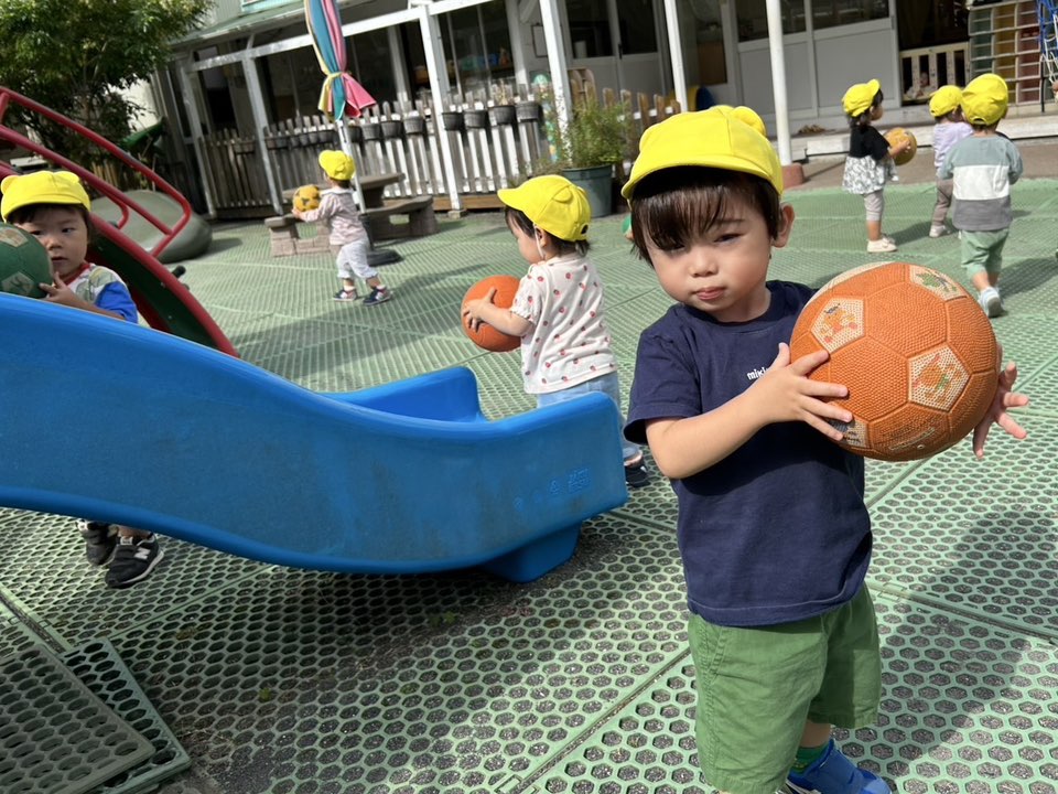 | 園庭で遊びました。ボールを出すとポーンと投げてみたり、足で蹴ろうとする姿が見られました。自分で転がしたボールを追いかけて楽しんでいます♪お砂場では型抜きをたり、車を集めて「車のお家」を作って見せてくれました♪ |