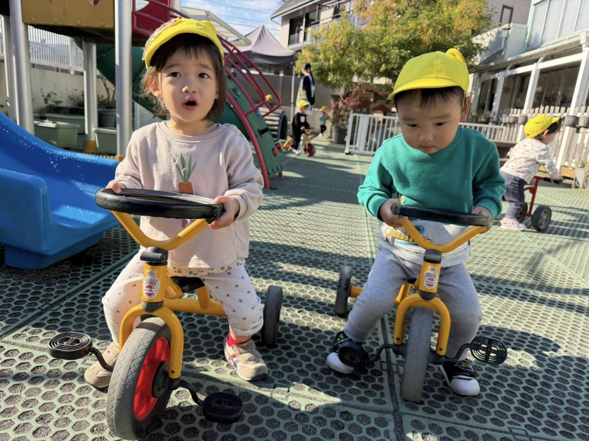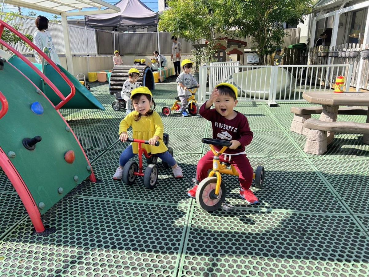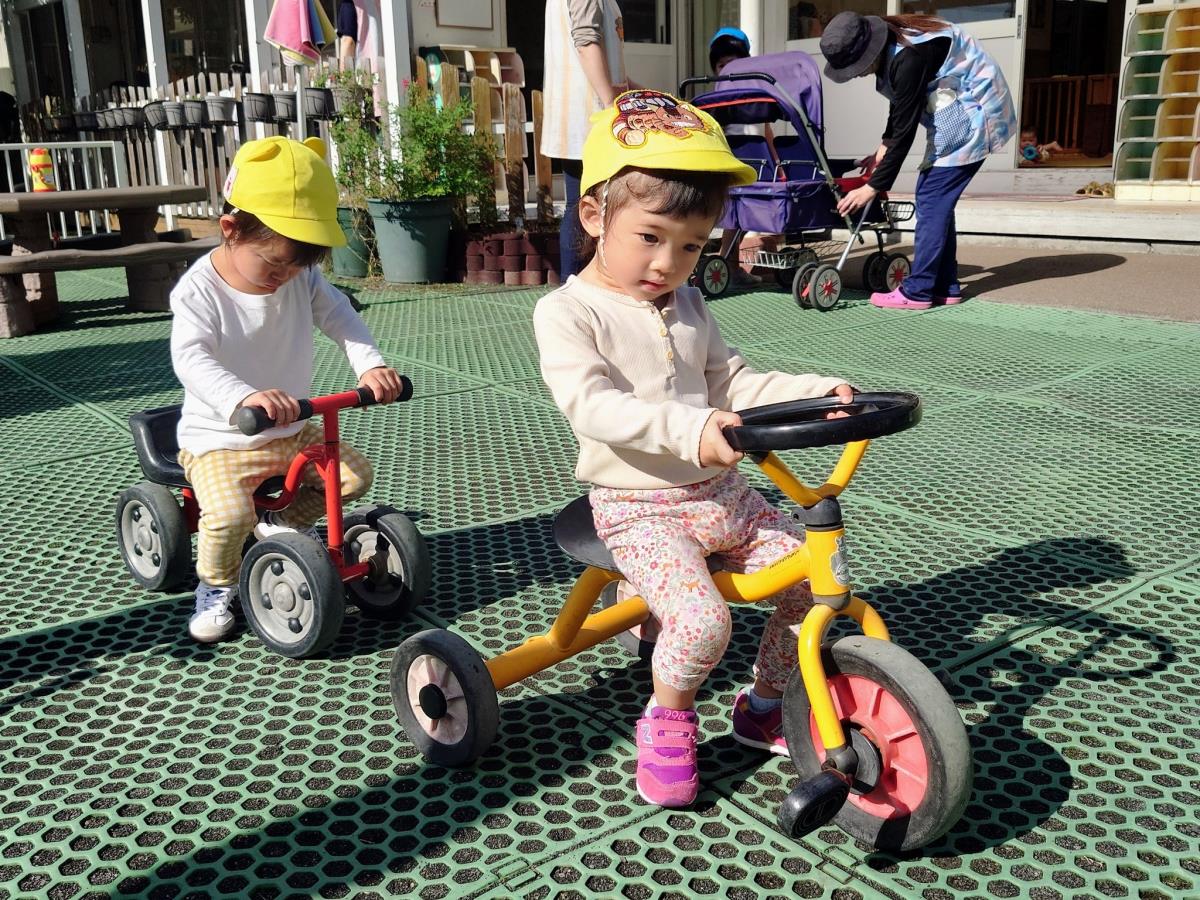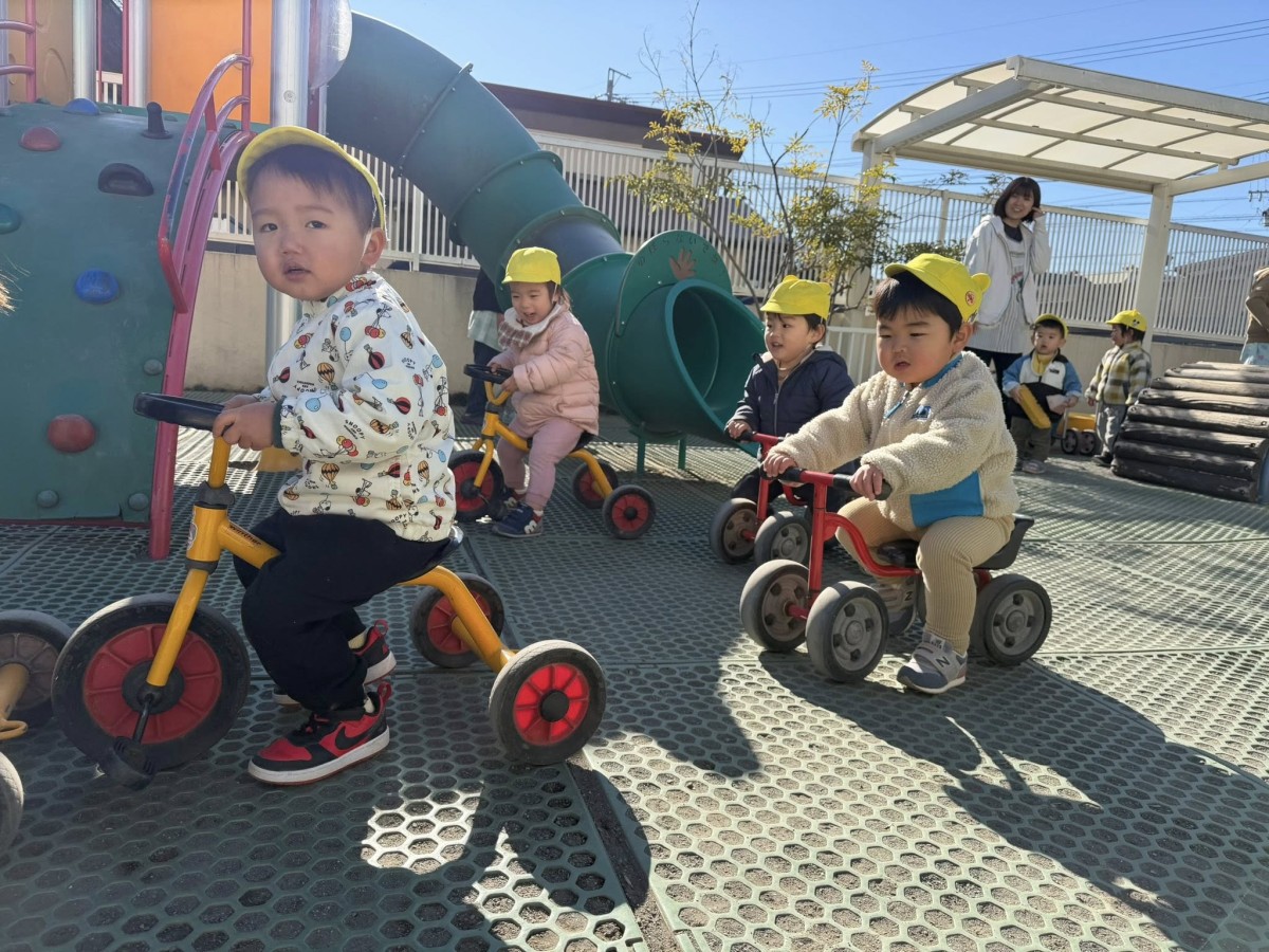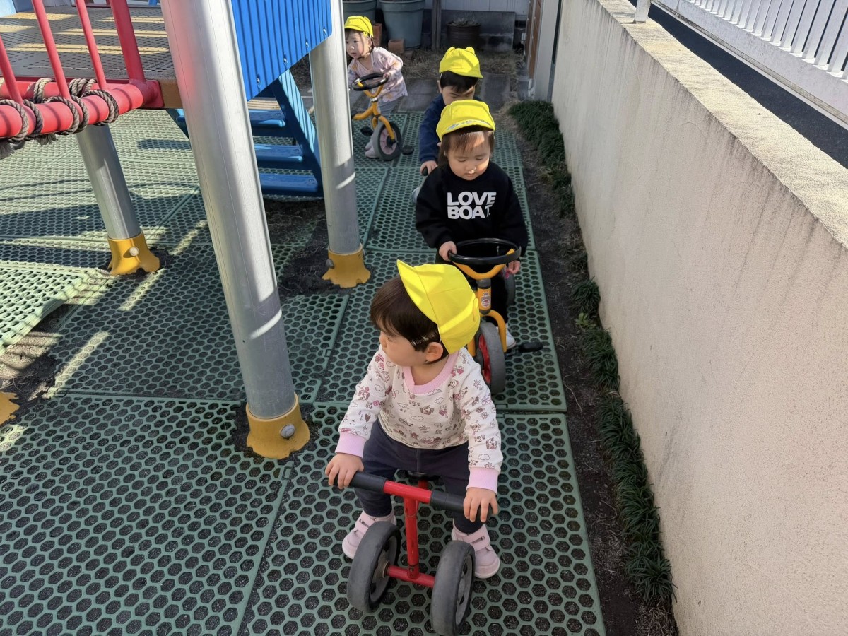 | 今日は園庭で遊びました。三輪車や四輪車に乗り、「ゴーゴー!」と言いながら園庭をドライブするひよこ組さん。保育士が途中で「おーい」と手を振ると、「ばいばーい!」と元気いっぱい手を振り返してくれました。 |