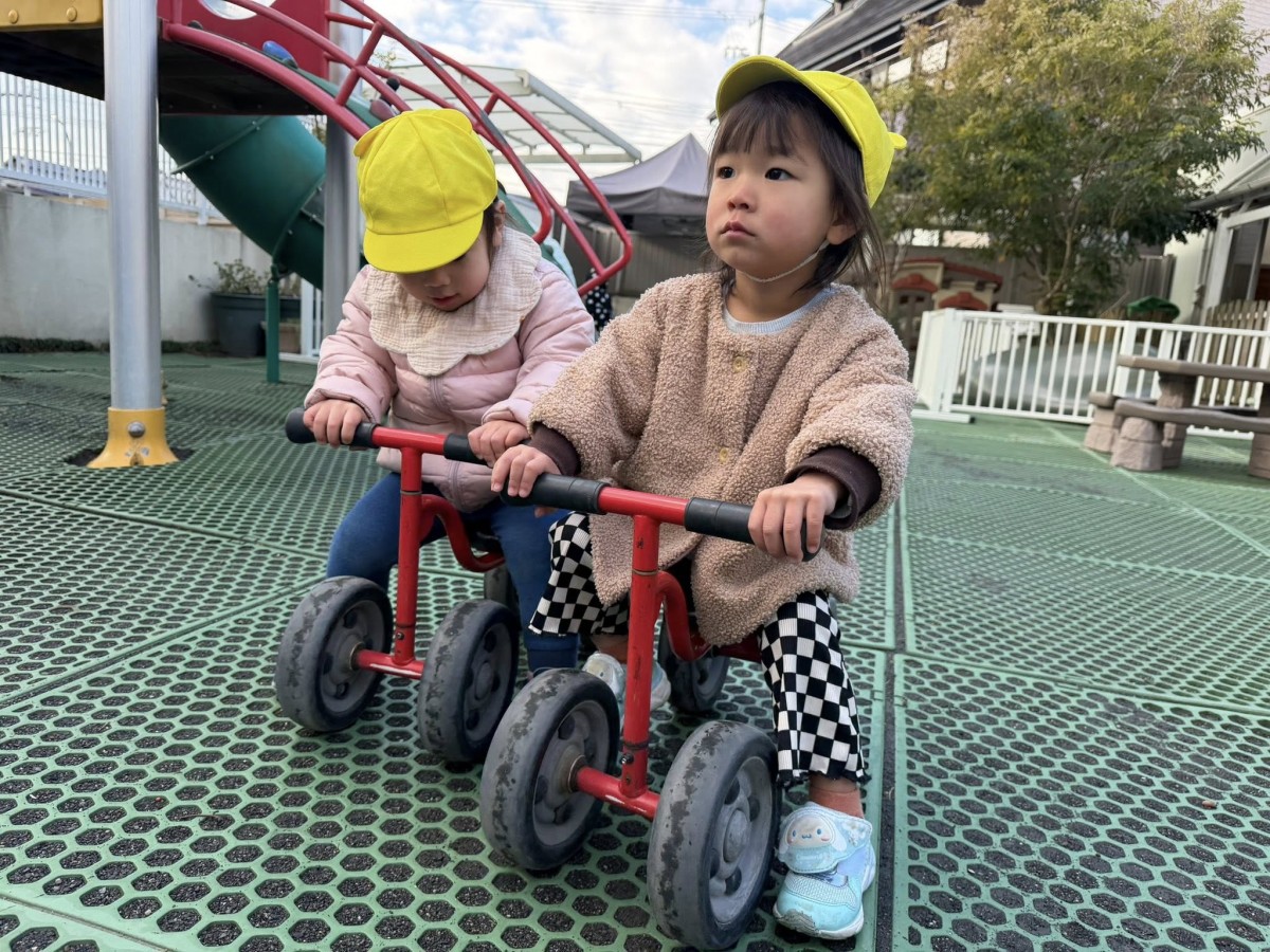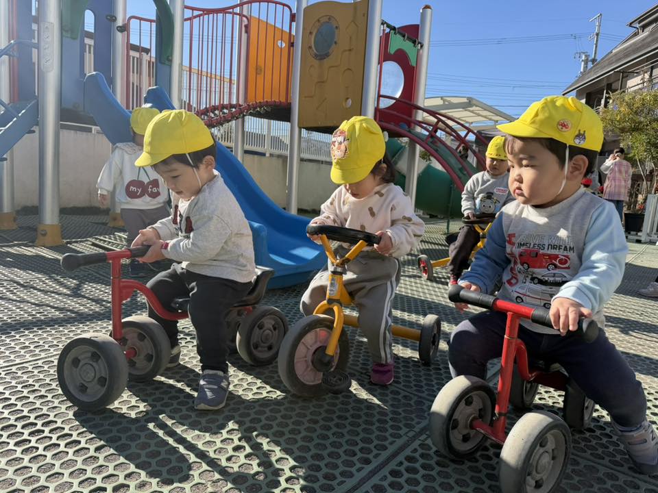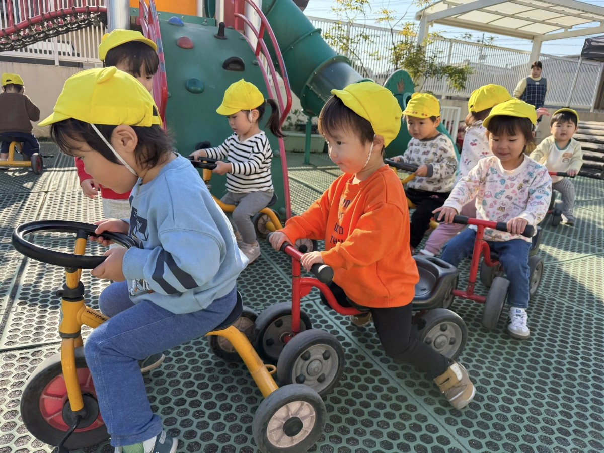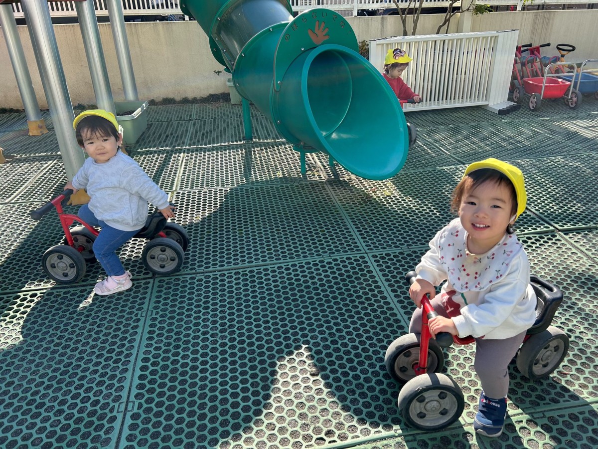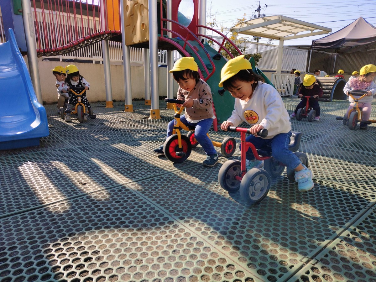 | 今日は園庭で遊びました。三輪車や四輪車に乗り、「ゴーゴー!」と言いながら園庭をドライブするひよこ組さん。保育士が途中で「おーい」と手を振ると、「ばいばーい!」と元気いっぱい手を振り返してくれました。 |