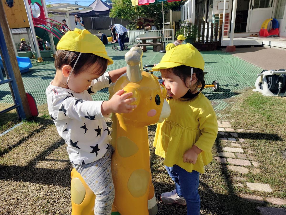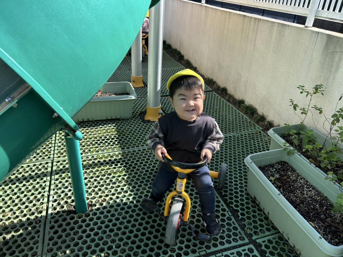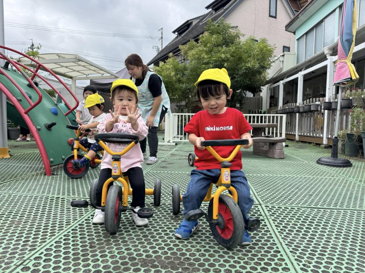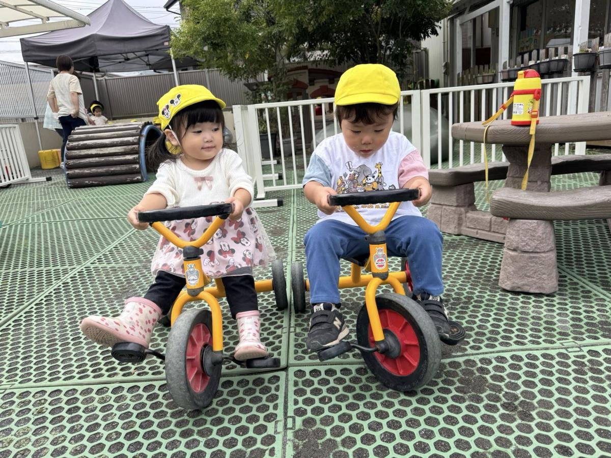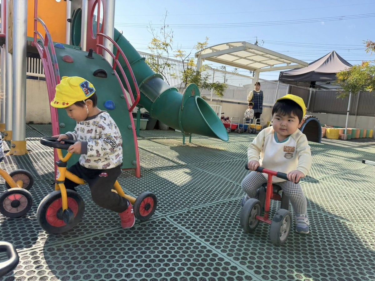 | 今日は園庭で遊びました。三輪車や四輪車に乗り、「ゴーゴー!」と言いながら園庭をドライブするひよこ組さん。保育士が途中で「おーい」と手を振ると、「ばいばーい!」と元気いっぱい手を振り返してくれました。 |