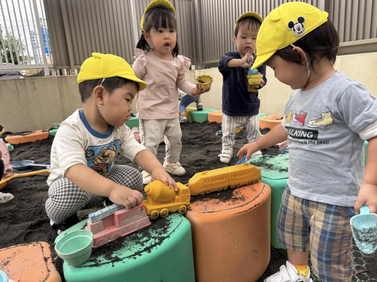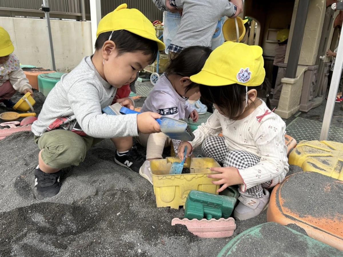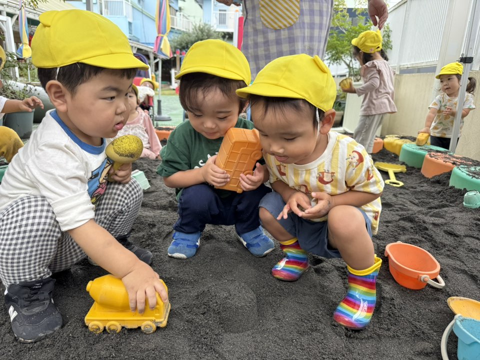 | 園庭で遊びました。お砂場では先生が作った型抜きをおもちゃを使って崩してみたり、一緒に型抜きをして楽しみました。室内では車やブロックのおもちゃで遊びました。車を繋げて走らせたり、お友達の車とくっつけて笑いあっていました。 |