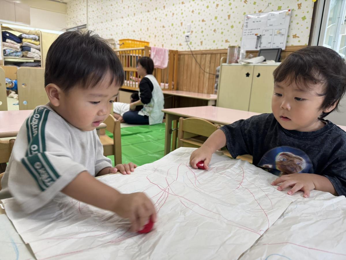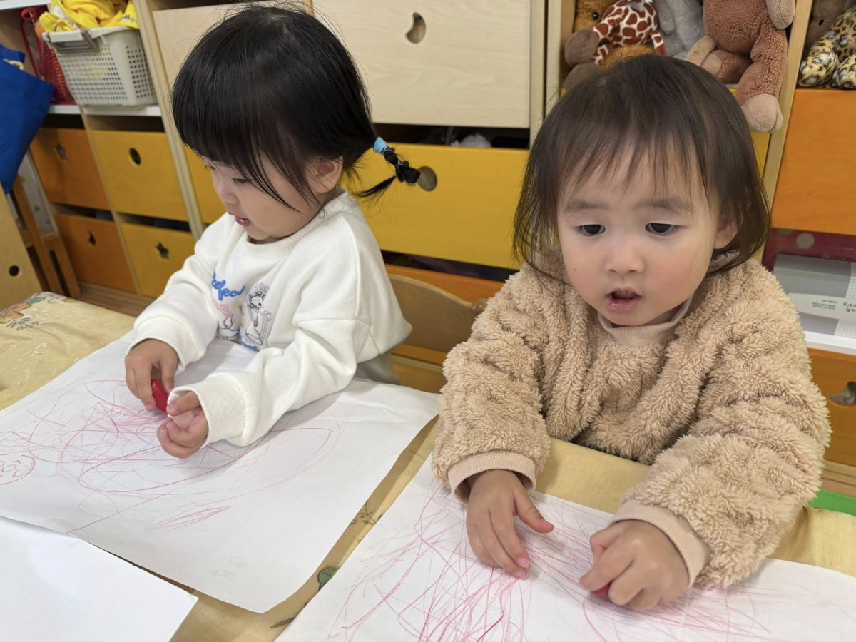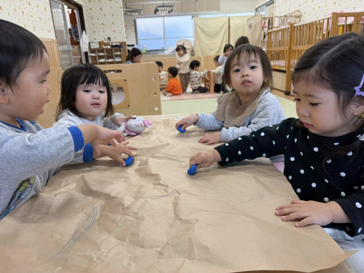 | 今日は室内で過ごしました。おままごと遊びやお絵描きをしました。先生が大きな丸をかくと真似してかいたり、その丸のなかをぐりぐり塗り絵のようにかいて楽しんでいます♪おままごとではお皿にのせた食べ物を先生やお友達に「食べて」と持ってきてご馳走してくれました。ぬいぐるみにも「あーん!」と食べさせてあげる姿が見られました(^^) |