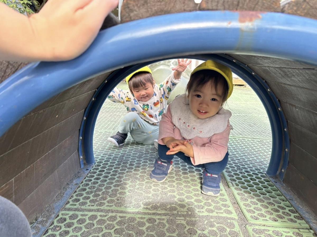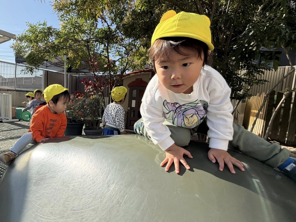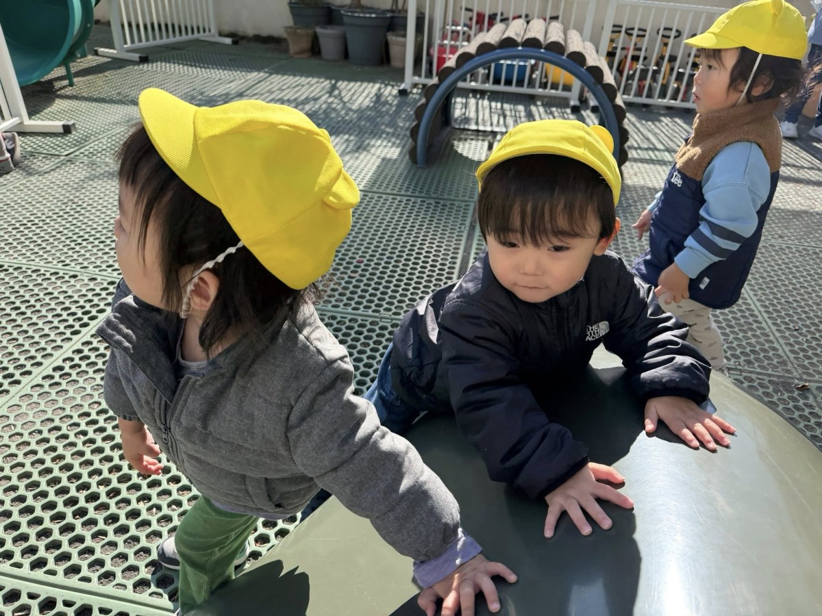 | 園庭で遊びました。スモールハウスの中は隠れんぼをしていました。「みーつけた!」と声をかけるときゃー!と嬉しそうに逃げていきます♪「おおきないし」では、足が滑っても手に力を入れて落ちないように工夫しながら登ろうと頑張っています。遊具の周りでは追いかけっこを楽しんでいました。 |