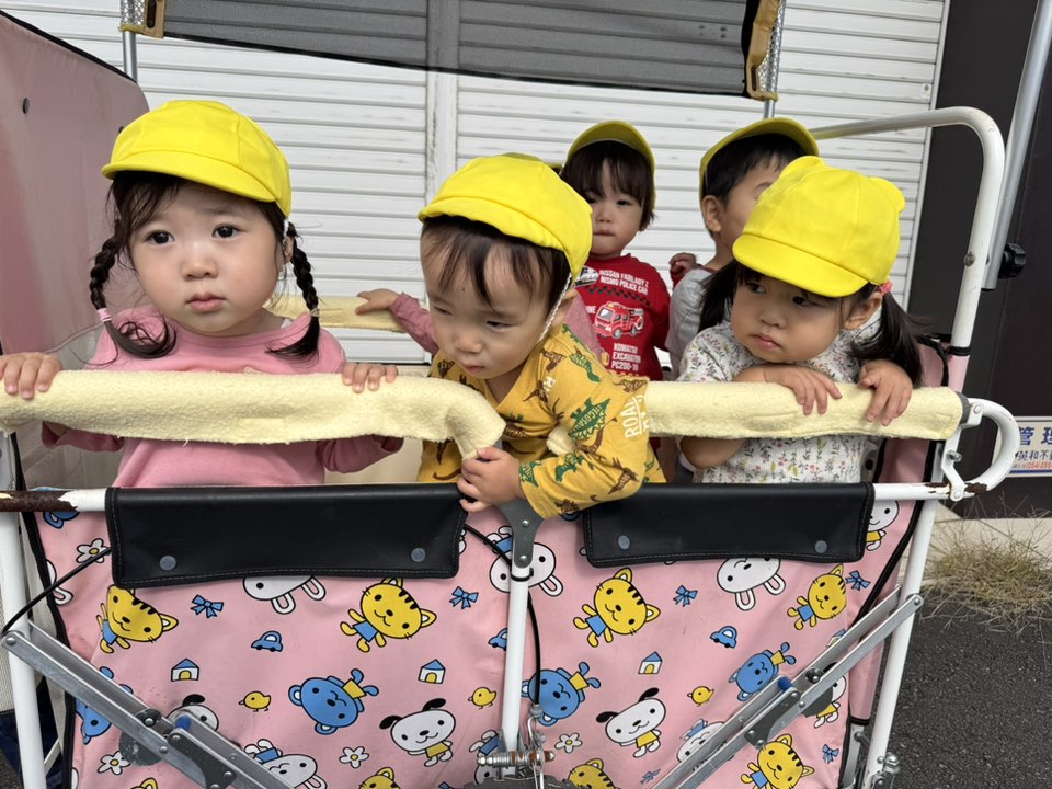 | 今日は園庭で遊んだ後、ベビーカーに乗って園周辺をお散歩してきました。園庭では「まてまてー!」と追いかけっこを楽しんでいます。お散歩に出るとバスを発見!皆で「おーい!」と手を振り、「バスいたね」「また来るかな?」とお話していました。 |