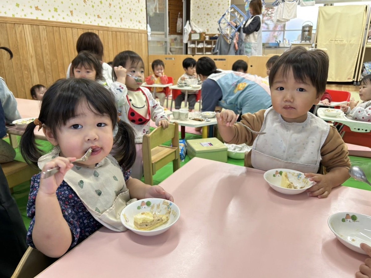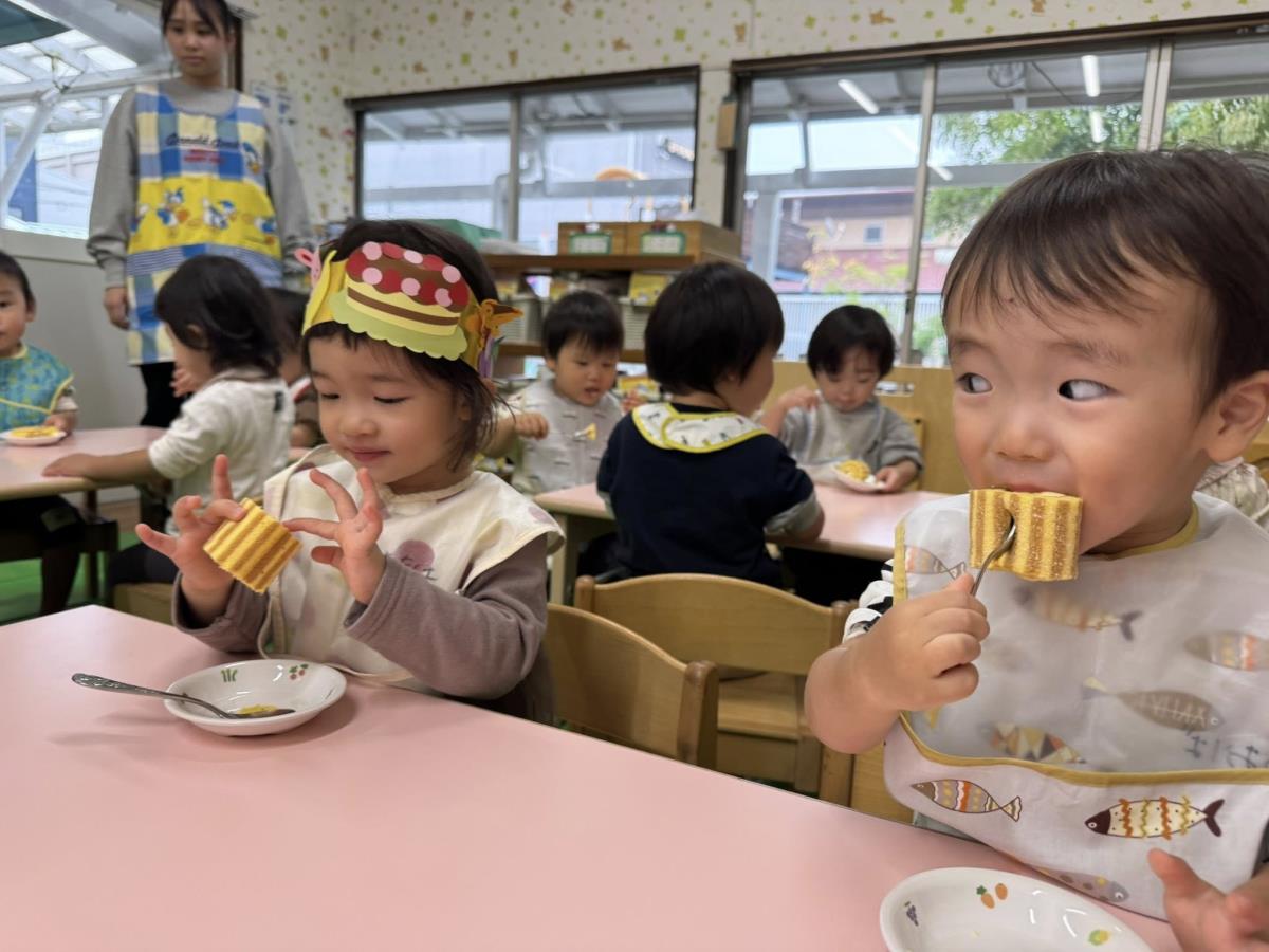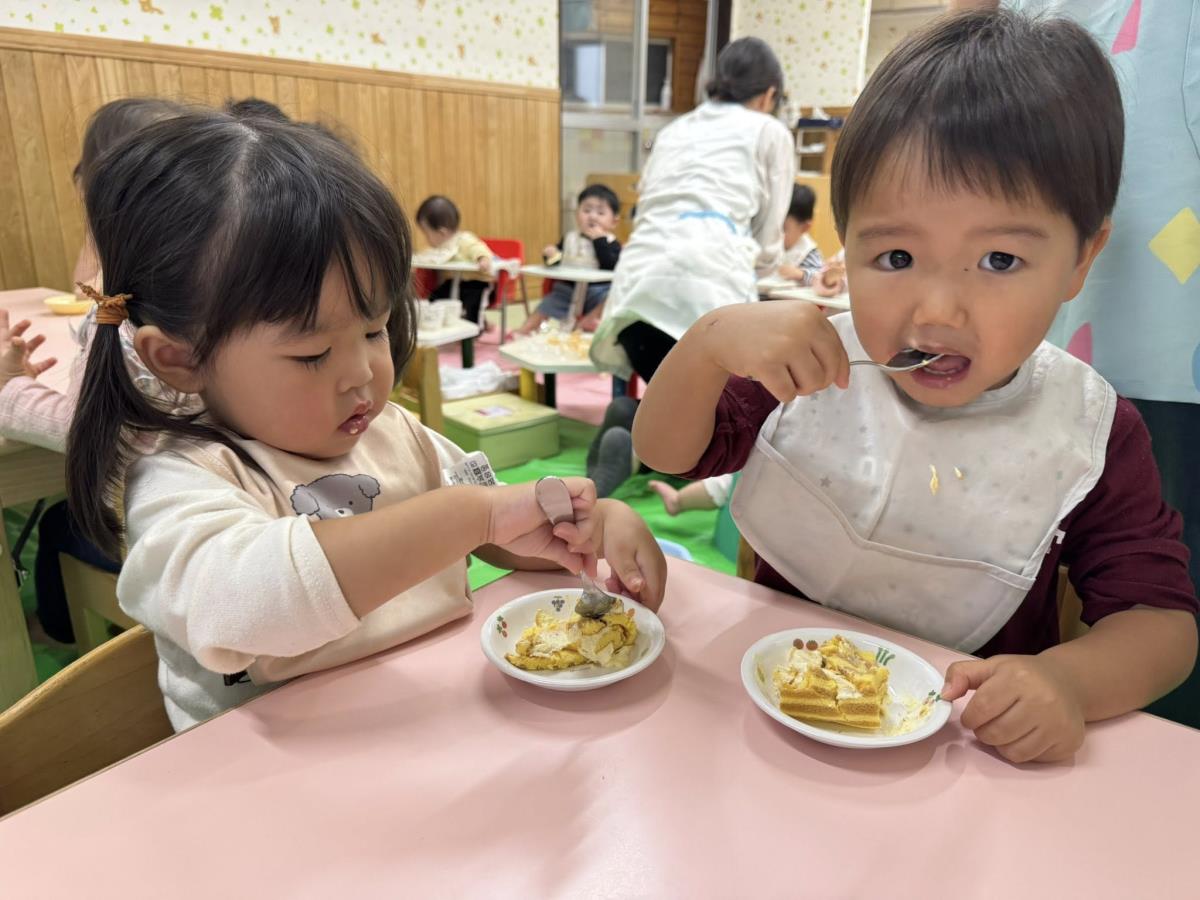 | 今日は10月のお誕生会に参加しました。ハッピーバースデーの音楽が流れると手拍子をして歌を口ずさんでいます。「おめでとう!」と手を振り皆でお祝いしました。おやつのケーキ、とても美味しかったのか「おかわり!」と元気な声がたくさん聞こえました。 |