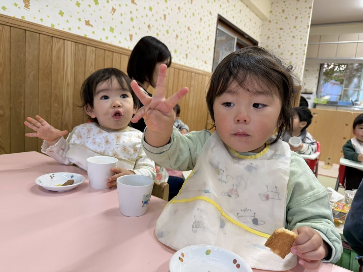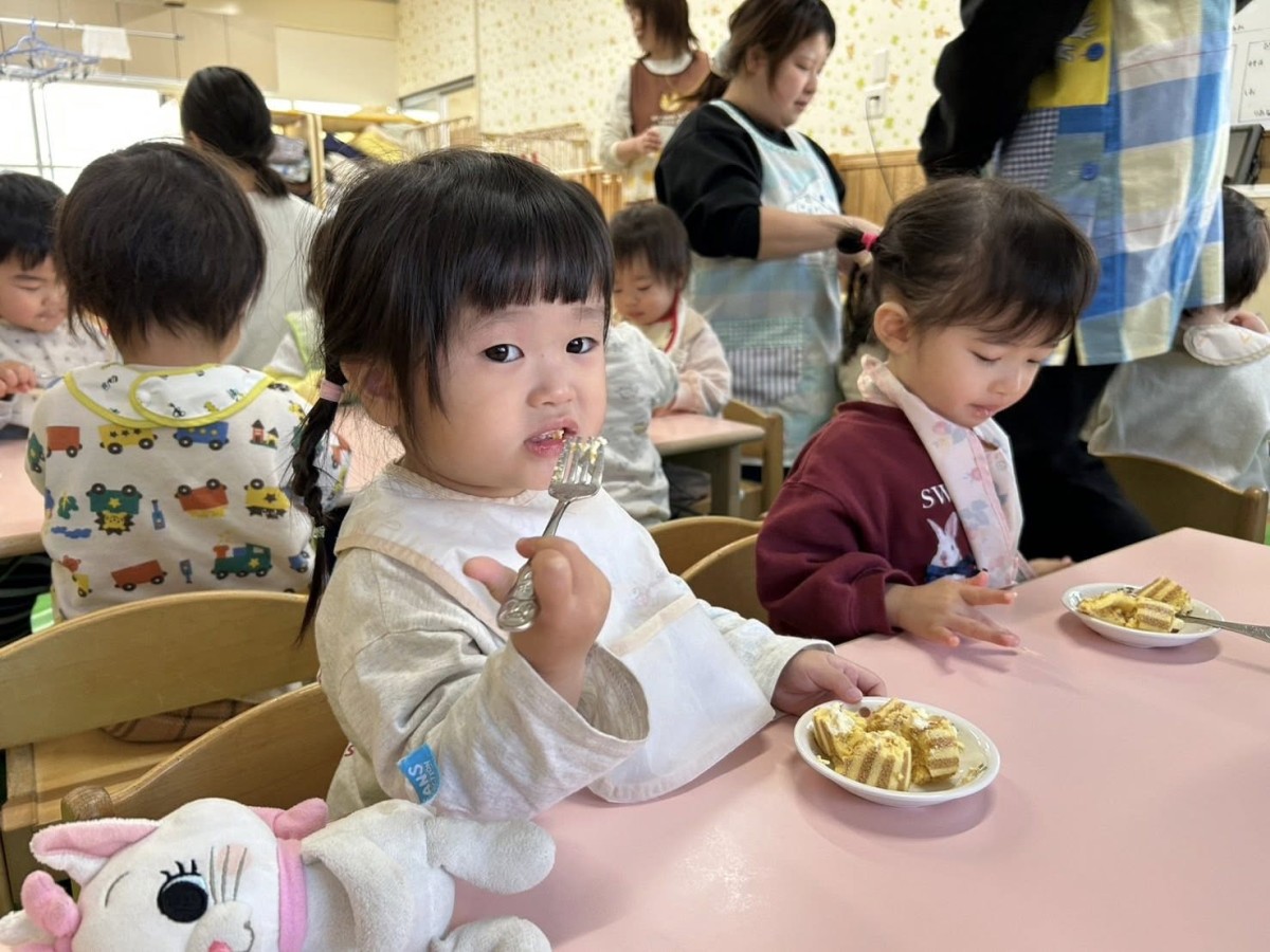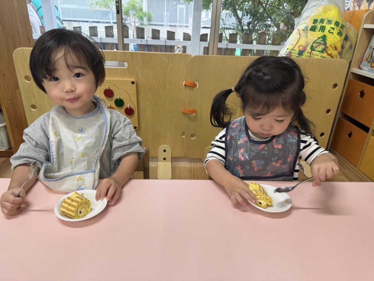 | 今日は10月のお誕生会に参加しました。ハッピーバースデーの音楽が流れると手拍子をして歌を口ずさんでいます。「おめでとう!」と手を振り皆でお祝いしました。おやつのケーキ、とても美味しかったのか「おかわり!」と元気な声がたくさん聞こえました。 |