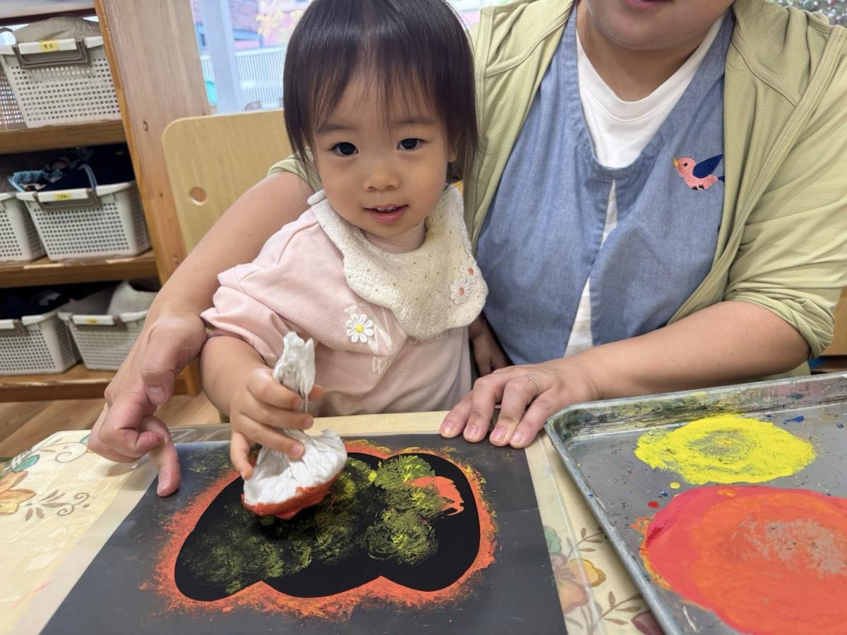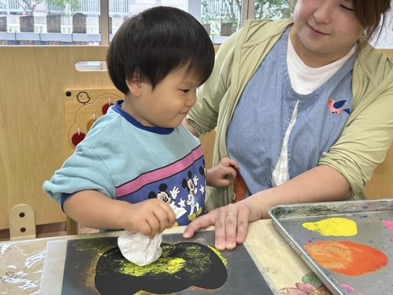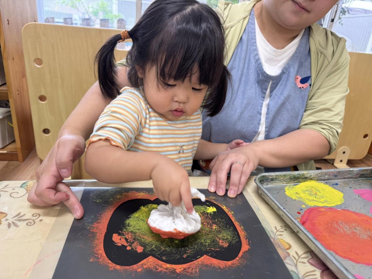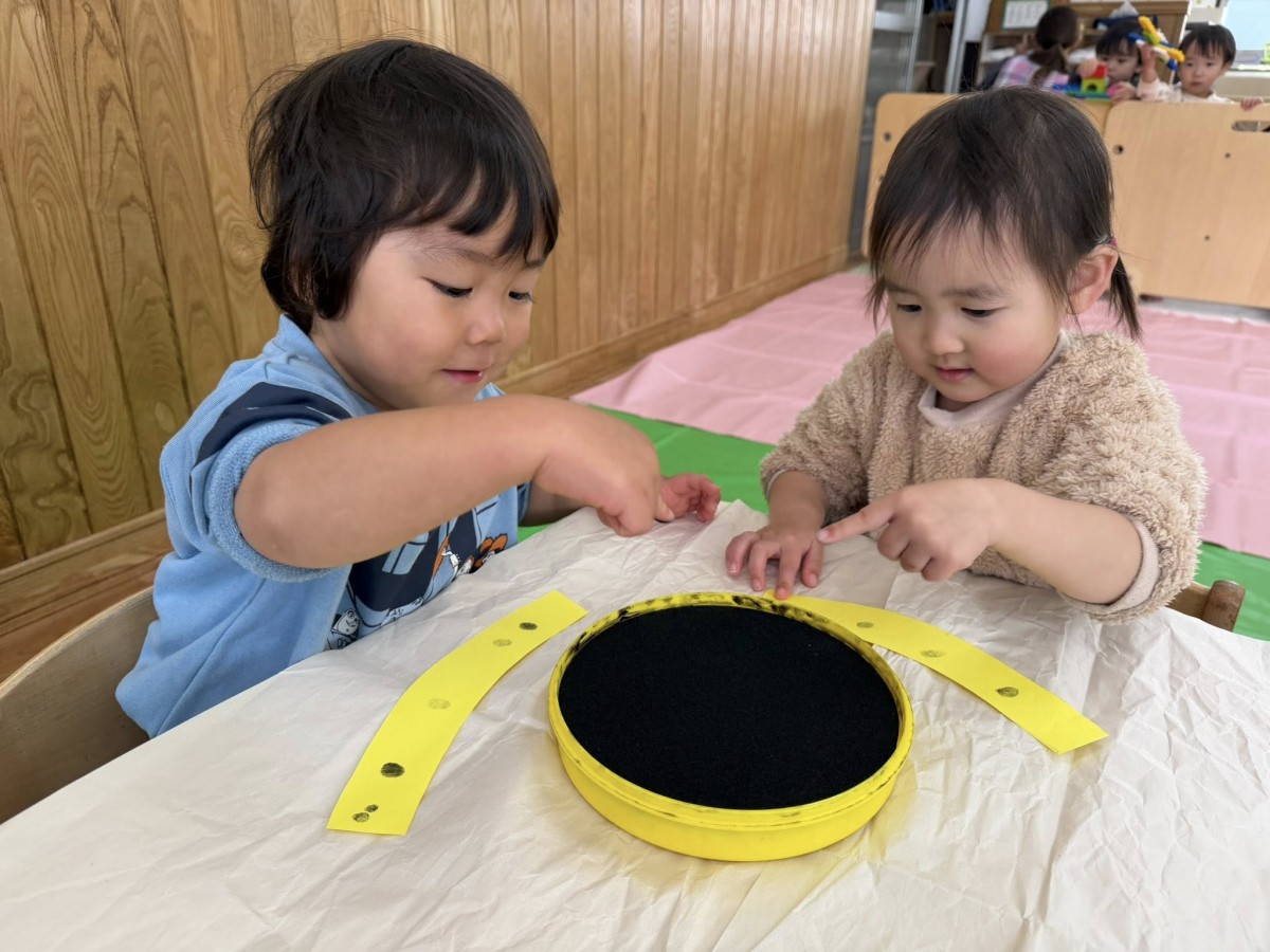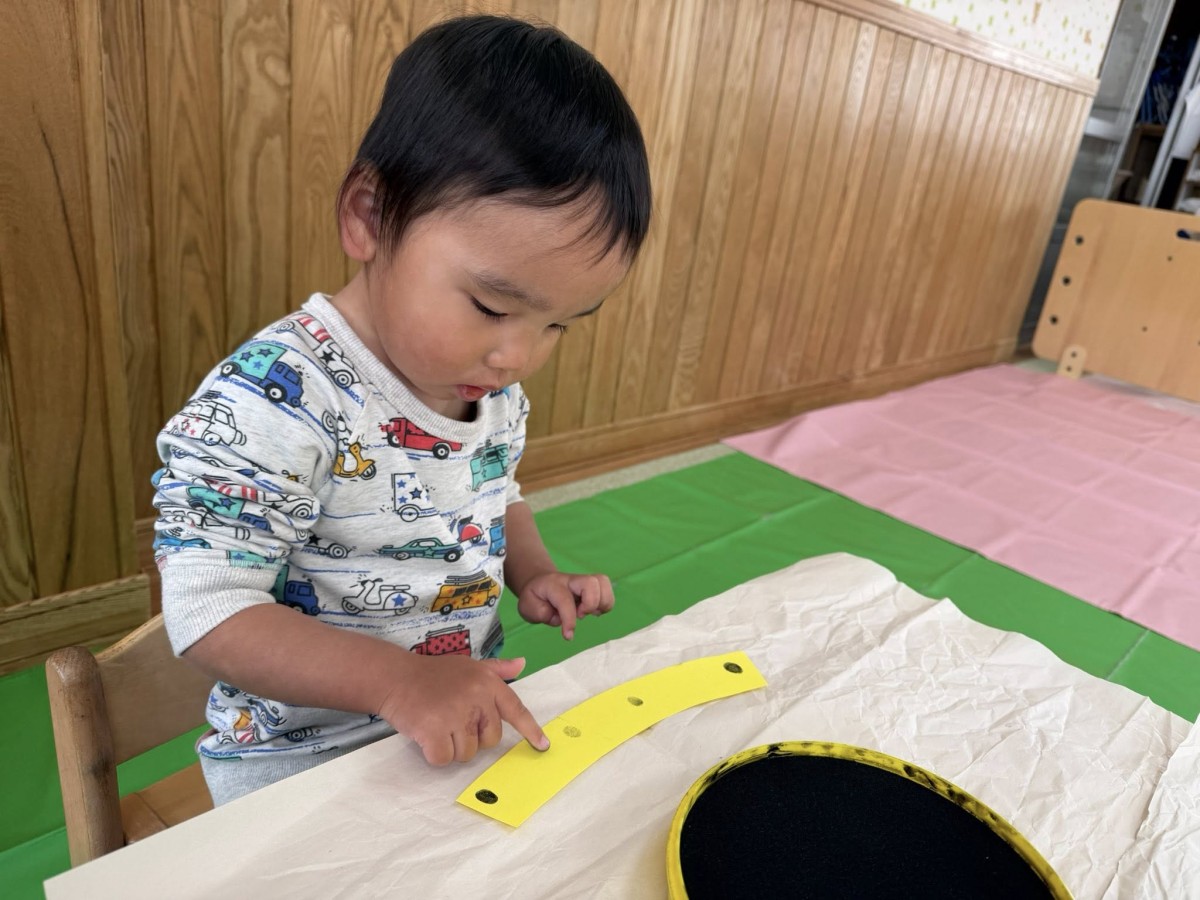 | 今日は室内でお製作や机上遊び、おままごと遊びをして過ごしました。お製作では紙を丸めたものに絵の具をつけてスタンプのようにポンポンと押しました。おままごと遊びでは、動物のぬいぐるみにご飯を食べさせてあげたり、フライパンに食べ物を乗せて「ジュージュー」とお料理している姿が見られました。 |