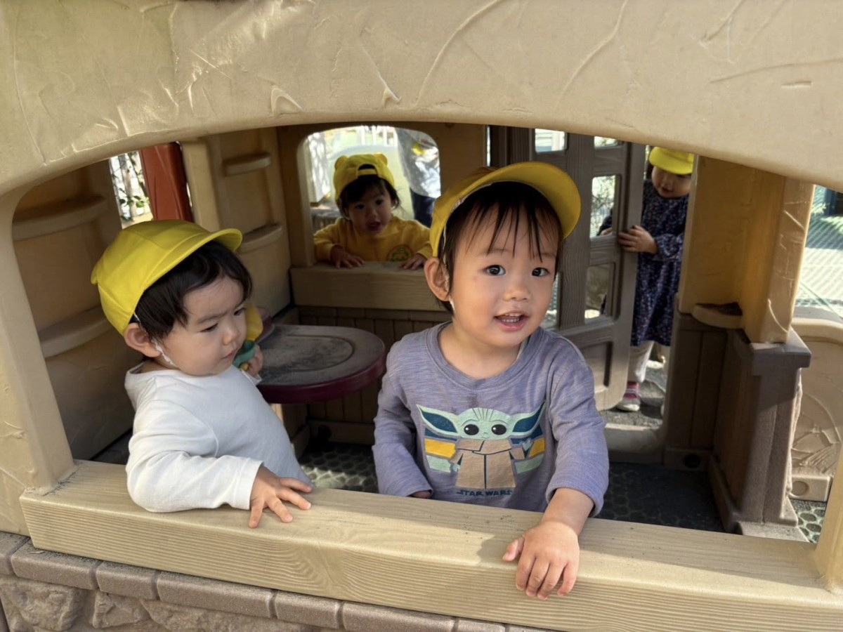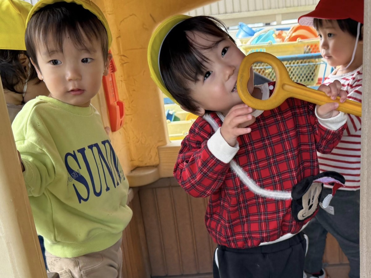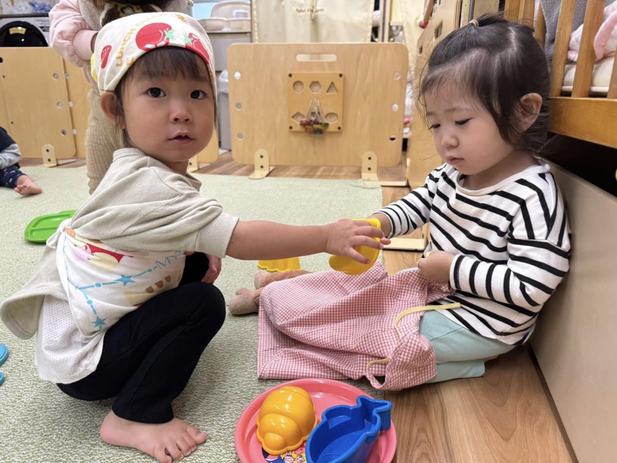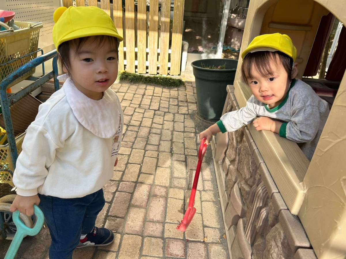 | 園庭で遊びました。お砂場では砂を容器に入れてお弁当やアイスを作って「みてみて〜」と嬉しそうに見せてくれます。スモールハウスに入る時は「ピンポーン」と言うと「はーい、どうぞ〜」とお返事してくれるお友達もいました。午後は室内で過ごしました。読み聞かせでは一緒に手遊びをしたり、絵本のセリフを一緒に読んで楽しむ姿が見られました♪ |