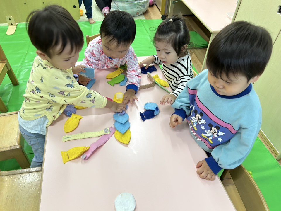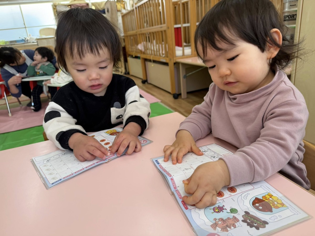 | 室内で過ごしました。机上遊びではお絵描きや紐通し、ボタンはめをしました。指先を使ってボタンをはめようと頑張っています。「自分で!」と集中して真剣な表情が見られました。おままごとでは、食べ物が乗ったお皿を囲んで、ハッピーバースデーを歌いながらお誕生会ごっこをしていました。午後は小児科検診を行いました。お口をあーん!と大きく開けて頑張りました! |