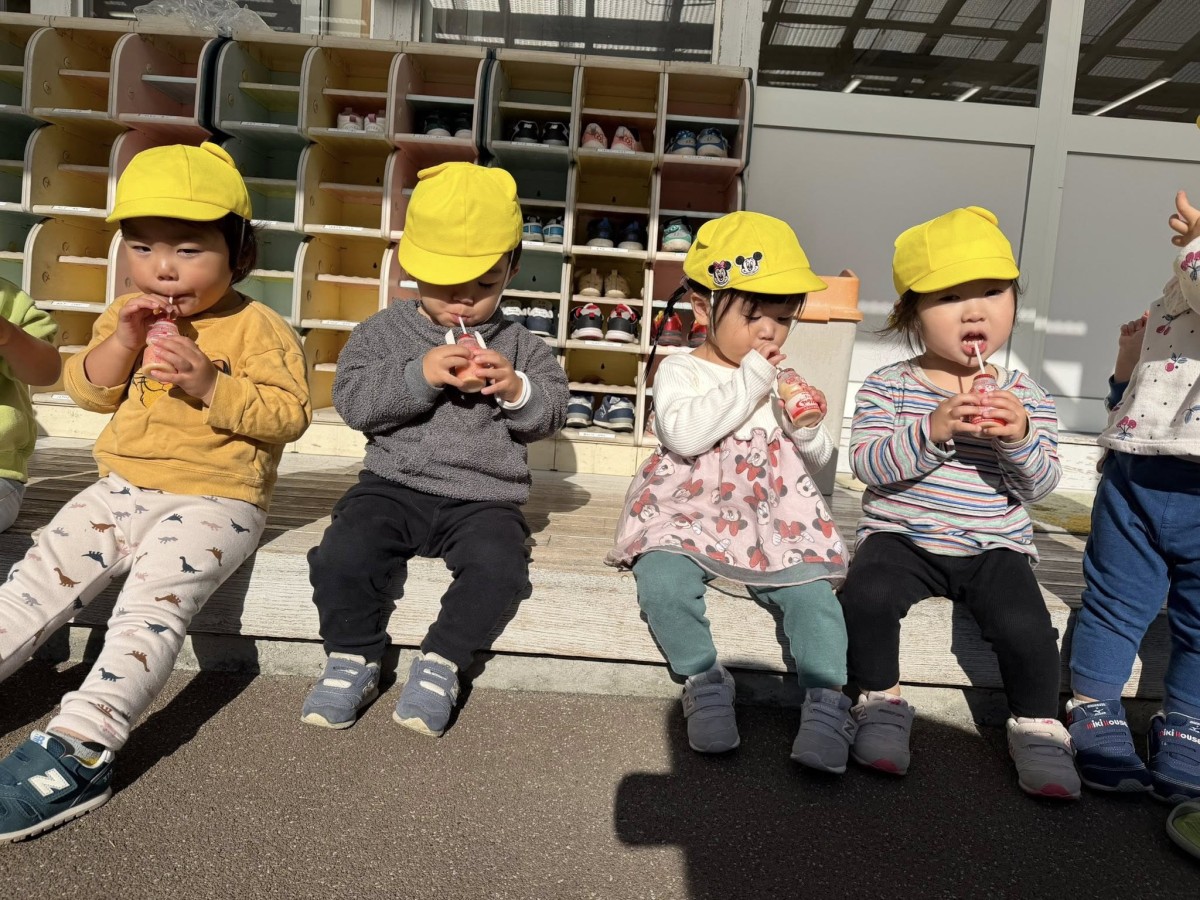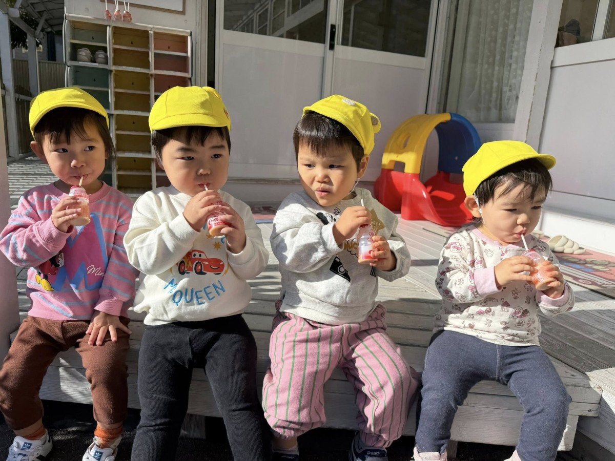 | 朝の体操の後、廊下に座ってヤクルトを飲みました!飲み終わると「終わったよ!」「ポイする」と教えてくれます♪その後は園庭で遊びました。最近はお友達を誘って遊ぼうとする姿をよく見かけます。「おいでー」「あっち行こう」など簡単な言葉ですが、会話のやり取りでの関わりが増えてきました。お部屋に戻ってからは発表会の練習をしました。 |