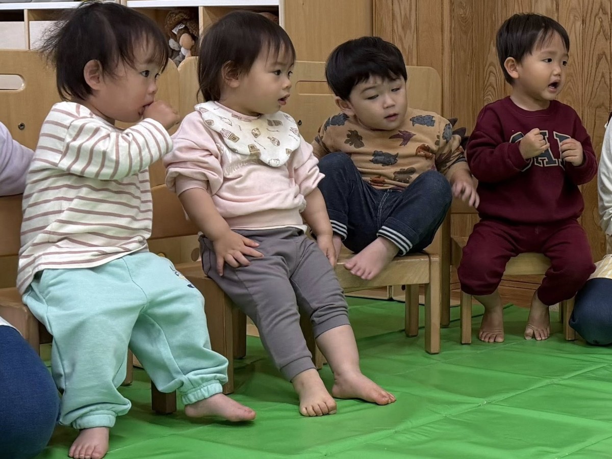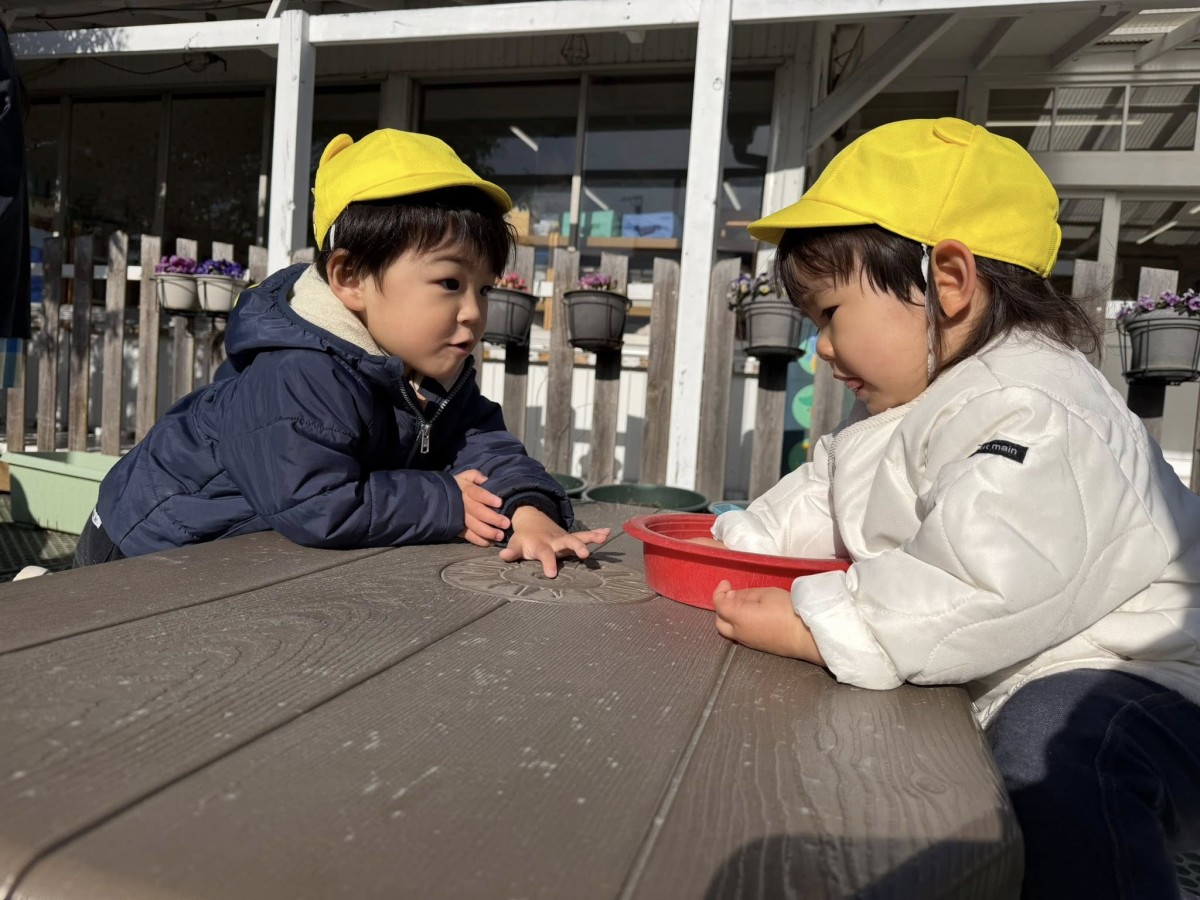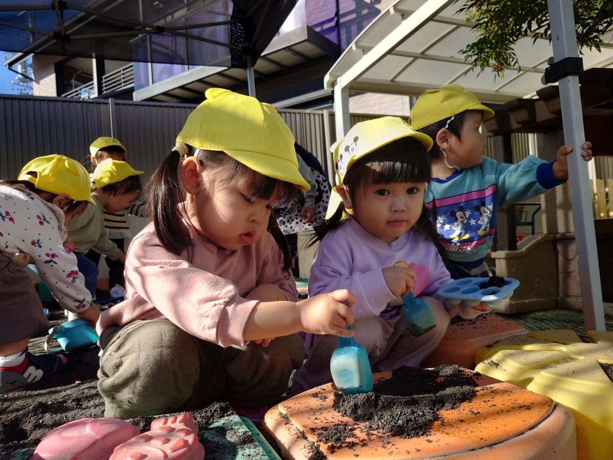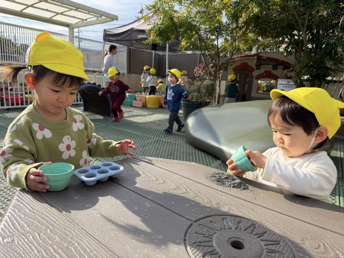 | 園庭で遊びました。先生やお友達と追いかけっこをしたり、砂を入れた容器に落ち葉や花びらを入れて飾り付けを楽しむ姿が見られました。お部屋に戻ってからは発表会の練習をしました。椅子に並んで座り、大きな声で手遊びを楽しんでくれました♪ |