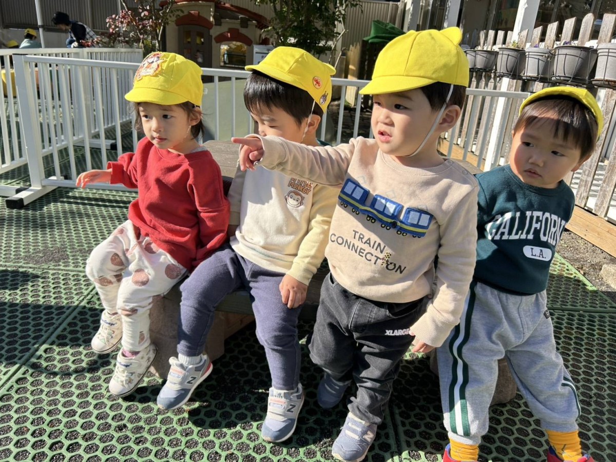 | 園庭で遊びました。空を見上げて飛行機を見つけると「あ!いたよ!」と嬉しそうに教えてくれます。皆で手を振って見えなくなると「どこかな?」「またくるかな?」とキョロキョロ探す姿が見られました。 |