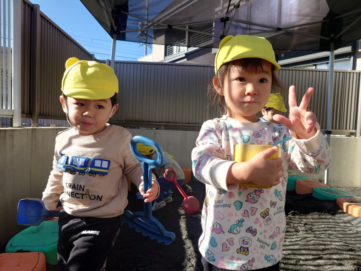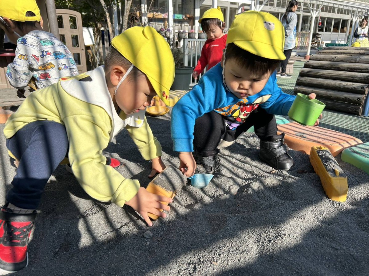 | 園庭で遊びました。お砂場では型抜きやお山を作りました。その上に車や生き物の型を乗せて「車のおやま!」「ちょうちょのおやま!」とお話していました。小さなお山を一人で作ると「先生みて!出来たよ!」と嬉しそうに教えてくれます。お部屋に戻ってからは発表会の練習をしました。お椅子に座り、手遊びや絵本遊びをしました。 |