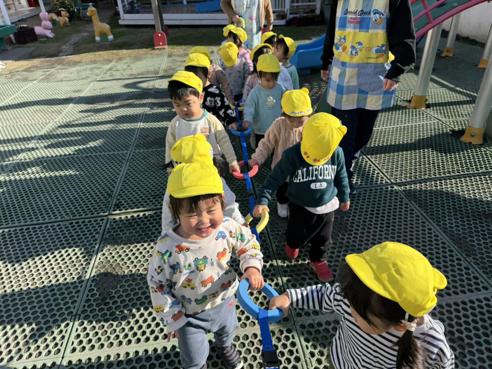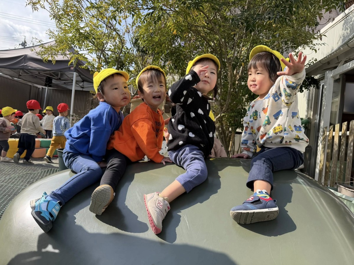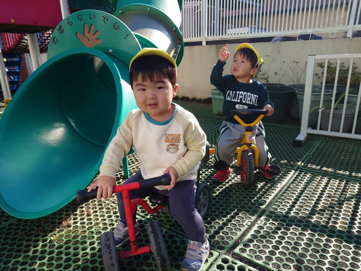 | 園庭で遊びました。4輪バイクや3輪車に乗ってドライブを楽しんでいます。「こっちおいでー!」「一緒に行こう?」などお友達同士でお話しながら走っていました。ヘリコプターの音が聞こえると「どこどこ?!」と探して見つけると「おーい!!」と大きな声で手を振っいました。 |