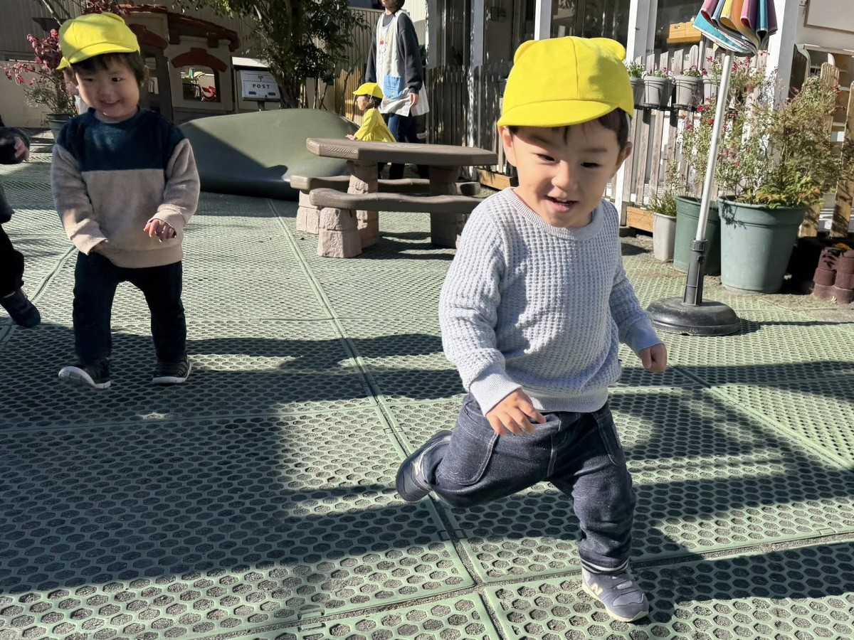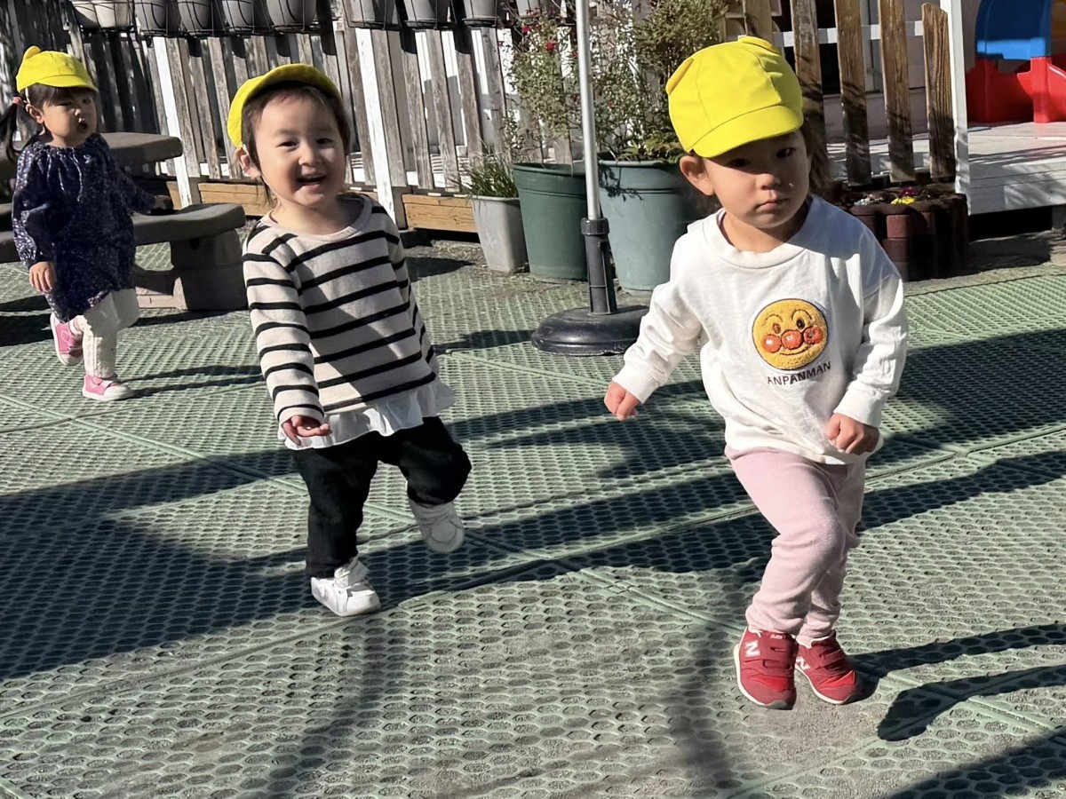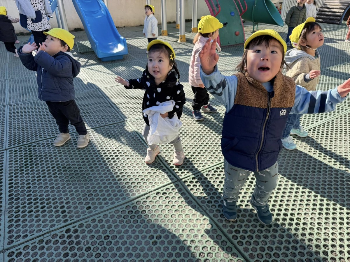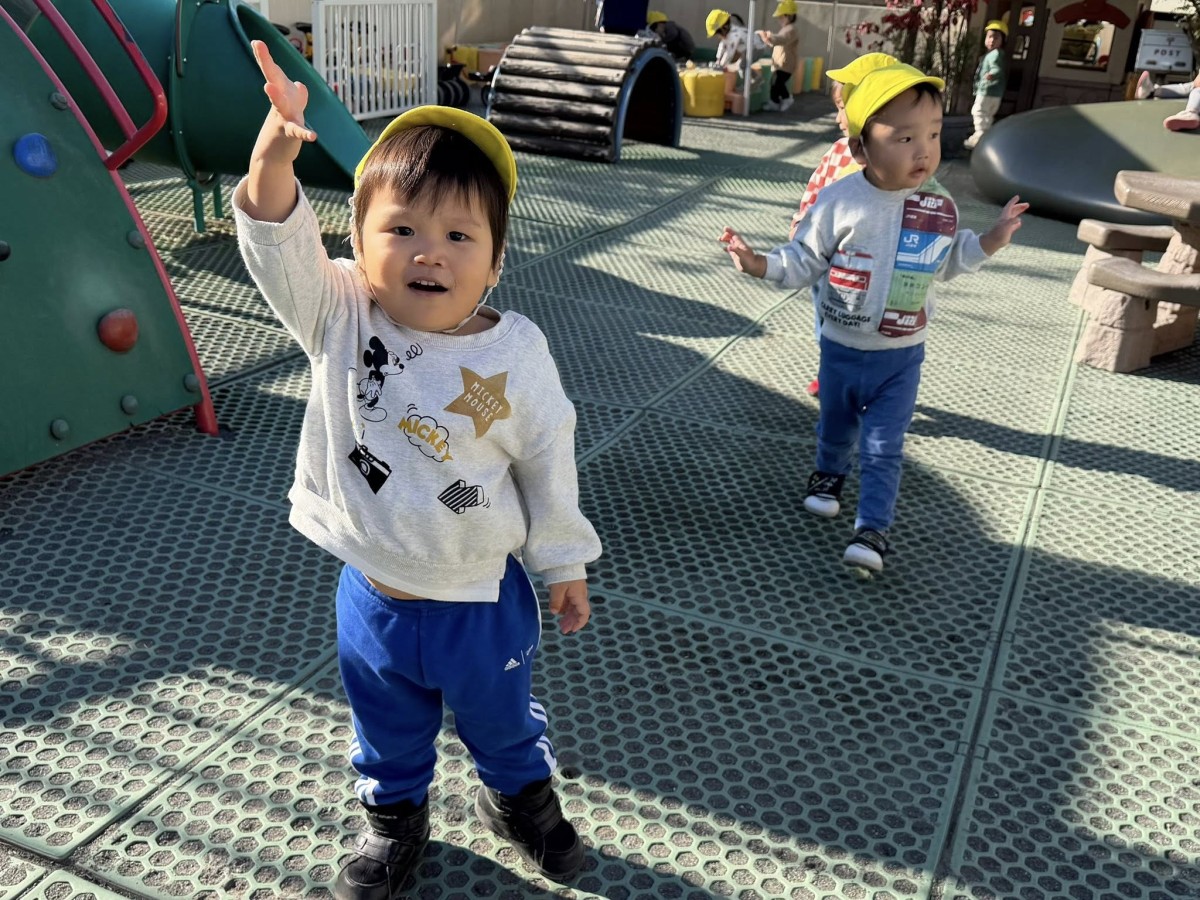| 園庭で遊びました。空を見上げて飛行機を見つけると「いたよ!」と教えてくれて、どこにいる?と聞くと「あそこだよ!」と指をさして一生懸命教えてくれる姿が可愛いです♪今日の追いかけっこでは飛行機の真似をして「ブーン!」と両手を広げながら走って楽しむ姿が見られました。 |