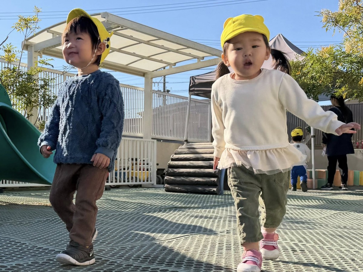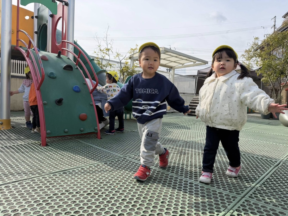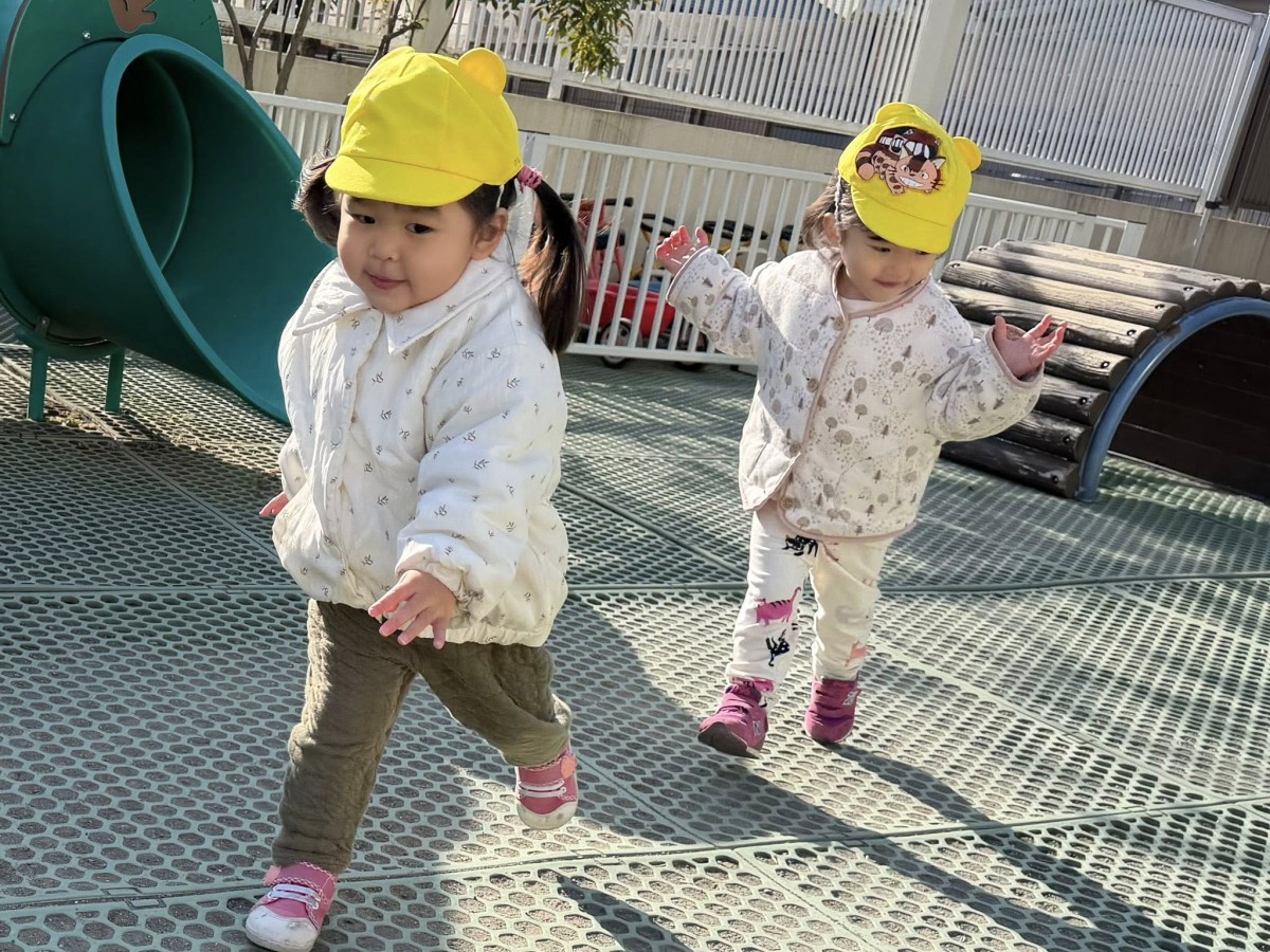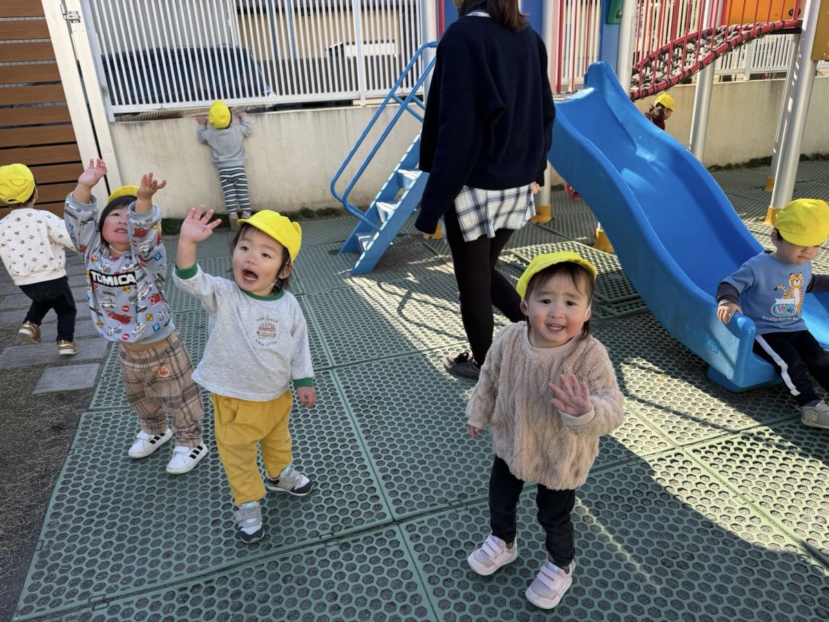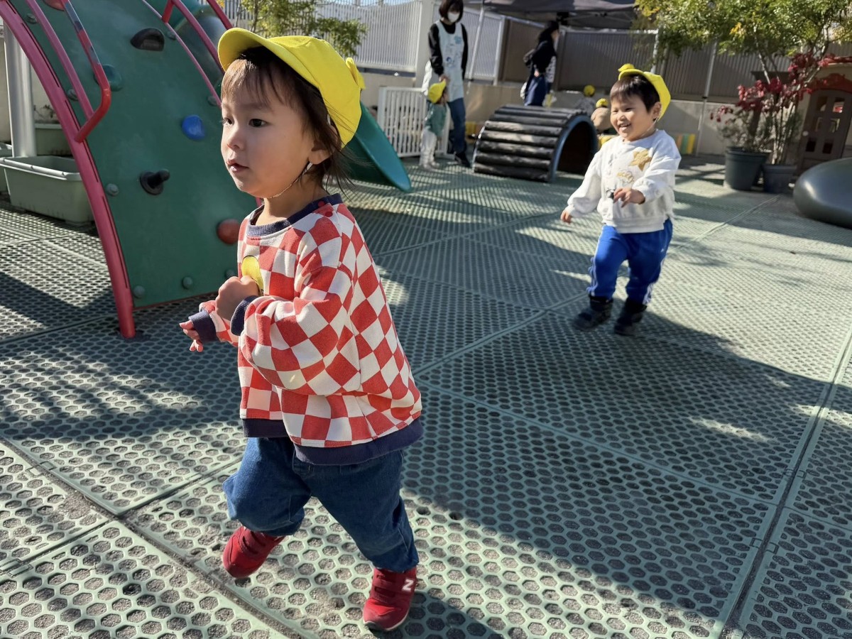 | 園庭で遊びました。空を見上げて飛行機を見つけると「いたよ!」と教えてくれて、どこにいる?と聞くと「あそこだよ!」と指をさして一生懸命教えてくれる姿が可愛いです♪今日の追いかけっこでは飛行機の真似をして「ブーン!」と両手を広げながら走って楽しむ姿が見られました。 |