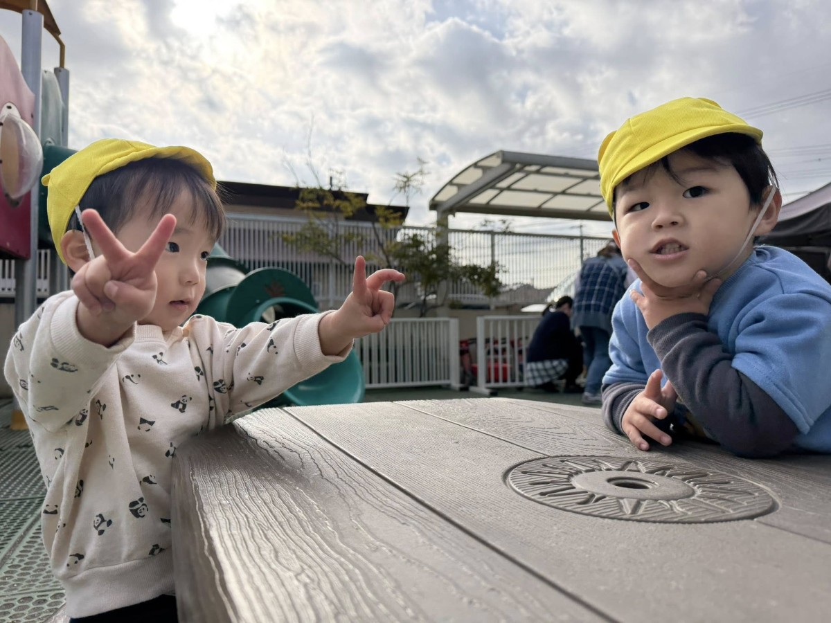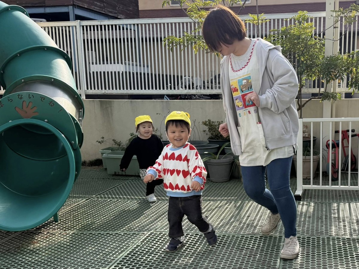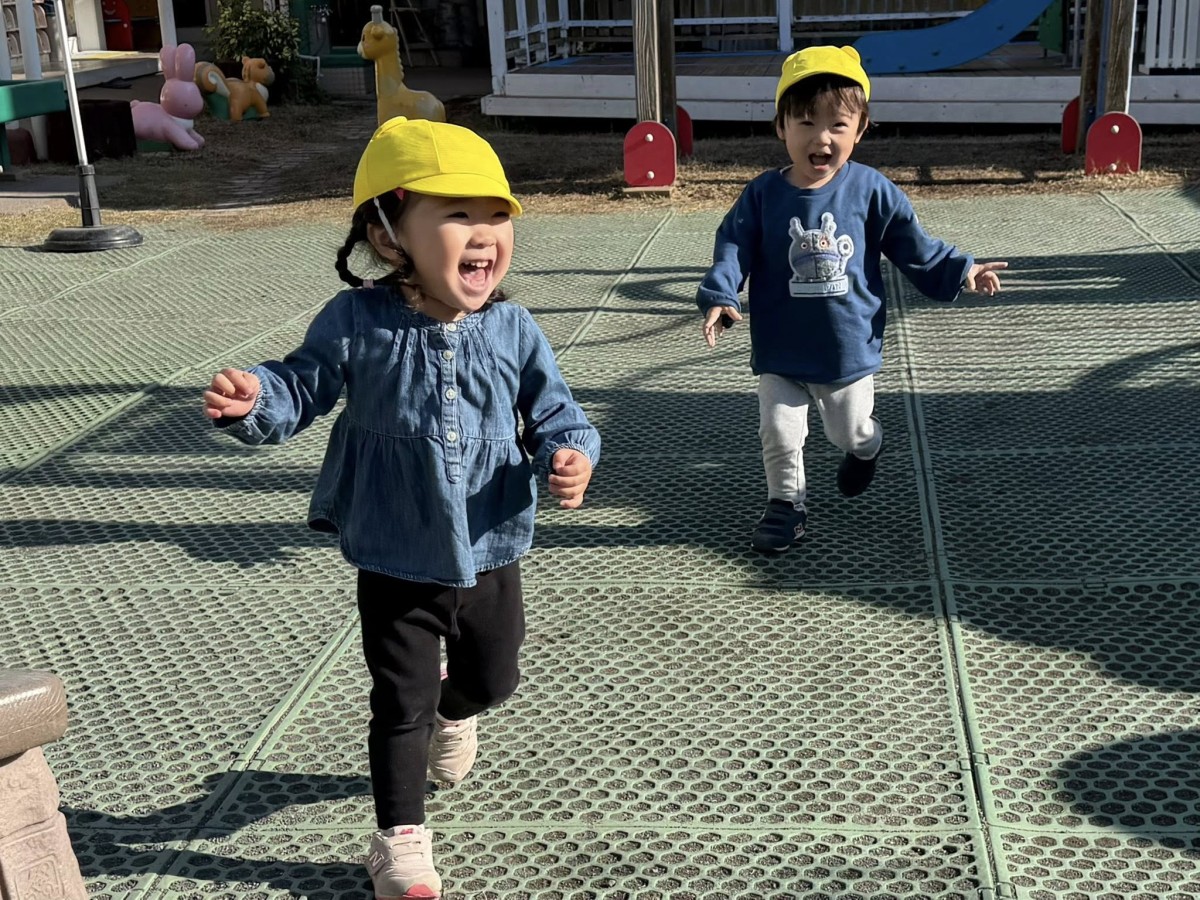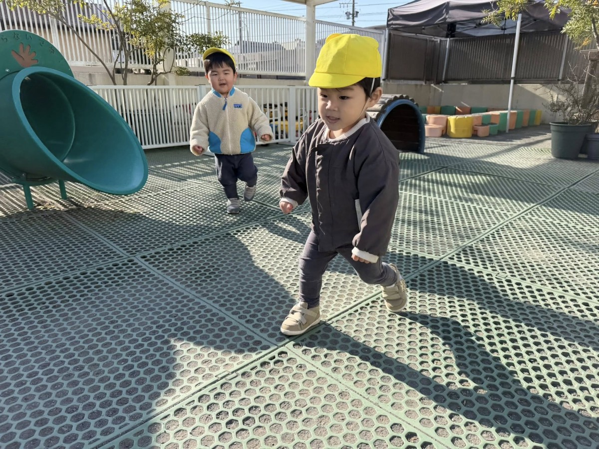 | 園庭で遊びました。空を見上げて飛行機を見つけると「いたよ!」と教えてくれて、どこにいる?と聞くと「あそこだよ!」と指をさして一生懸命教えてくれる姿が可愛いです♪今日の追いかけっこでは飛行機の真似をして「ブーン!」と両手を広げながら走って楽しむ姿が見られました。 |