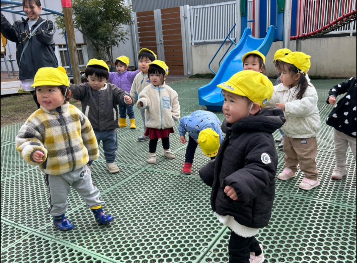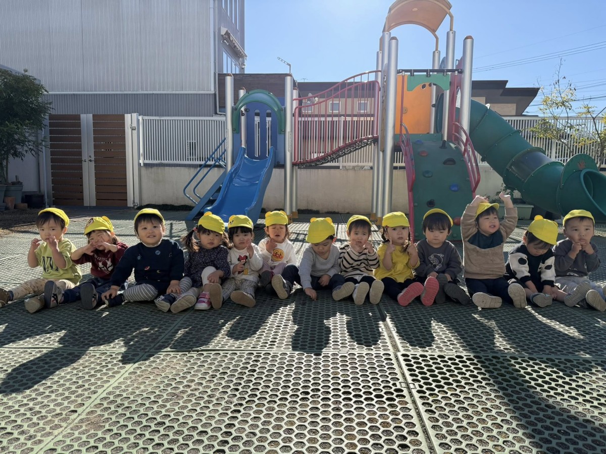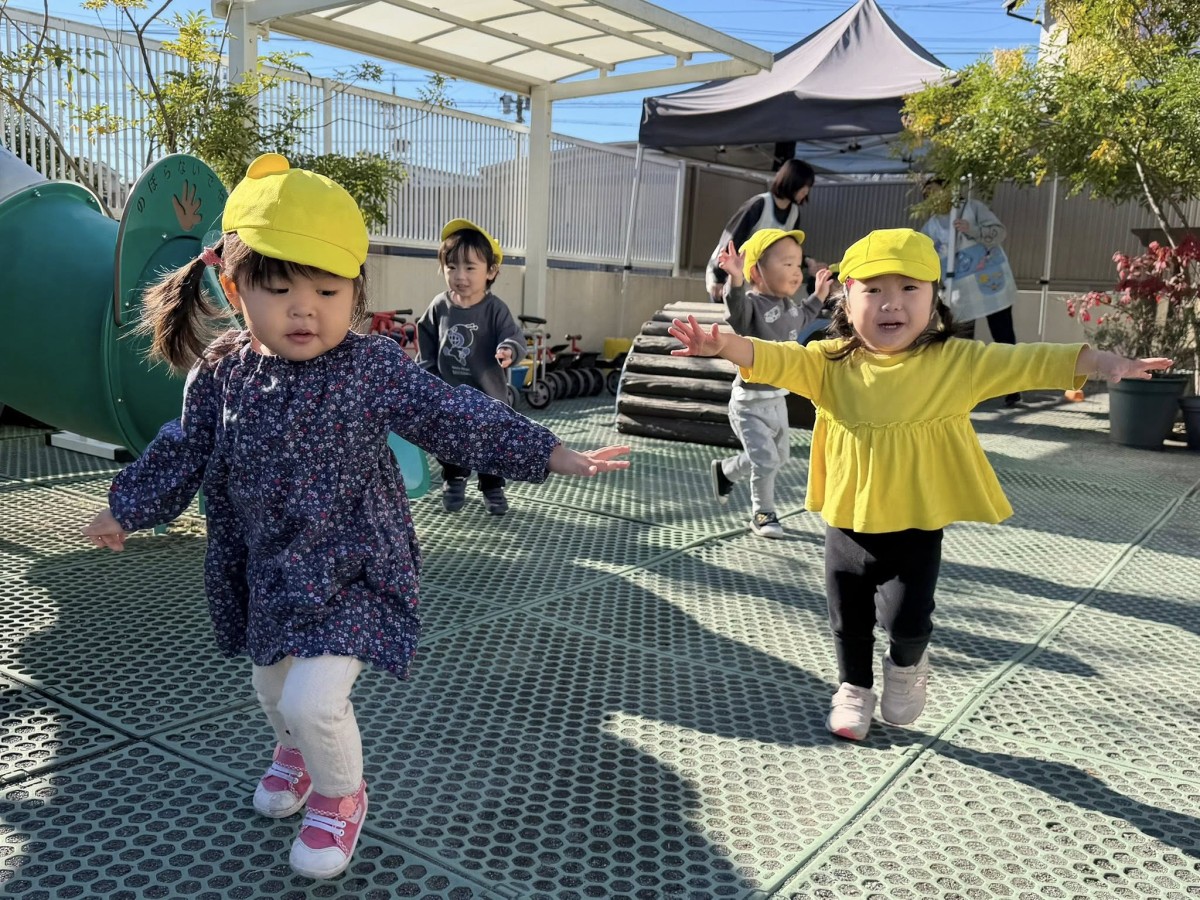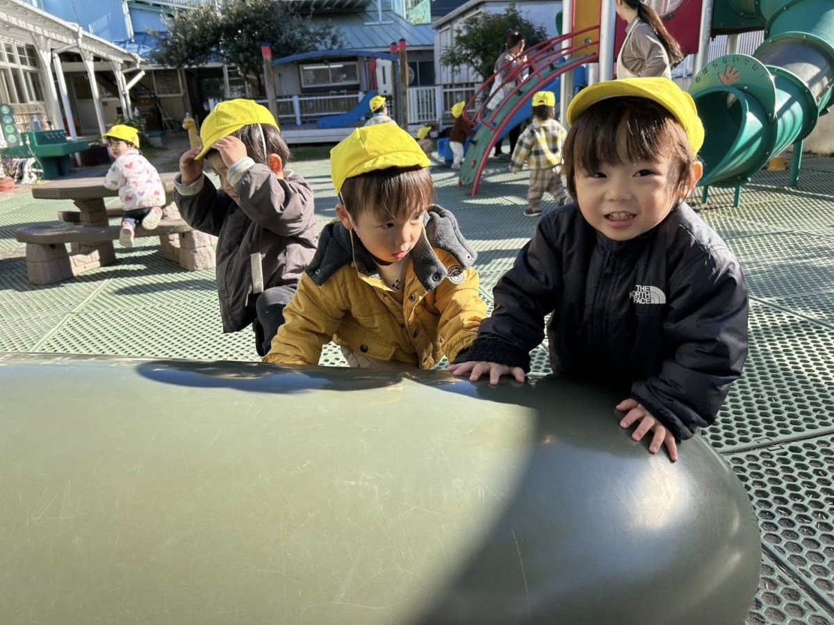 | お友達と追いかけっこをしたりお砂場で遊ぶひよこさん♪遊び方も少しずつ変わってきて、追いかけっこでは滑り台の下に座って隠れんぼをしてみたり、お砂場では「いらっしゃいませ〜」とお店屋さんのように楽しむ姿が見られるようになりました。「おおきないし」では「これ重いねぇ」「動かないよー!」と話す声も聞こえてきました!お部屋に戻ってからは発表会の練習をしました。「さくらんぼのマンボ」の振りも覚えて楽しく踊っています♪ |