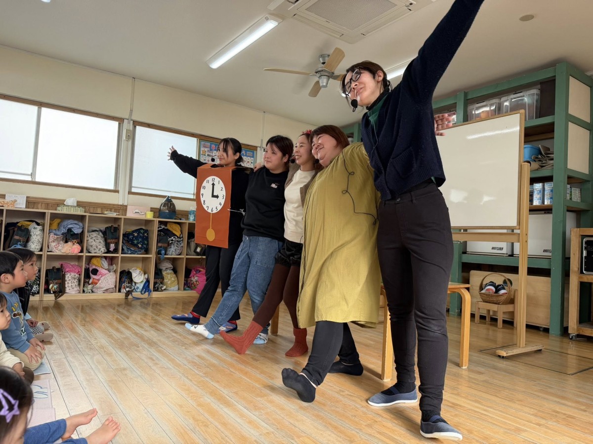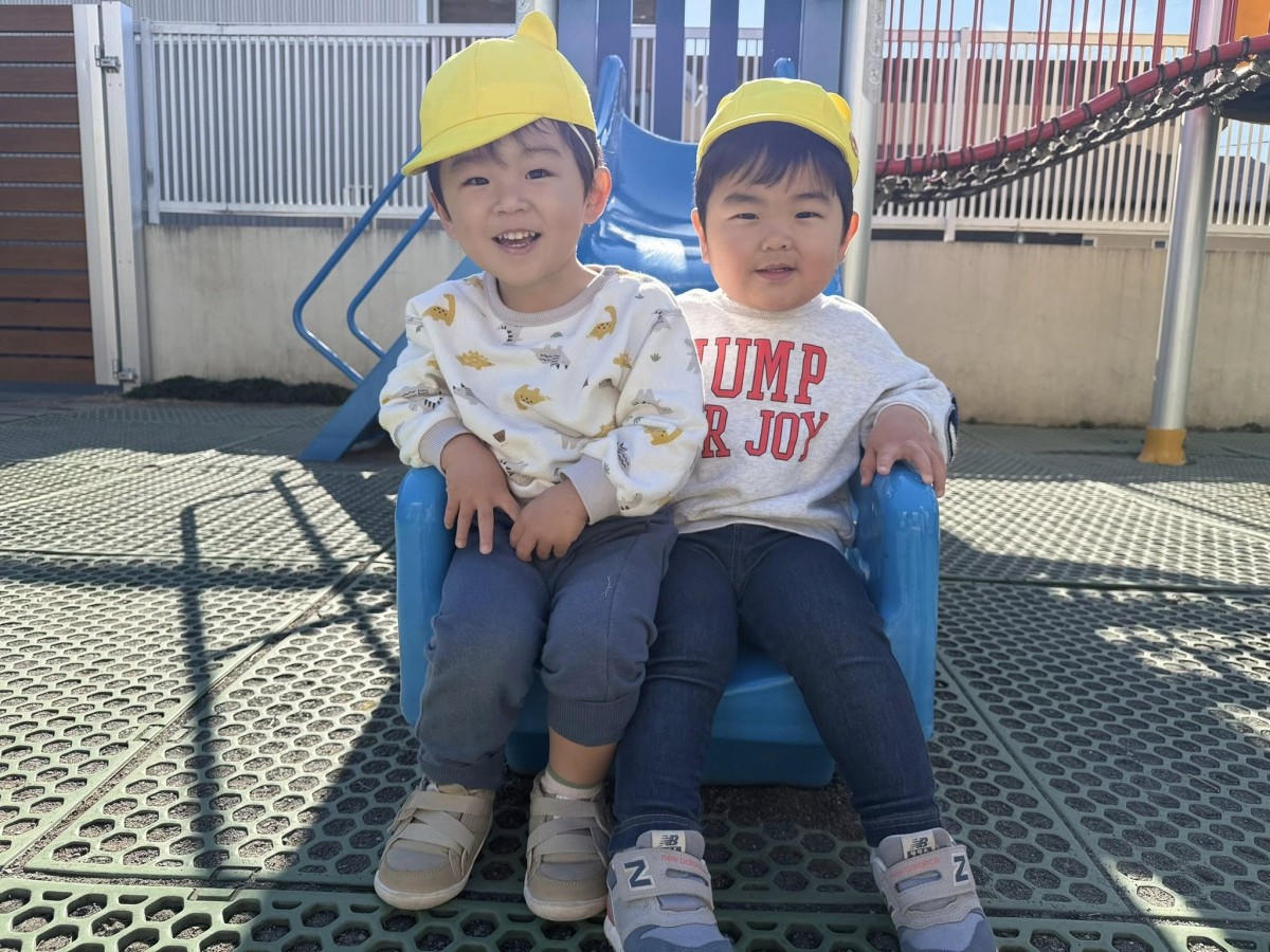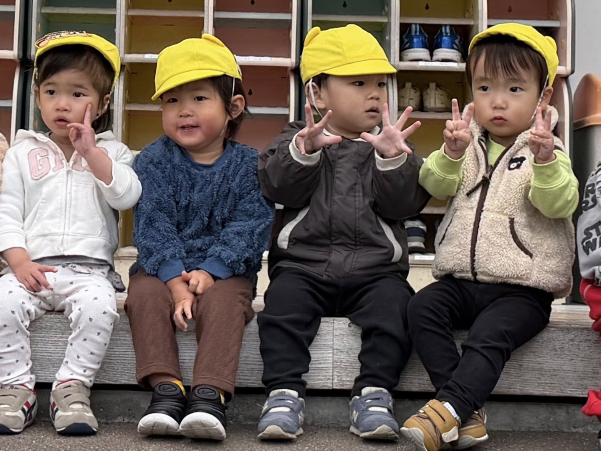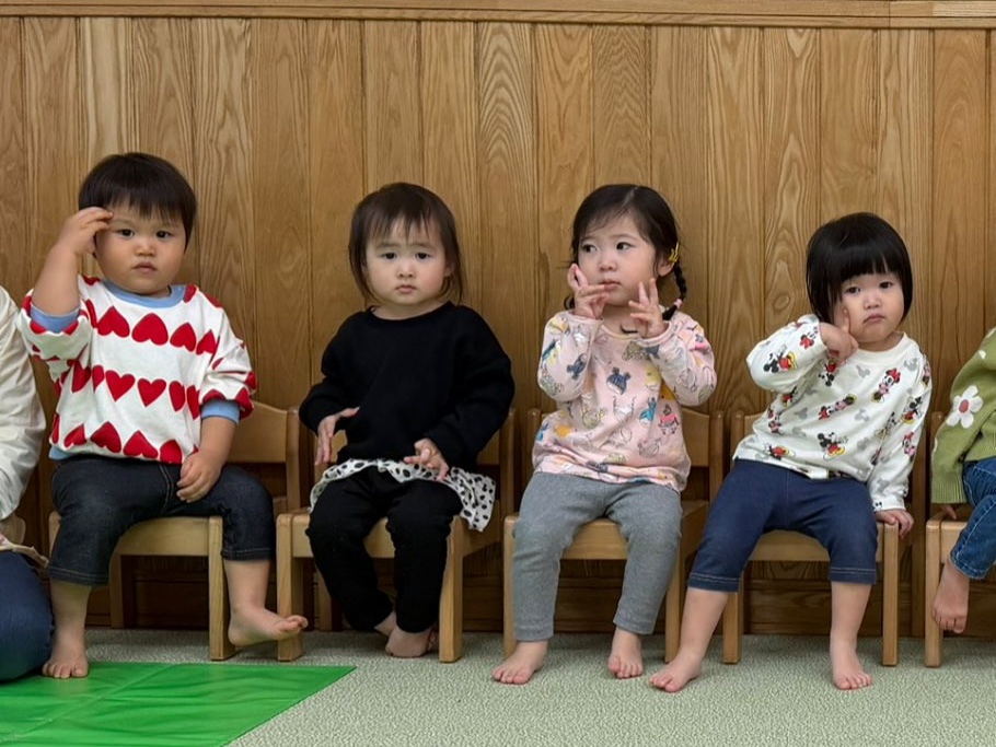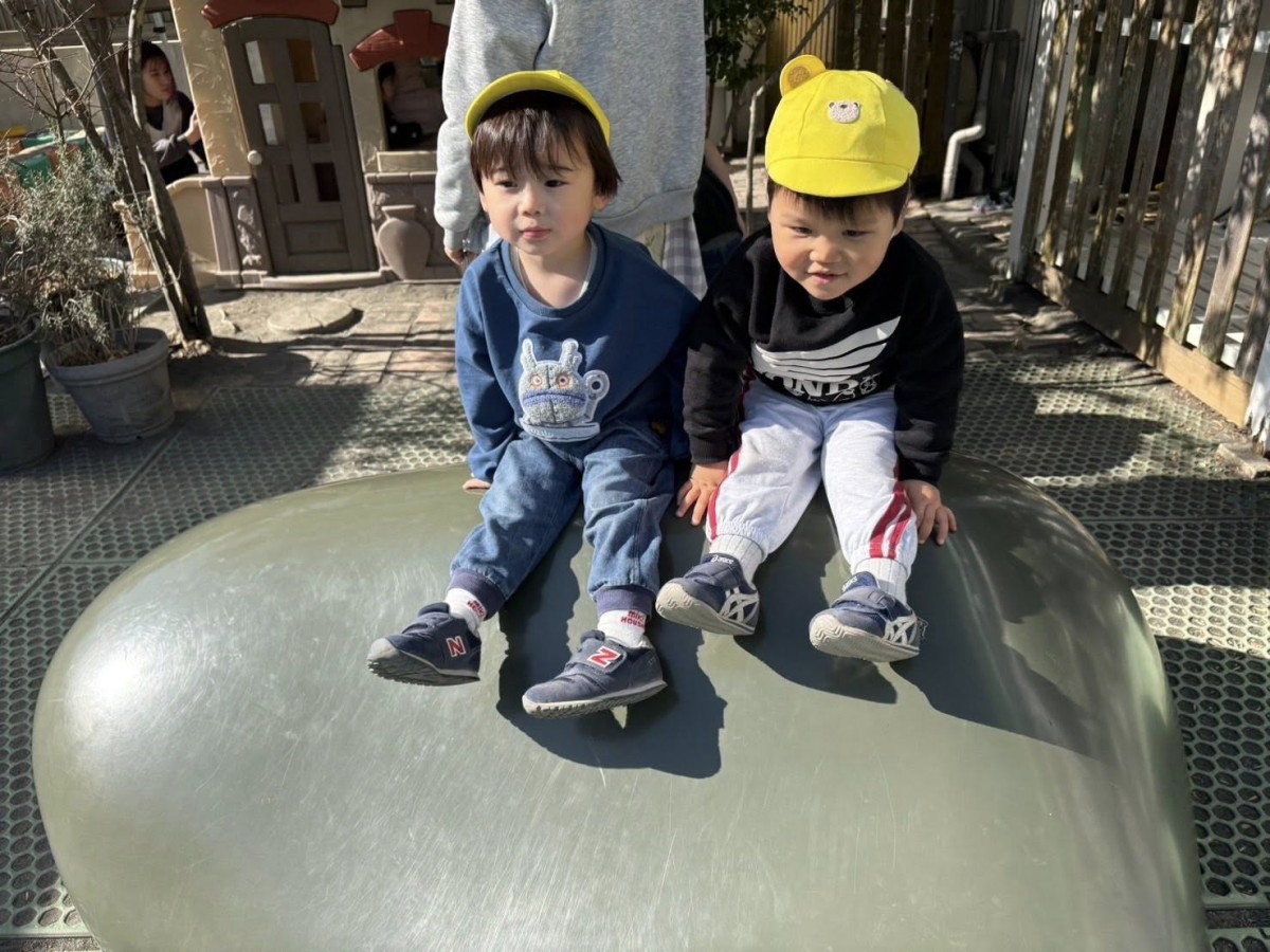 | お友達と追いかけっこをしたりお砂場で遊ぶひよこさん♪遊び方も少しずつ変わってきて、追いかけっこでは滑り台の下に座って隠れんぼをしてみたり、お砂場では「いらっしゃいませ〜」とお店屋さんのように楽しむ姿が見られるようになりました。「おおきないし」では「これ重いねぇ」「動かないよー!」と話す声も聞こえてきました!お部屋に戻ってからは発表会の練習をしました。「さくらんぼのマンボ」の振りも覚えて楽しく踊っています♪ |