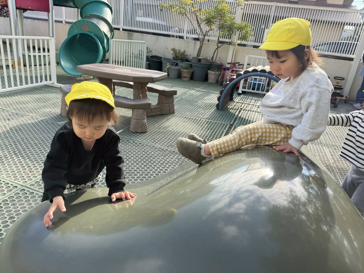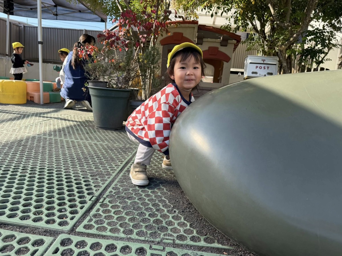 | 園庭で遊びました。雪虫が飛んでいるのを見つけると「これなーに?」「フワフワしてるね!」と触れようと手を伸ばす姿が見られました。追いかけっこでは途中太鼓橋の下に隠れて「どーこだ?」と隠れんぼをして楽しんでいました。 |