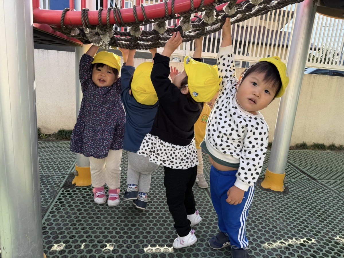 | 園庭で遊びました。遊具のロープに手を伸ばしてぶら下がろうと頑張っています。掴む事が出来ると「とどいたー!」と嬉しそうに教えてくれました!滑り台を楽しんでいる時に飛行機を発見!「どこどこ?」「あそこにいるよ!」とお友達同士で会話をしながら手を振っていました。 |