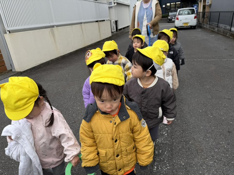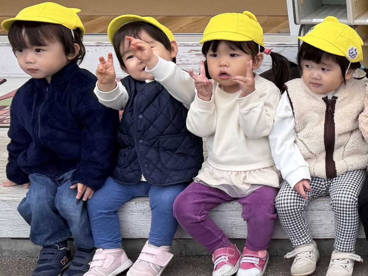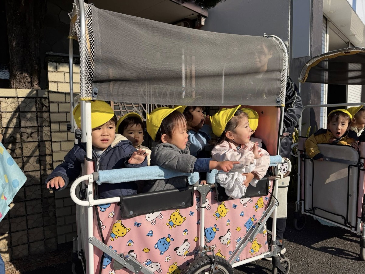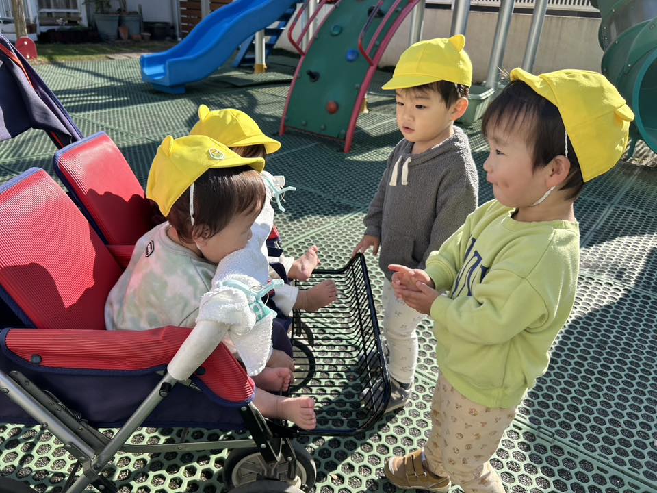 | 今日はベビーカーに乗ってお散歩に行きました。「バスいるかな?」とワクワクしているひよこ組さん。お目当てのバスは見れませんでしたが、ゴミ収集車やショベルカーなど働く車を見ることが出来ました!お部屋に戻ってからは発表会の練習をしました。 |