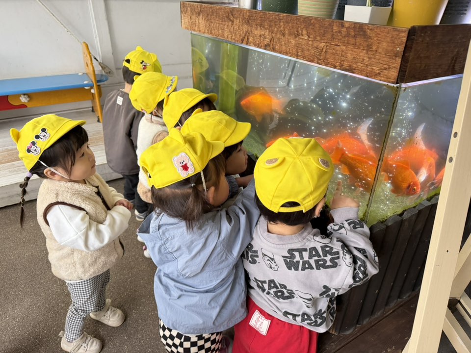 | 今日は園庭に出ようとしましたが雨が降って来たので金魚さんを見学してからお部屋に戻りました。金魚さんを見て「おっきいね」「たくさん泳いでるね!」とお話していました。室内ではお絵描きやレゴブロックで遊びました。 |