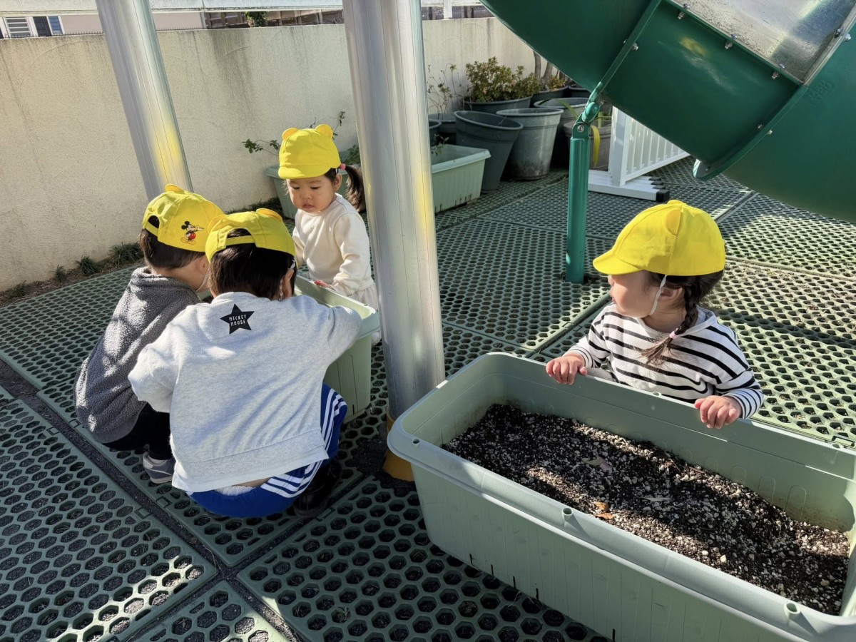 | 今日は園庭で遊びました。プランターを渡り歩きながら「これは何?」と興味を示しながら探検しています。乗り物に乗って追いかけっこも楽しんでいました。 |
