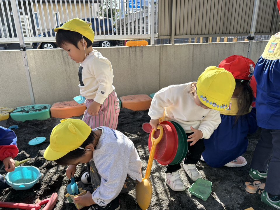 | 今日は園庭で遊びました。久しぶりのスモールハウスやお砂場遊びでみんな嬉しそうにそれぞれ好きなところへ向かっていました。カップやふるい、シャベルを使って食べ物や車など様々なものを作っています。少しだけシャボン玉でも遊びました。 |