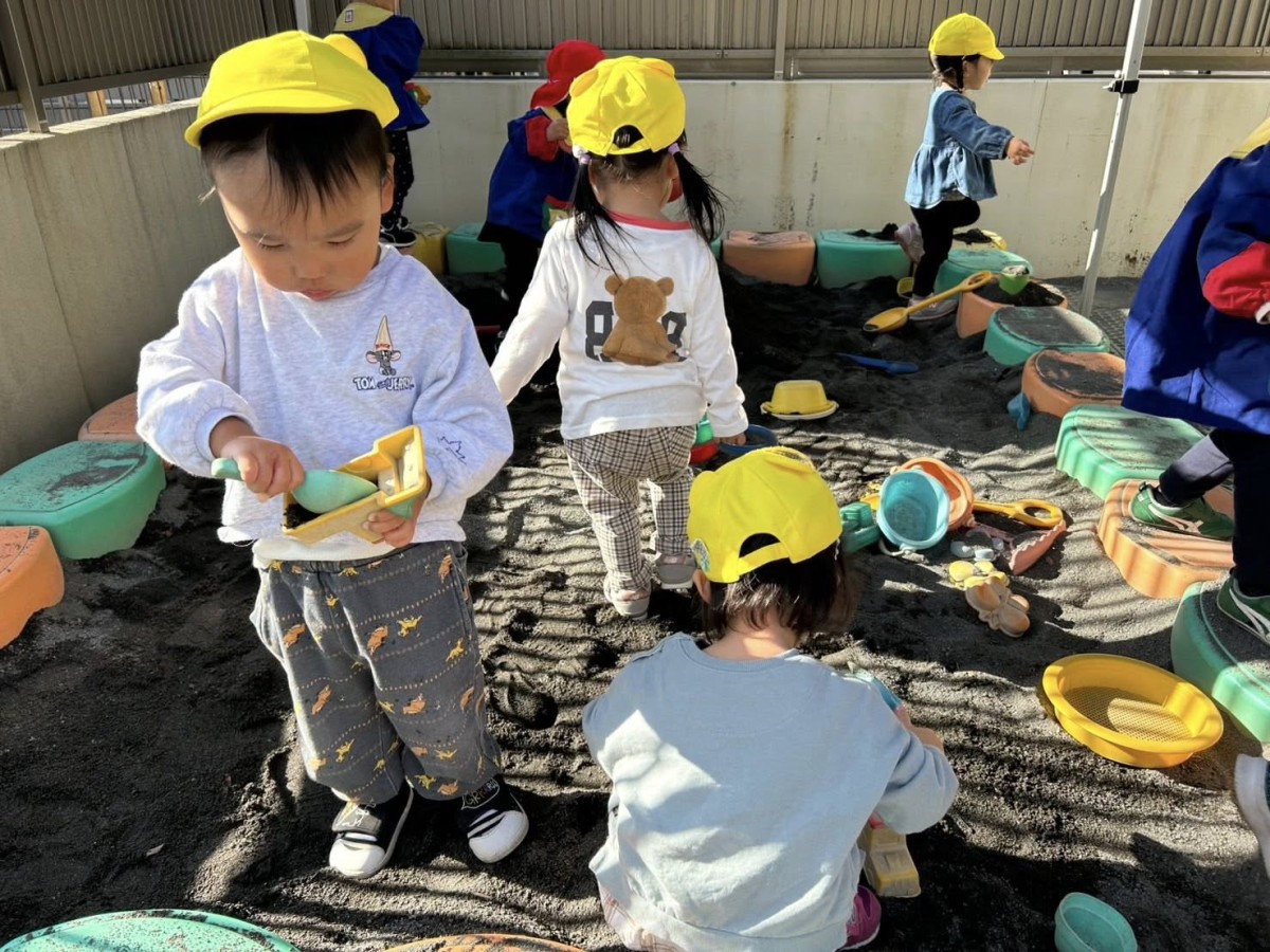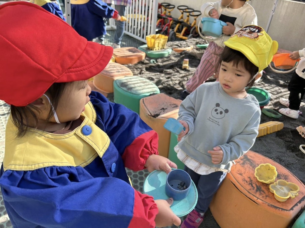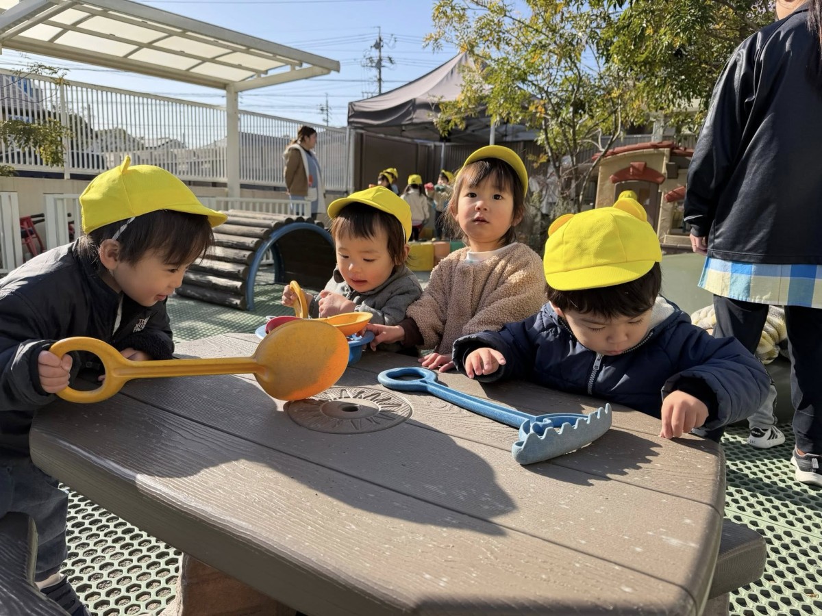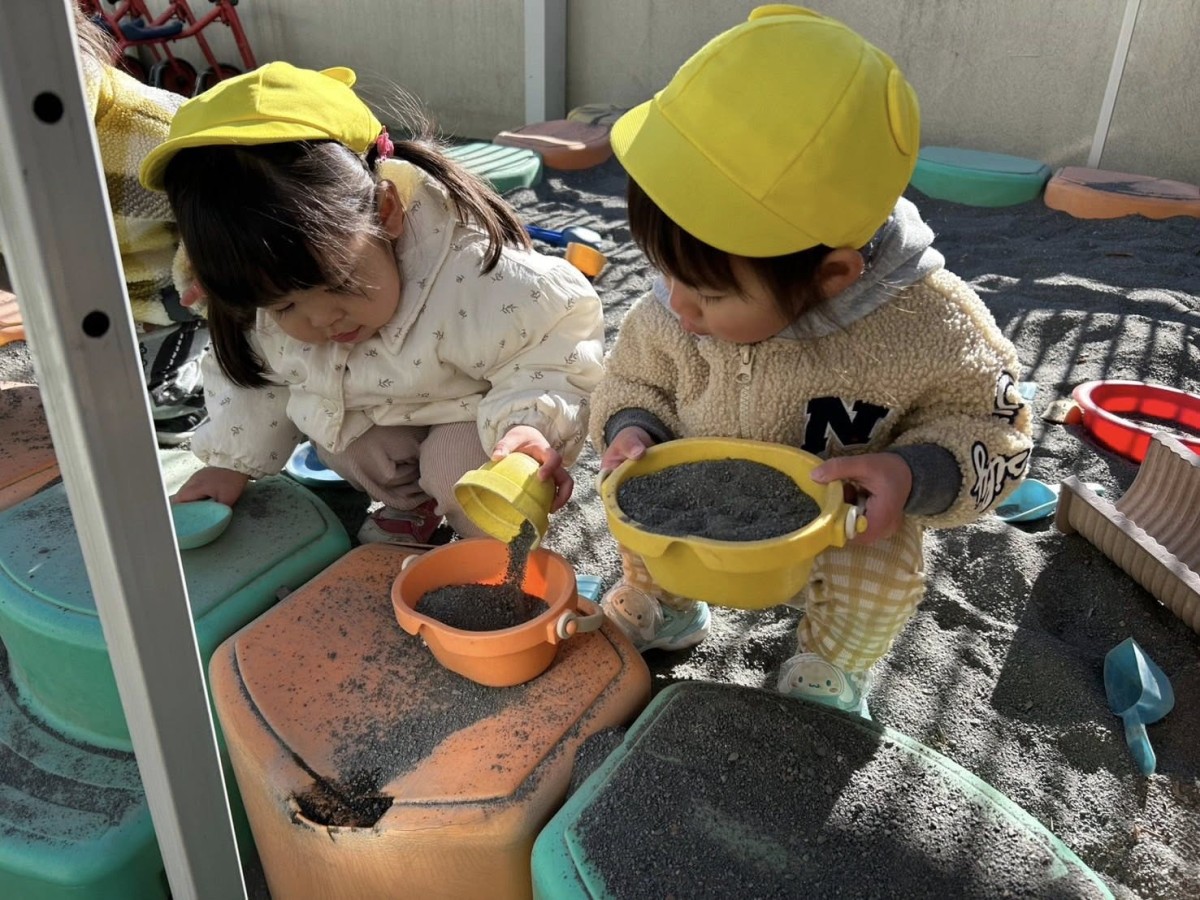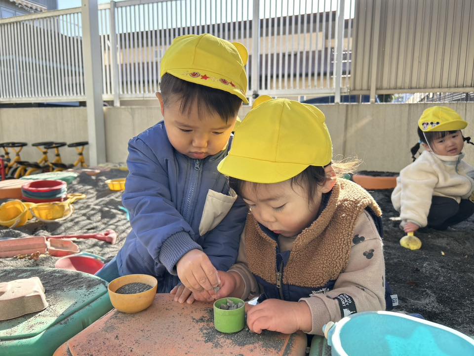 | 園庭で遊びました。お砂場ではお友達と一緒に穴を掘ったり、車が通れるように道路を作って遊んでいます。カップにお砂をたくさん入れたものをご飯に見立てて、「食べてー!」とお友達や先生に食べさせてくれました♪ |
