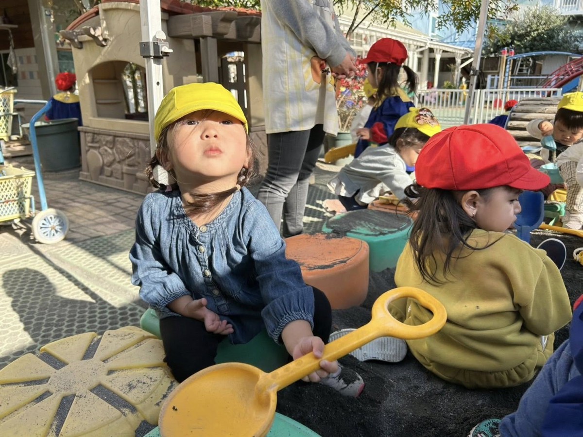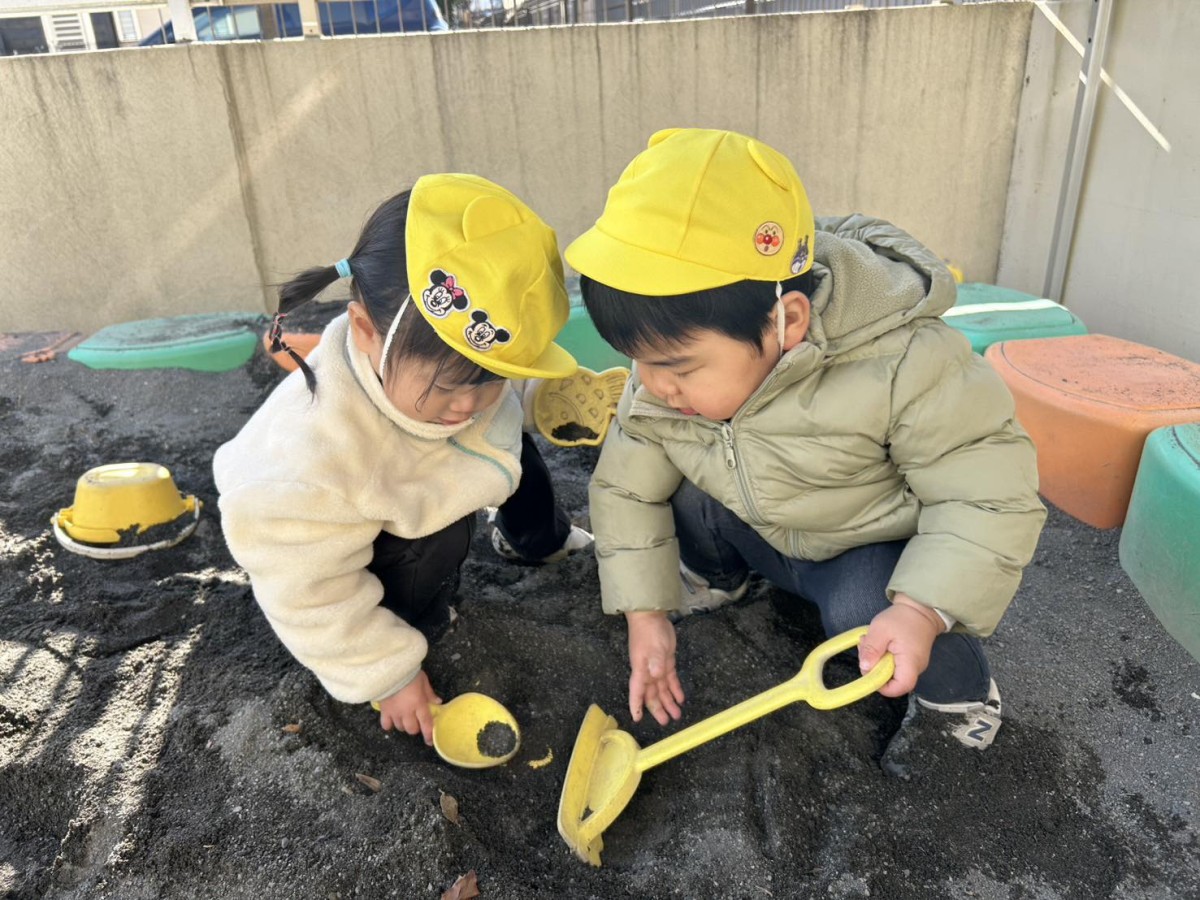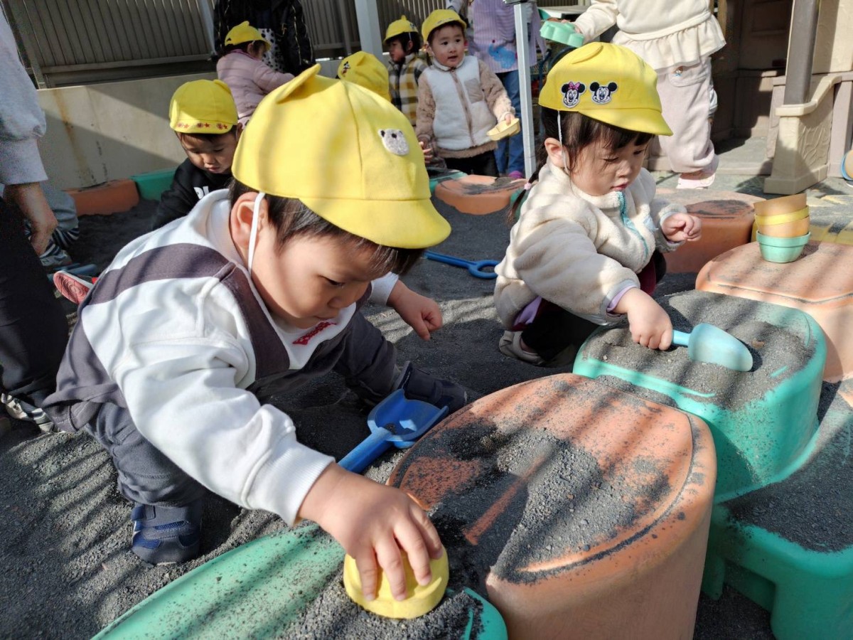 | 今日は園庭で遊びました。昨日の雨でお砂場の砂が固まりやすく湿っていたため、保育士と一緒に型抜きを楽しみました。綺麗に型が抜けると「もう一回!」と何度も繰り返しやってもらい楽しみました。 |