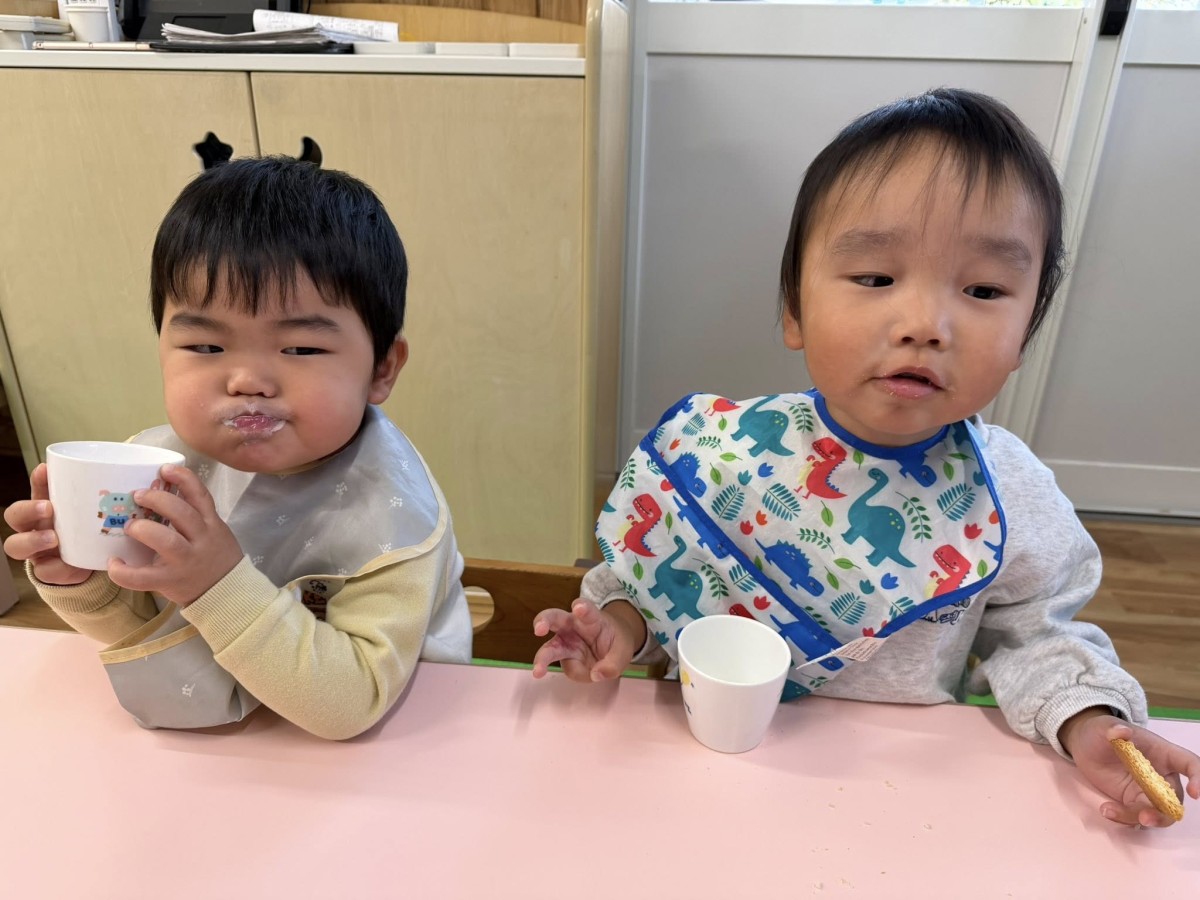 | 今日は朝の体操の後、廊下に並んでおやつのヤクルトを飲みました。美味しい!おかわり!と元気な声が聞こえてきます♪その後は園庭で遊びました。0歳児クラスの赤ちゃんがベビーカーでお散歩をしていると一緒に押してあげたり「可愛いねぇ」と頭を撫でてあげる姿が見られました。もうすっかりお兄さん、お姉さん気分の1歳さんでした(^^) |