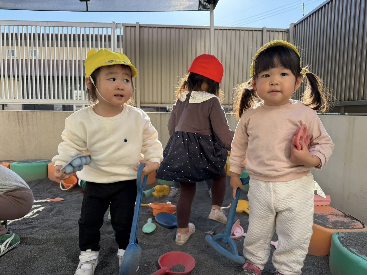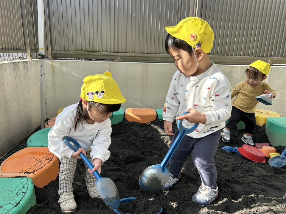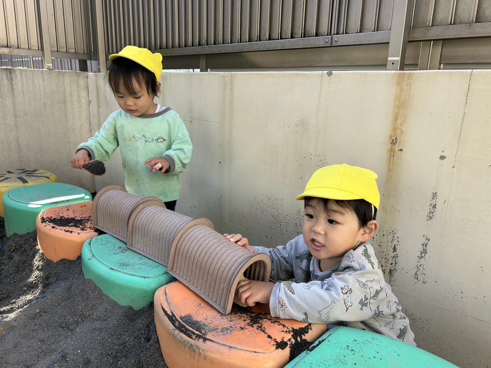 | 今日はお砂場やスモールハウス、追いかけっこをして遊びました。先生やお友達と「まてまてー!」と遊具の周りを元気いっぱい走っています。転んでも自分でパっパッ!と砂を払い、泣かずに立ち上がる姿に成長を感じられ嬉しく思います♪お部屋に戻っても「また遊ぼうね」とお友達同士で話す姿が見られました。 |