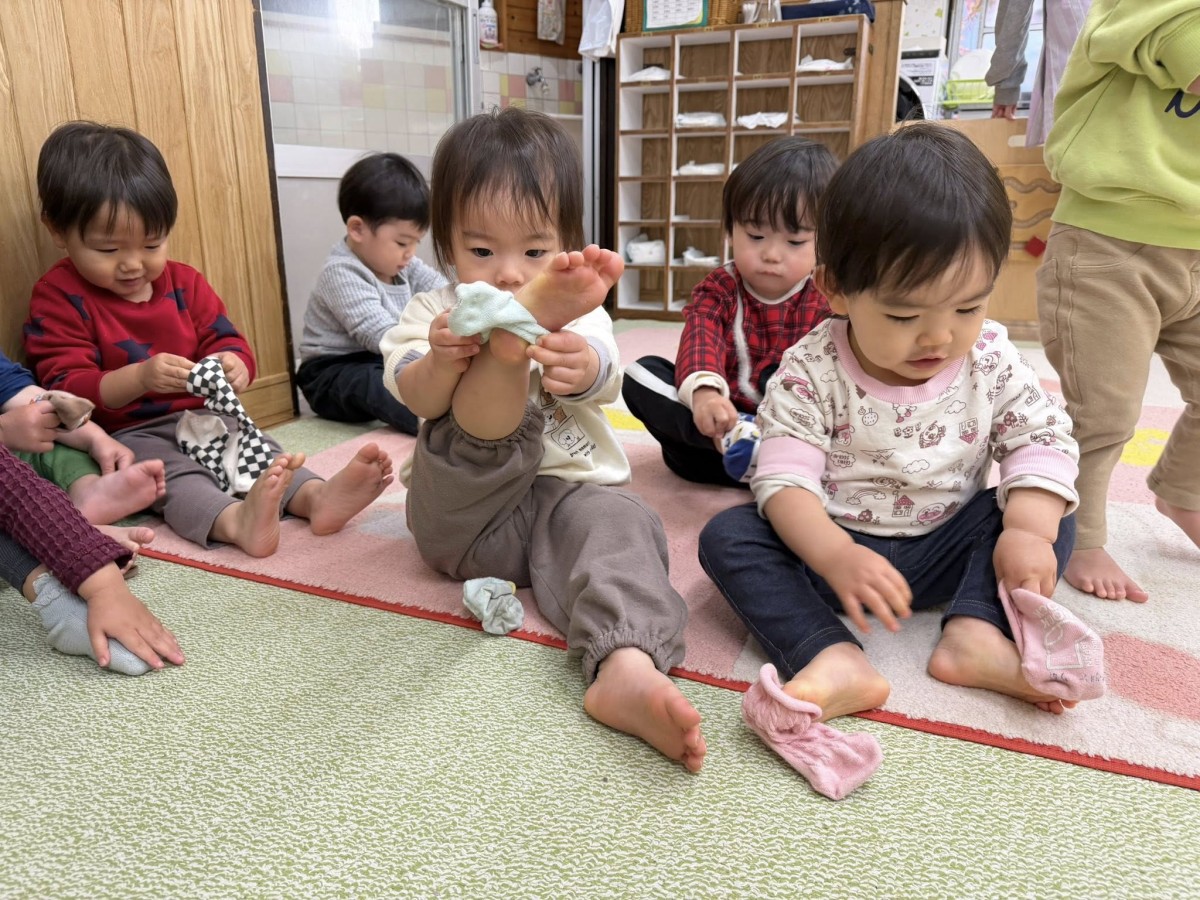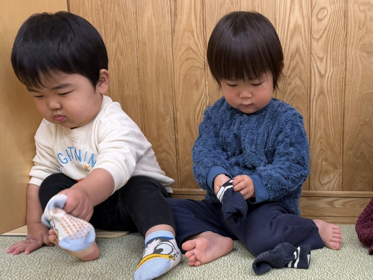 | 園庭で遊びました。スモールハウスに入る時に「ピンポーン」と言いながらドアを開けると「どちら様ですかー?」「どうぞ〜!」と答えてくれます♪お友達同士名前を呼んで笑い合う姿も見られました。最近は、午後のおやつの後に靴下を履く練習をしています。「出来ない〜!」と先生に助けを求めながらも「自分で!」と一生懸命頑張っています。まだまだ一人で履くのは難しいですが、少しずつ挑戦していこうと思います(^^) |