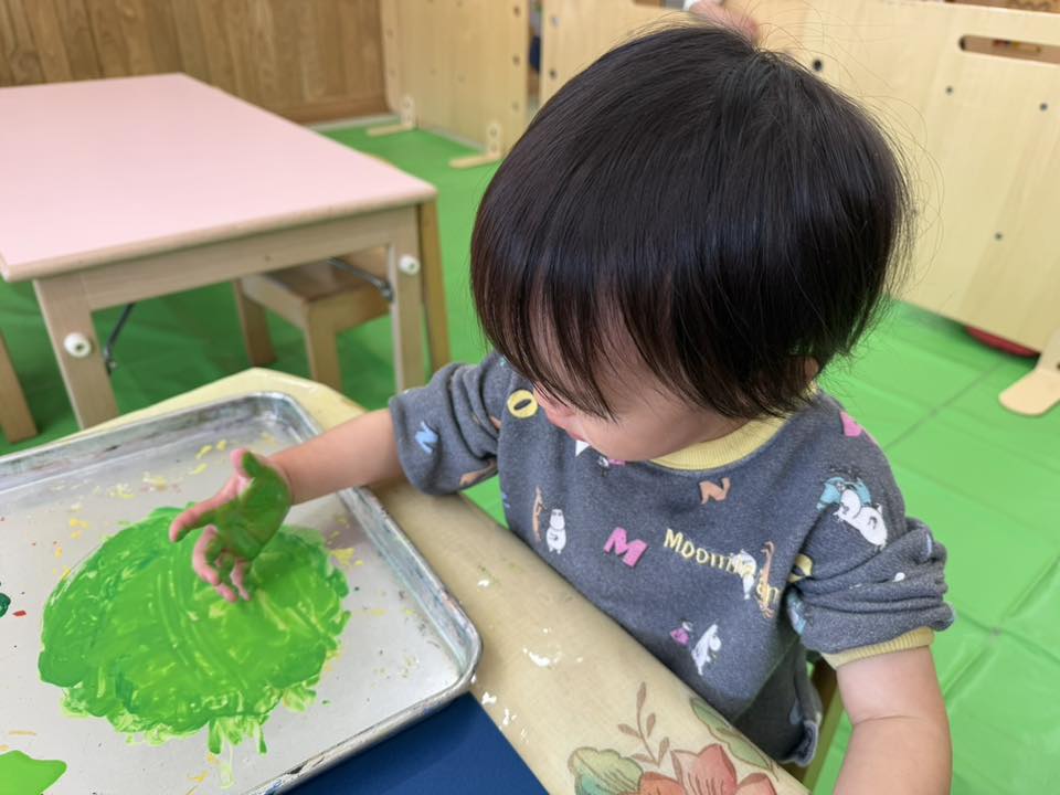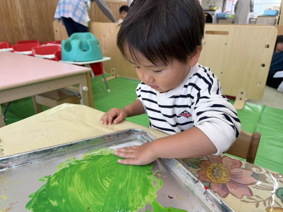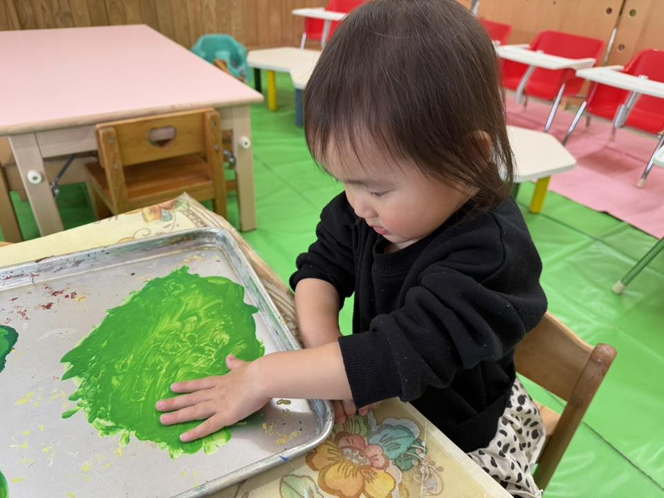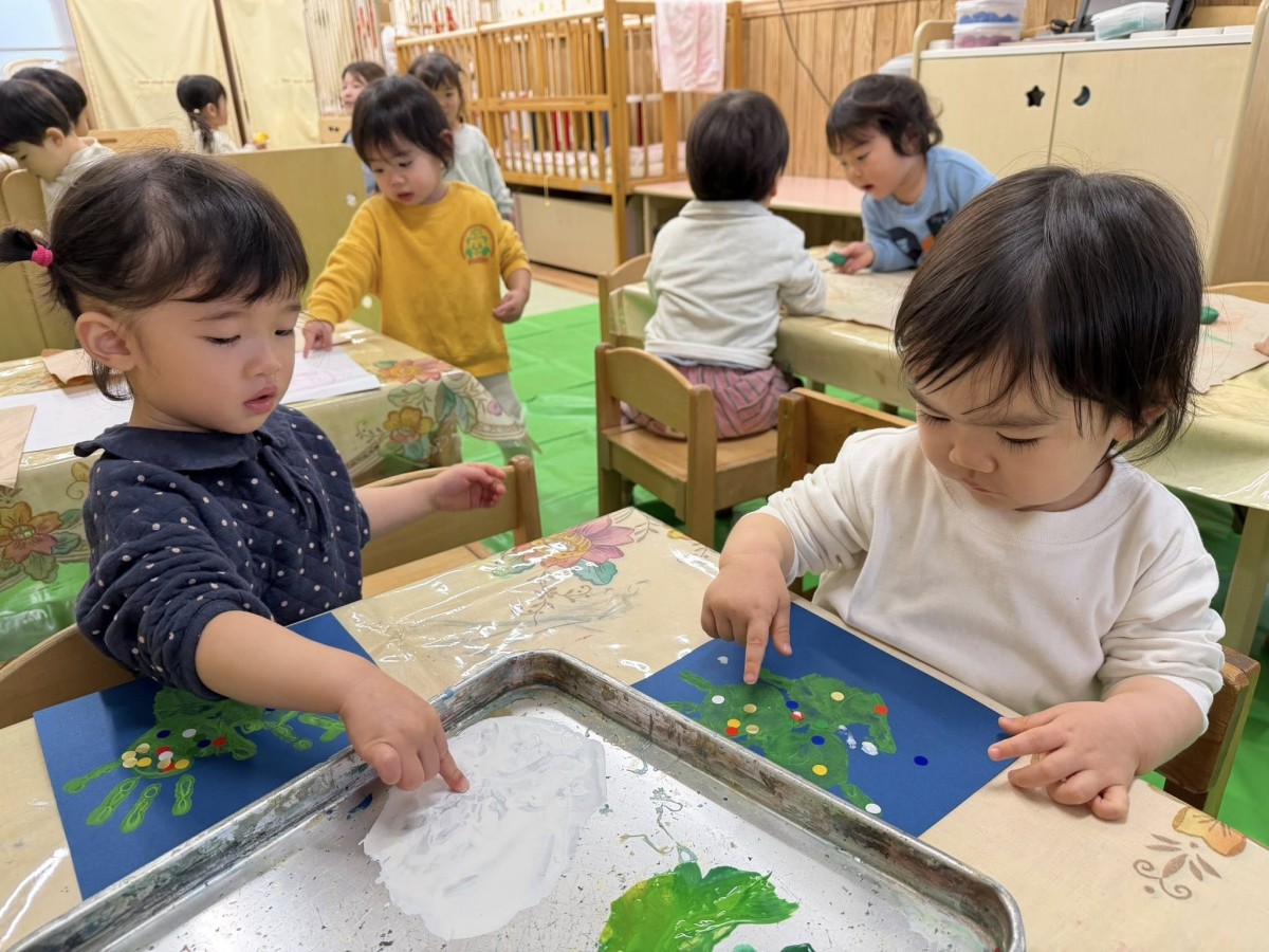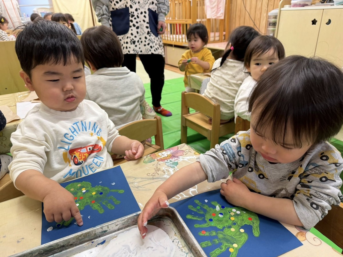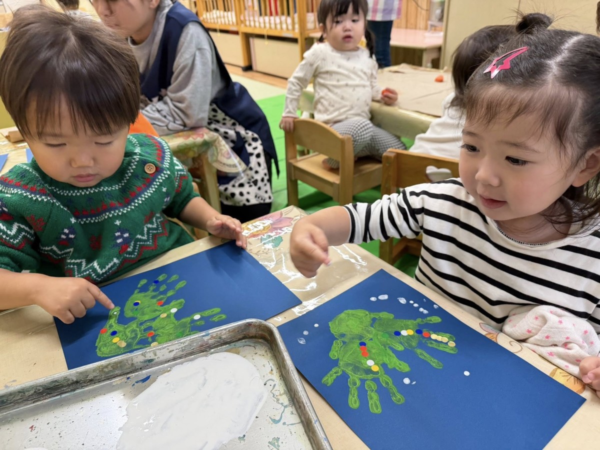 | 今日は室内で過ごしました。制作やお絵描き、車のおもちゃで遊びました。制作では手型のツリーのまわりに指スタンプで雪を降らせました。「こうやってやる?」「ちょんちょん!」とお友達や先生とお話しながら真剣な表情で取り組んでいました。 |
